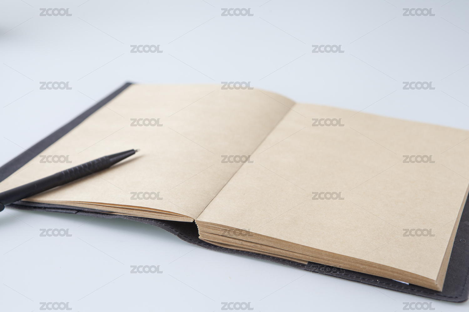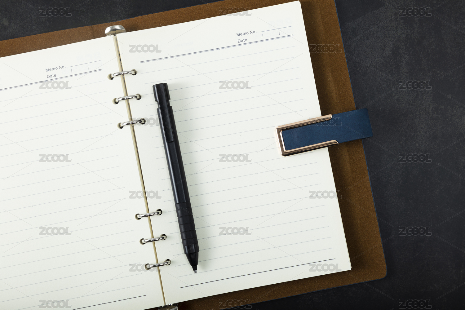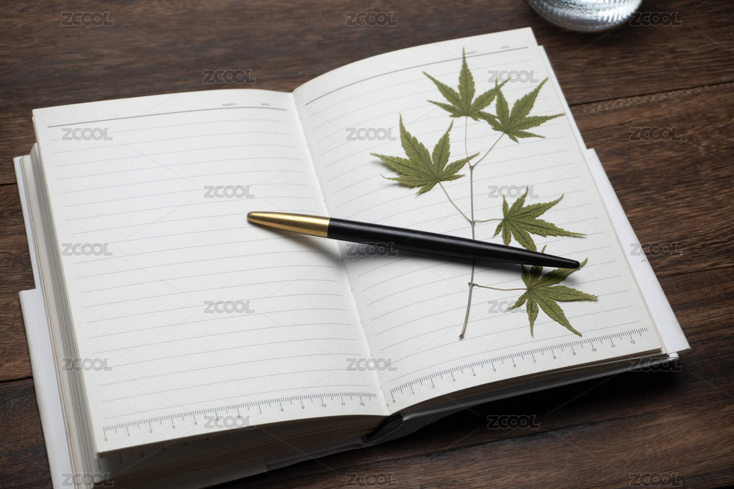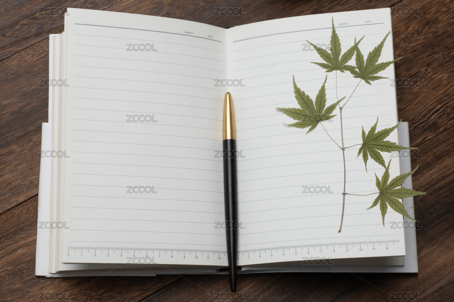 木桌上擺放著打開的日記本和一支筆一株綠植