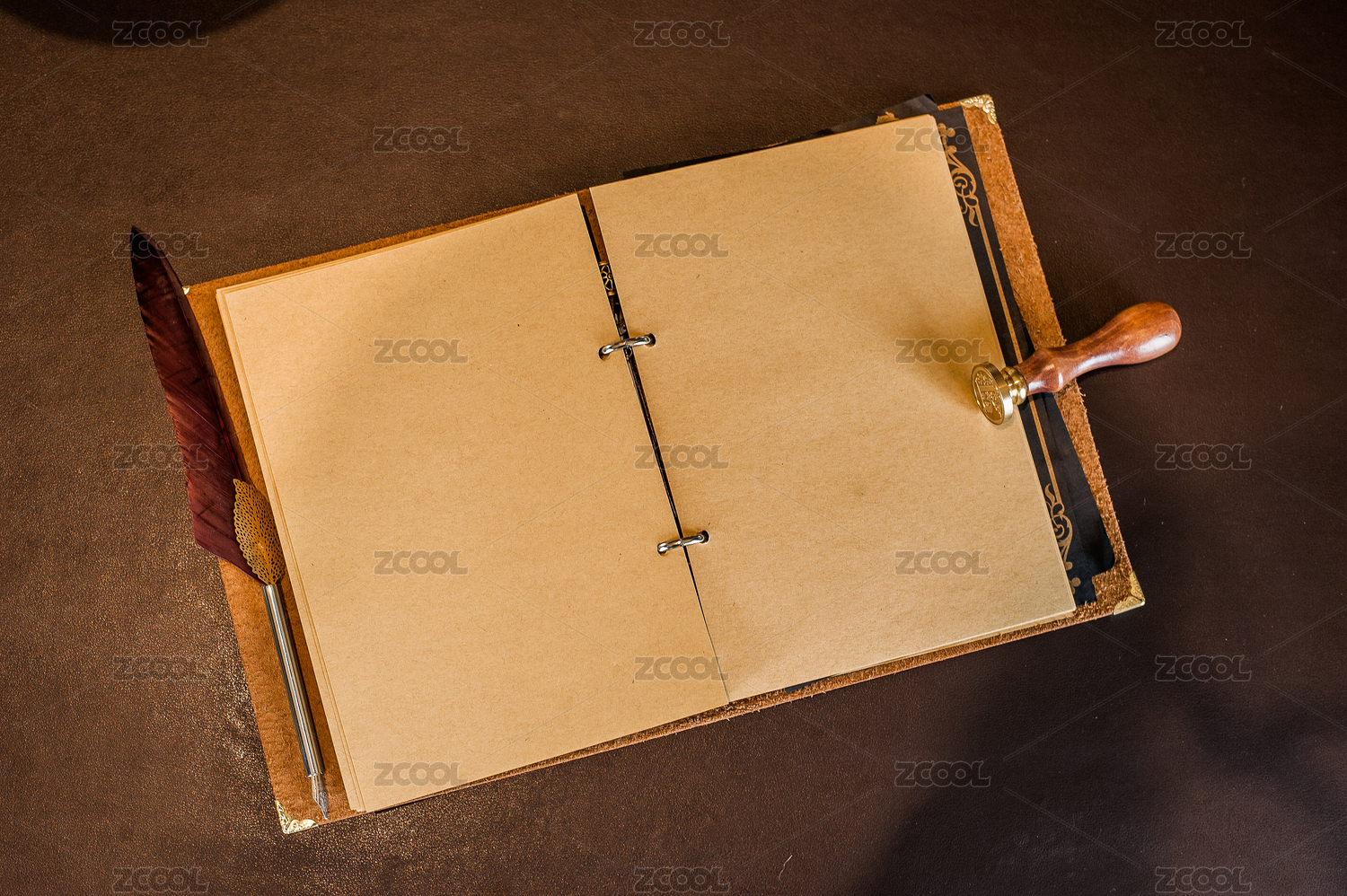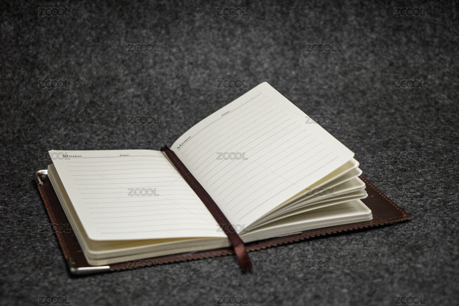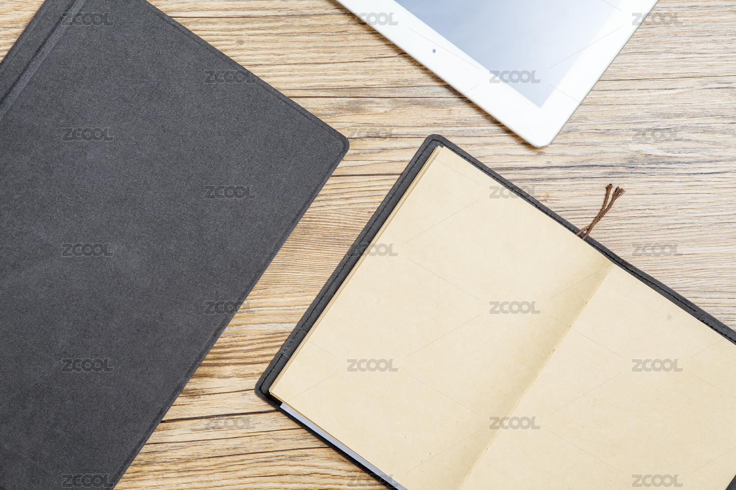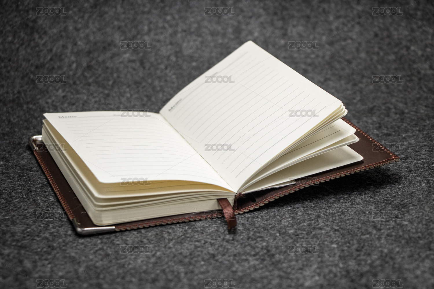木桌上擺放著打開的日記本和一支筆一株綠植