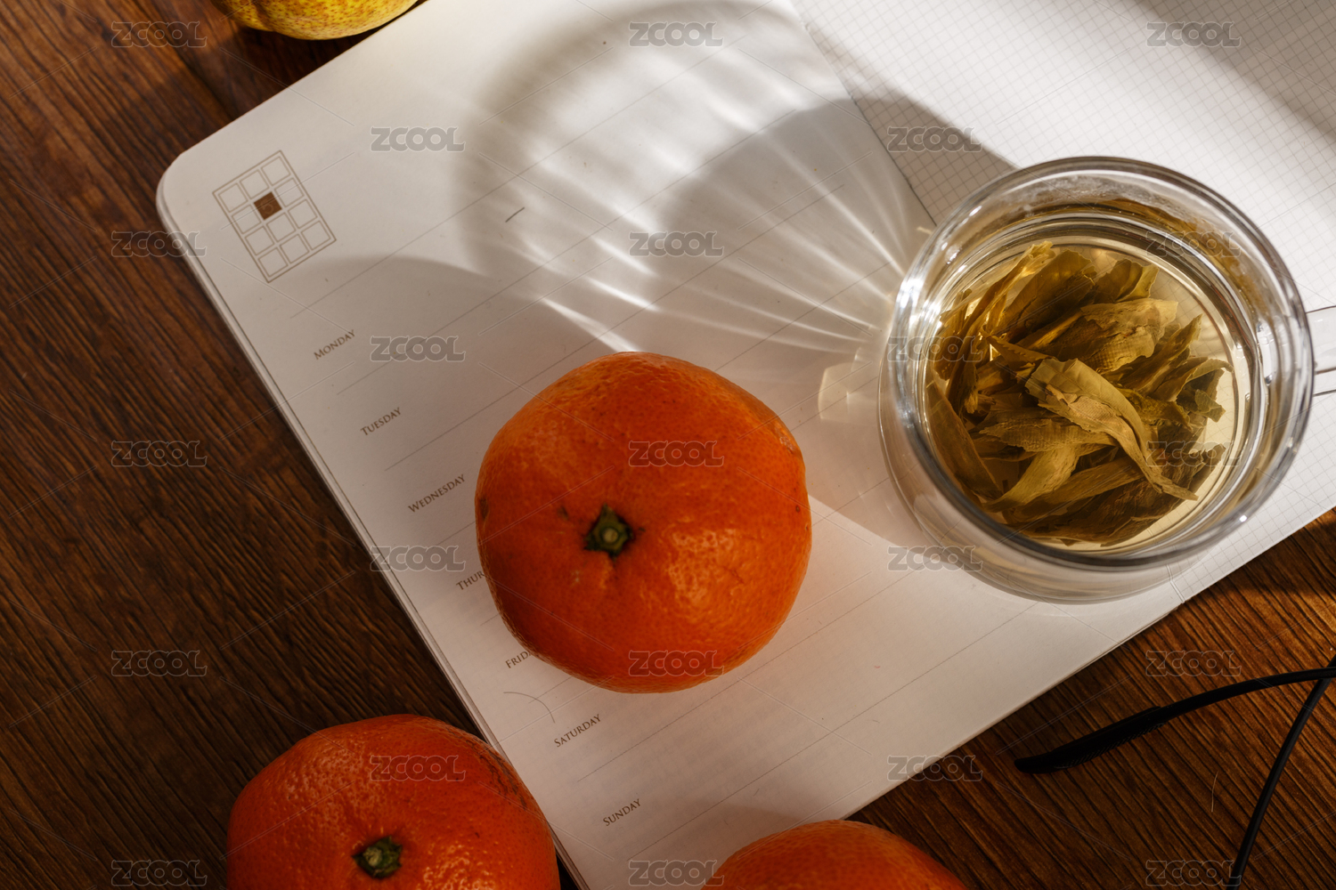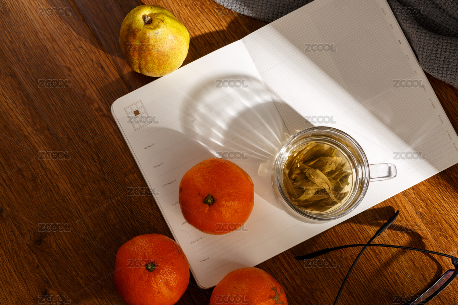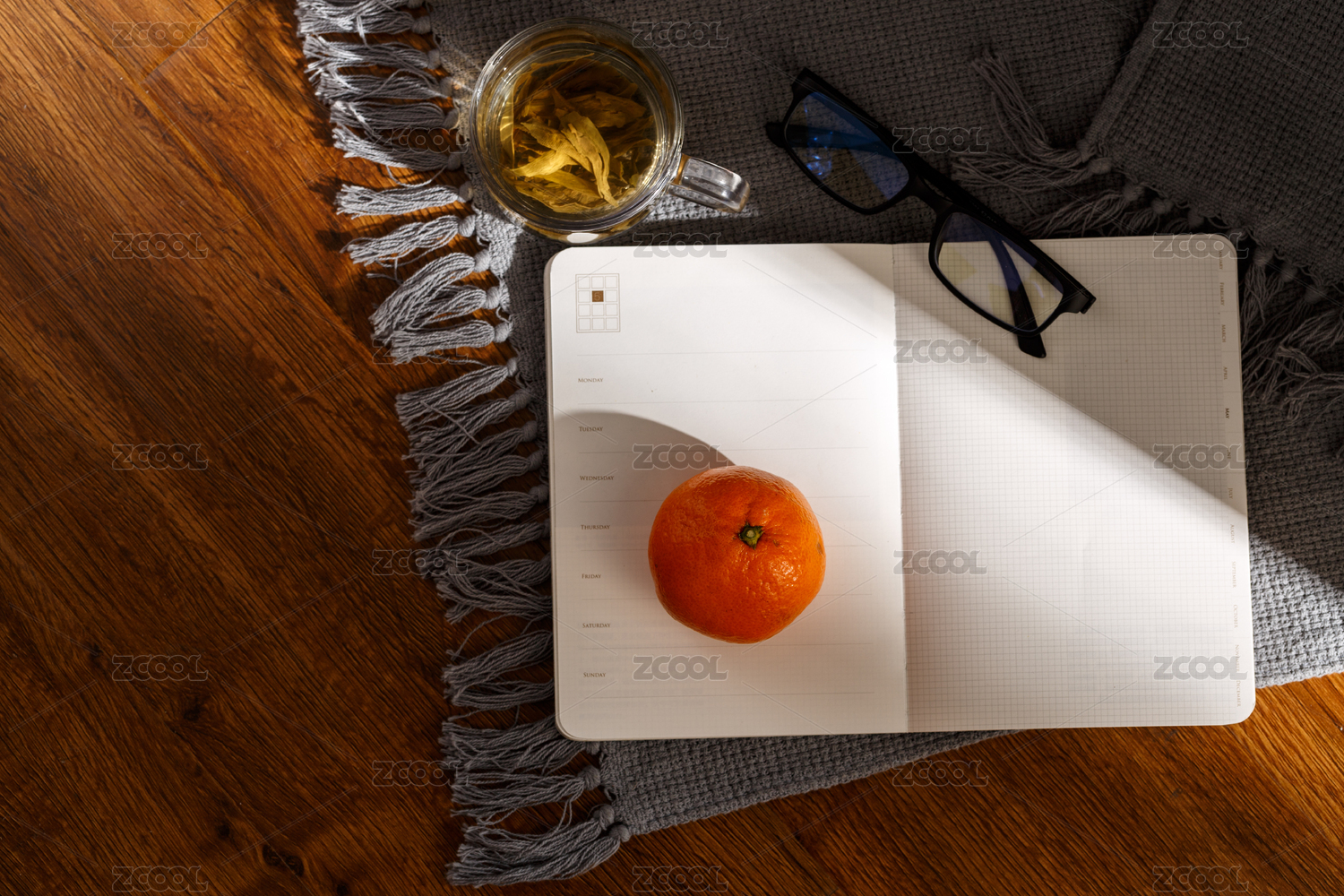 俯拍夕陽下陽臺地板上放著的日記本和水果