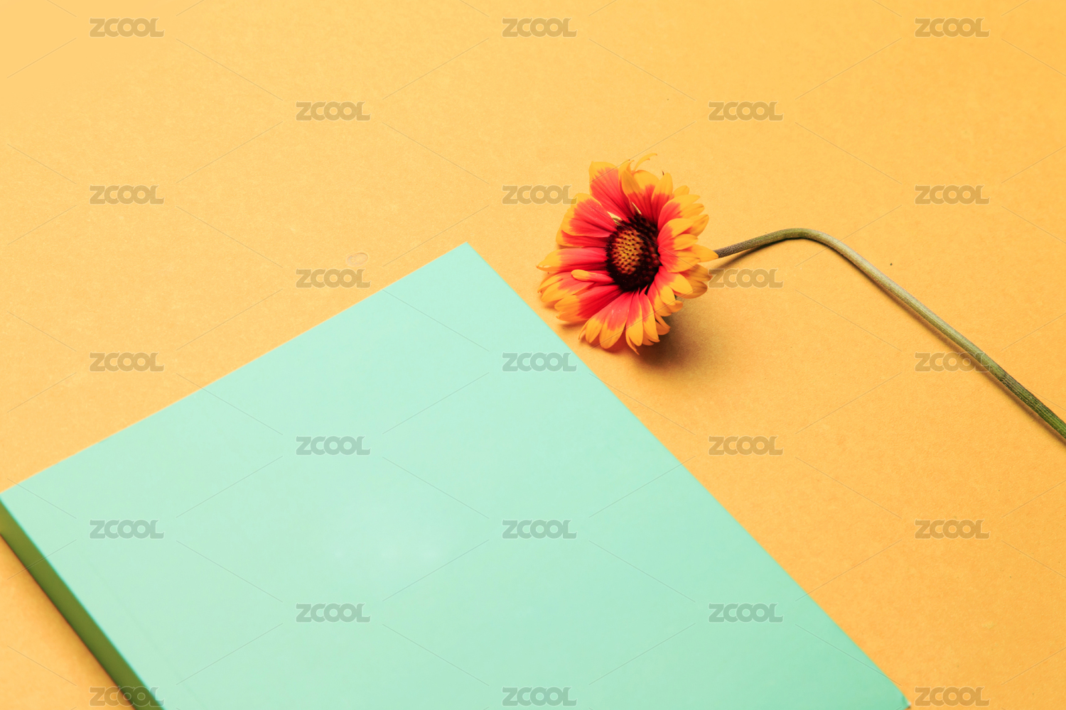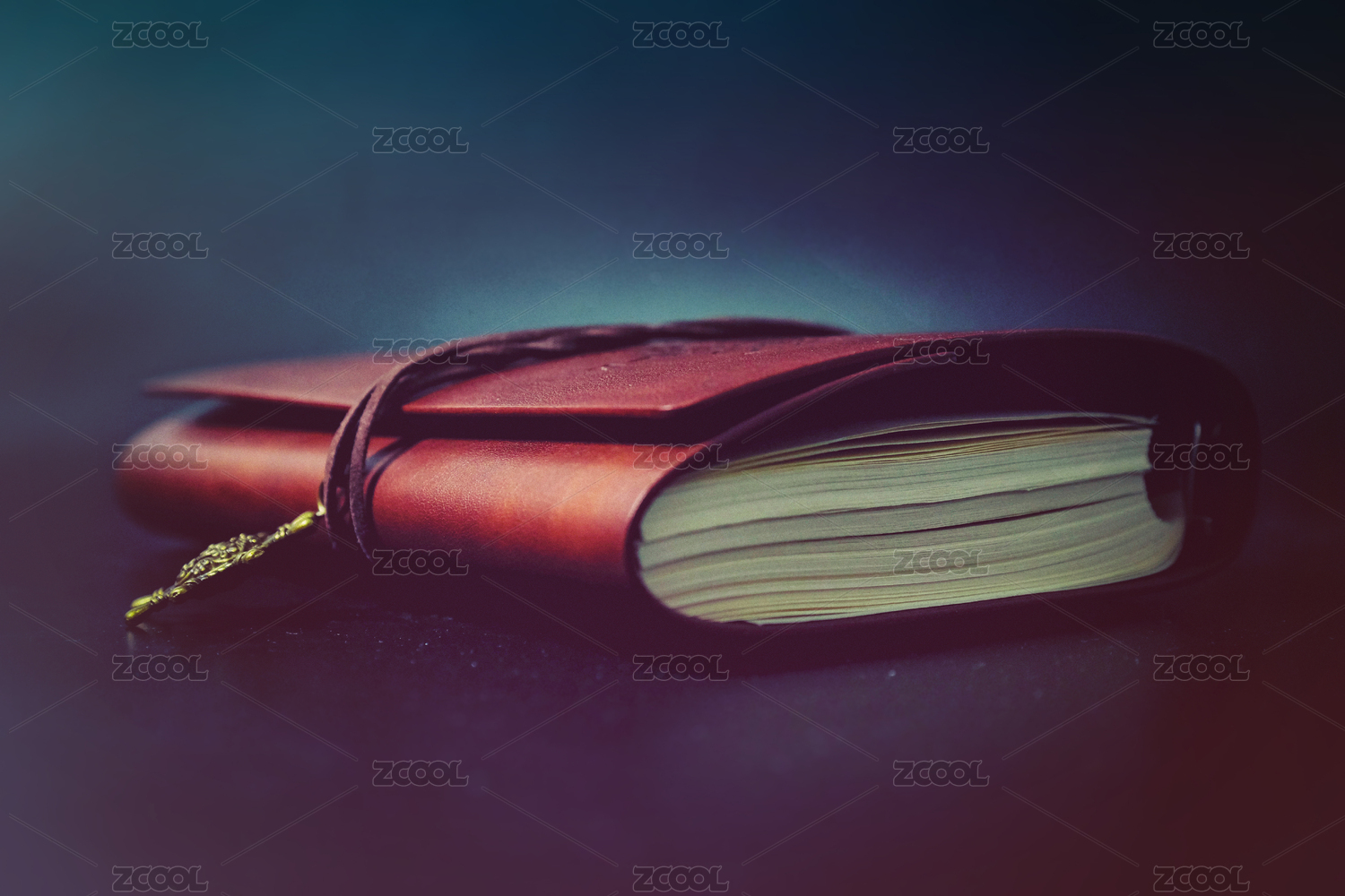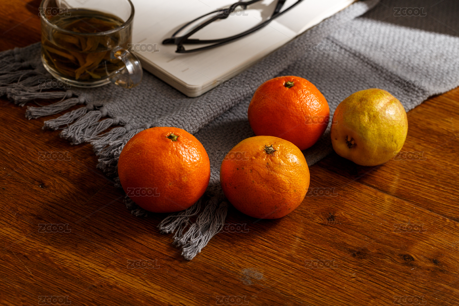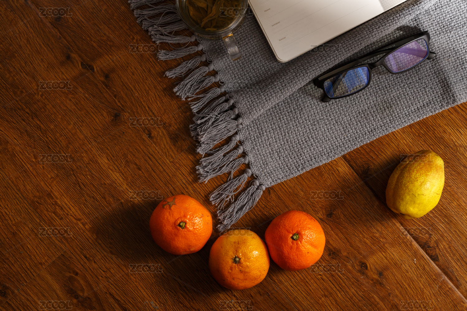 俯拍夕陽下陽臺地板上放著的日記本和水果