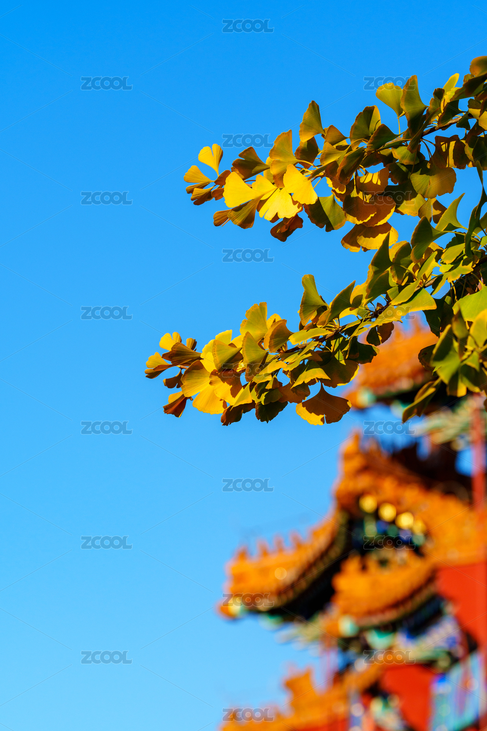 秋日藍(lán)天下漸漸變黃的銀杏樹葉與背景中的古