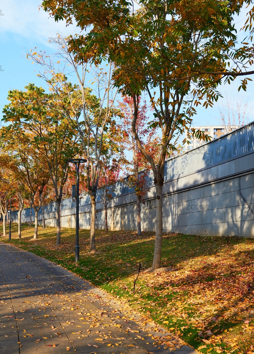 秋日公園步道兩側(cè)樹葉變黃變紅,落葉鋪散
