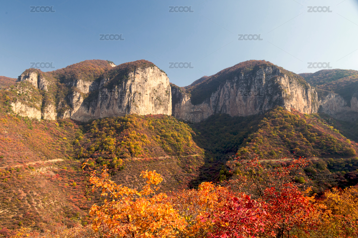 藍(lán)天白云下,山前秋季變黃的樹葉