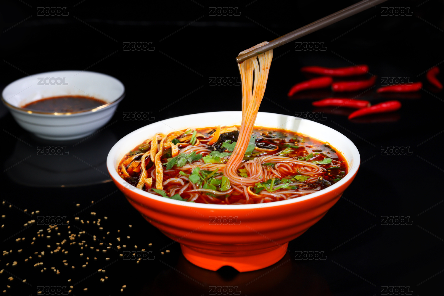 放在黑色背景上碗里用筷子挑起來的酸辣米線