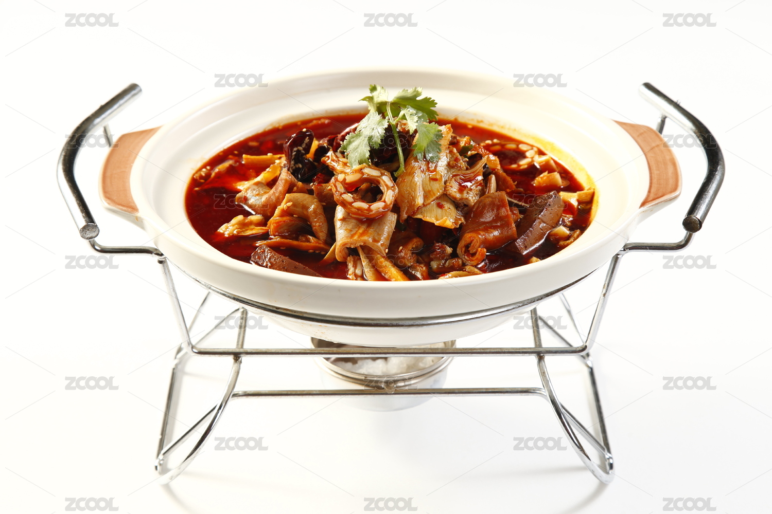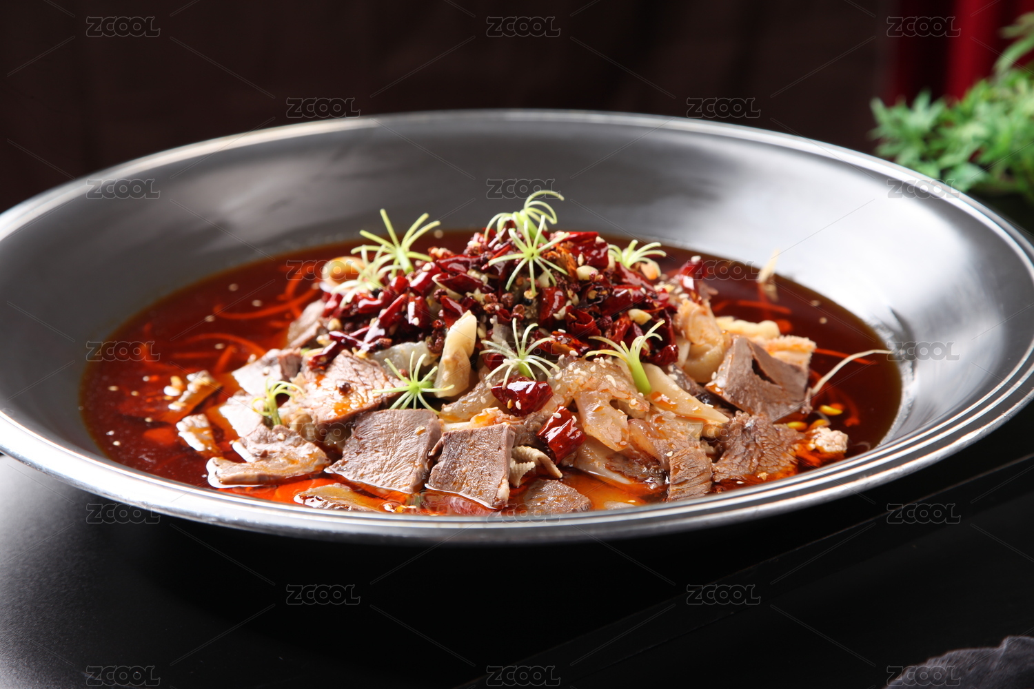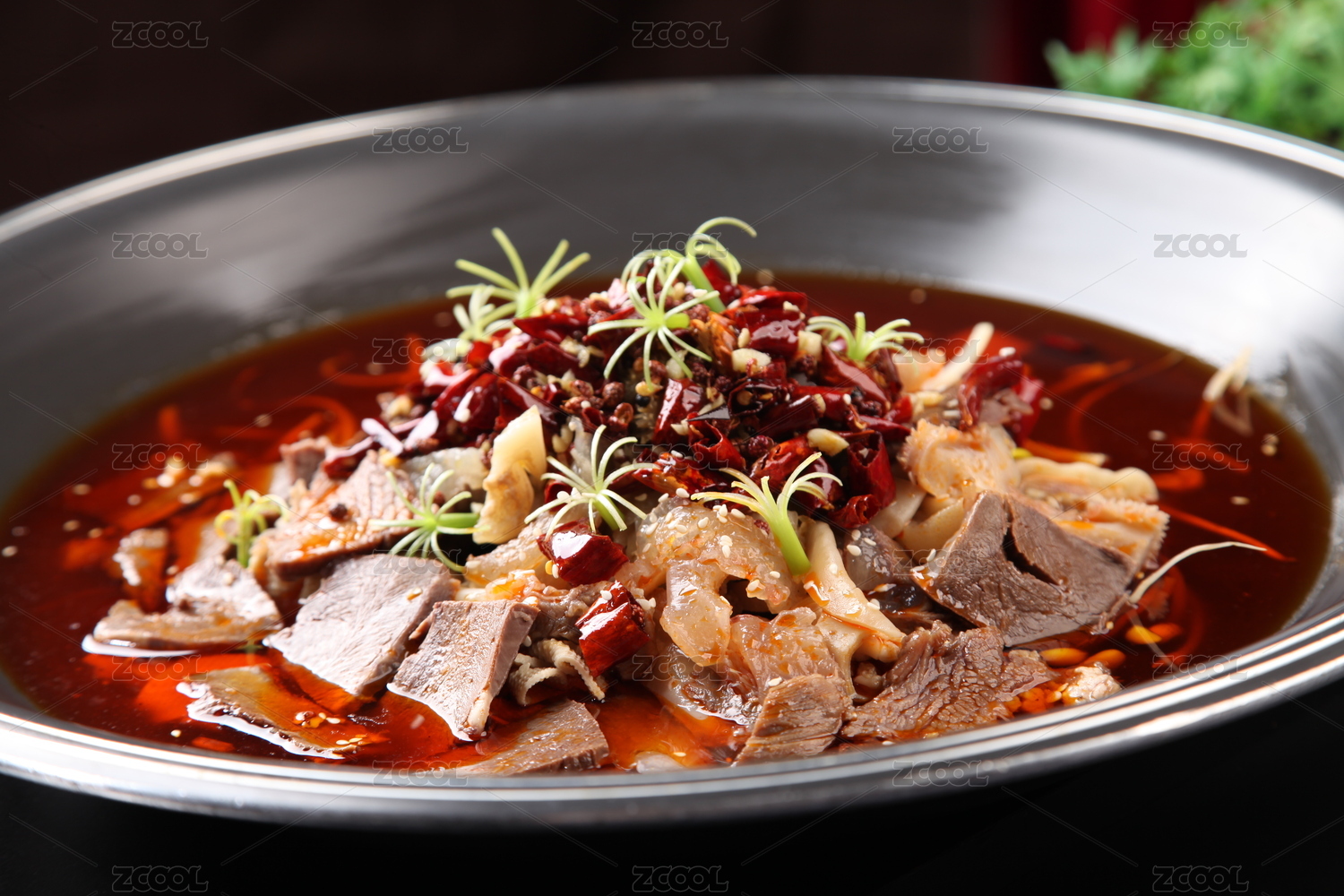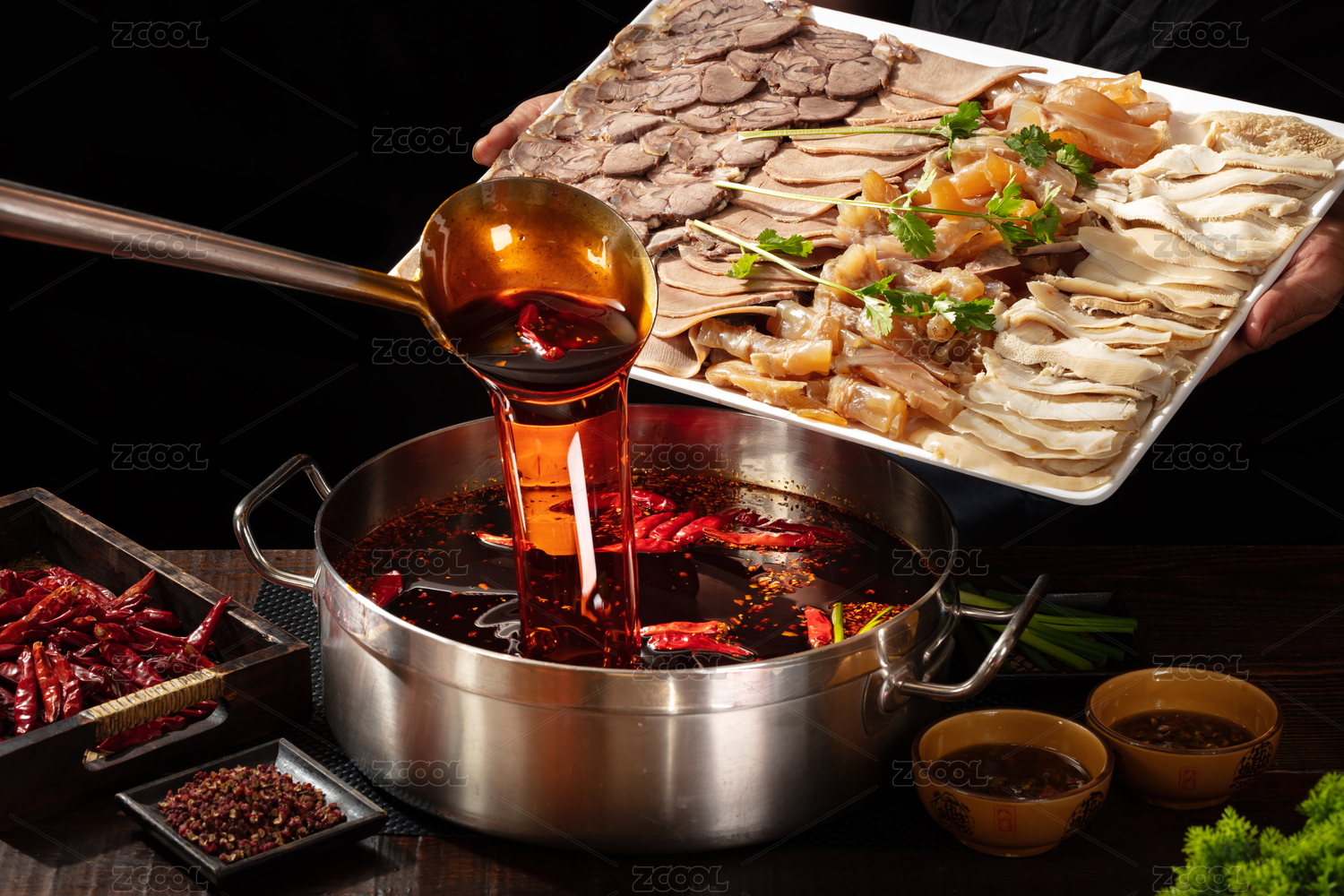 盤(pán)里切好的牛肉牛雜配麻辣火鍋湯底