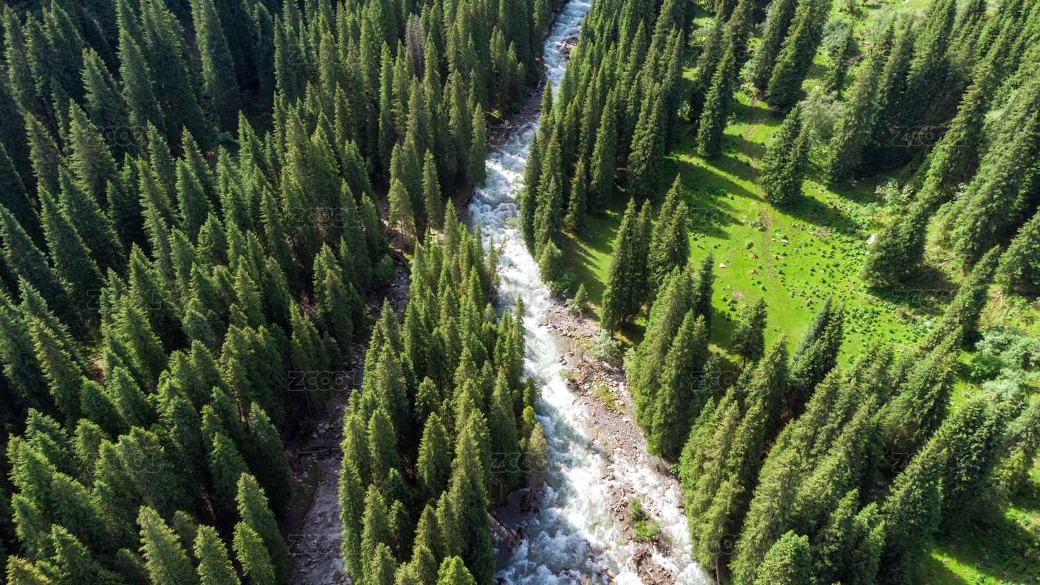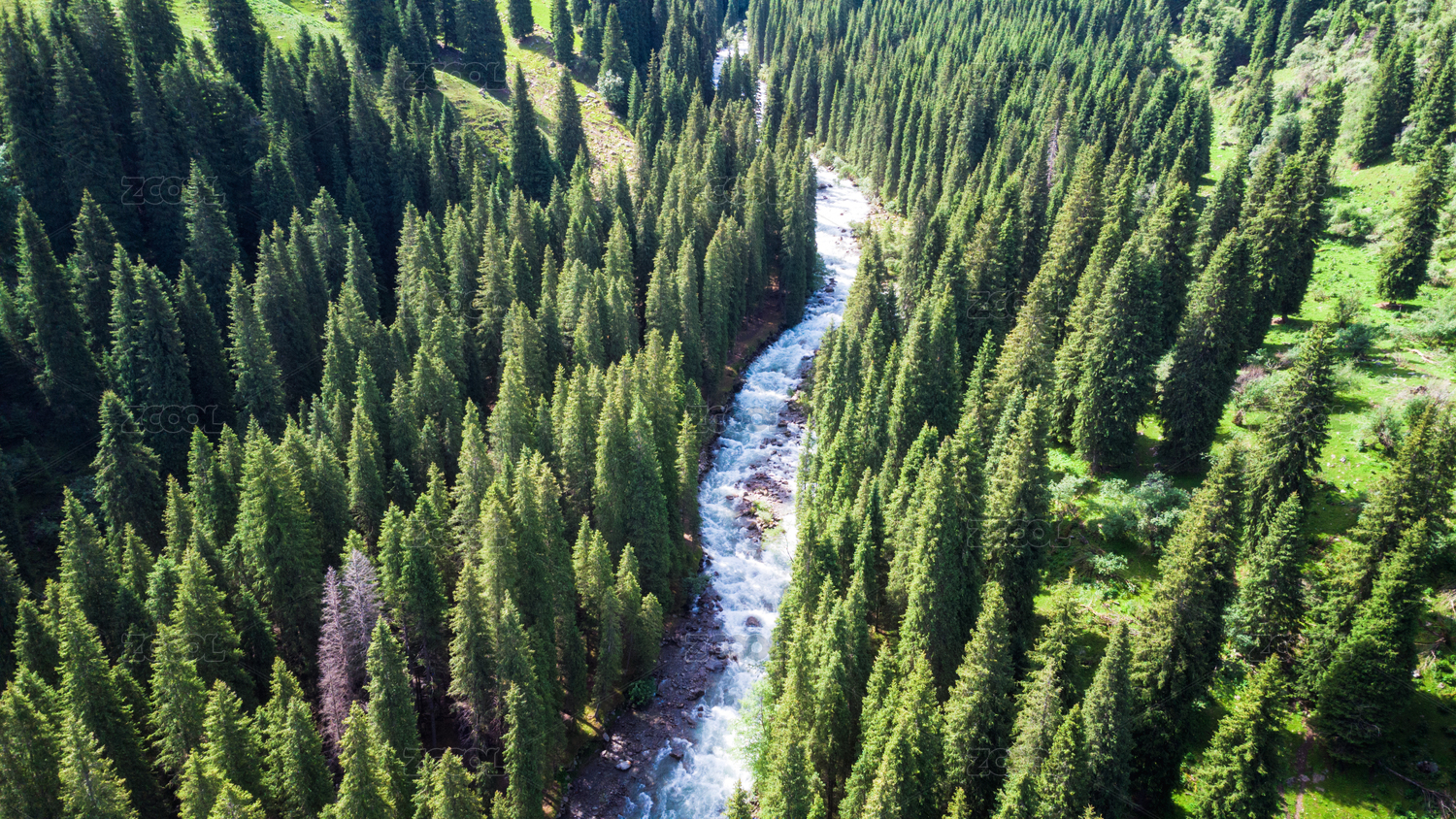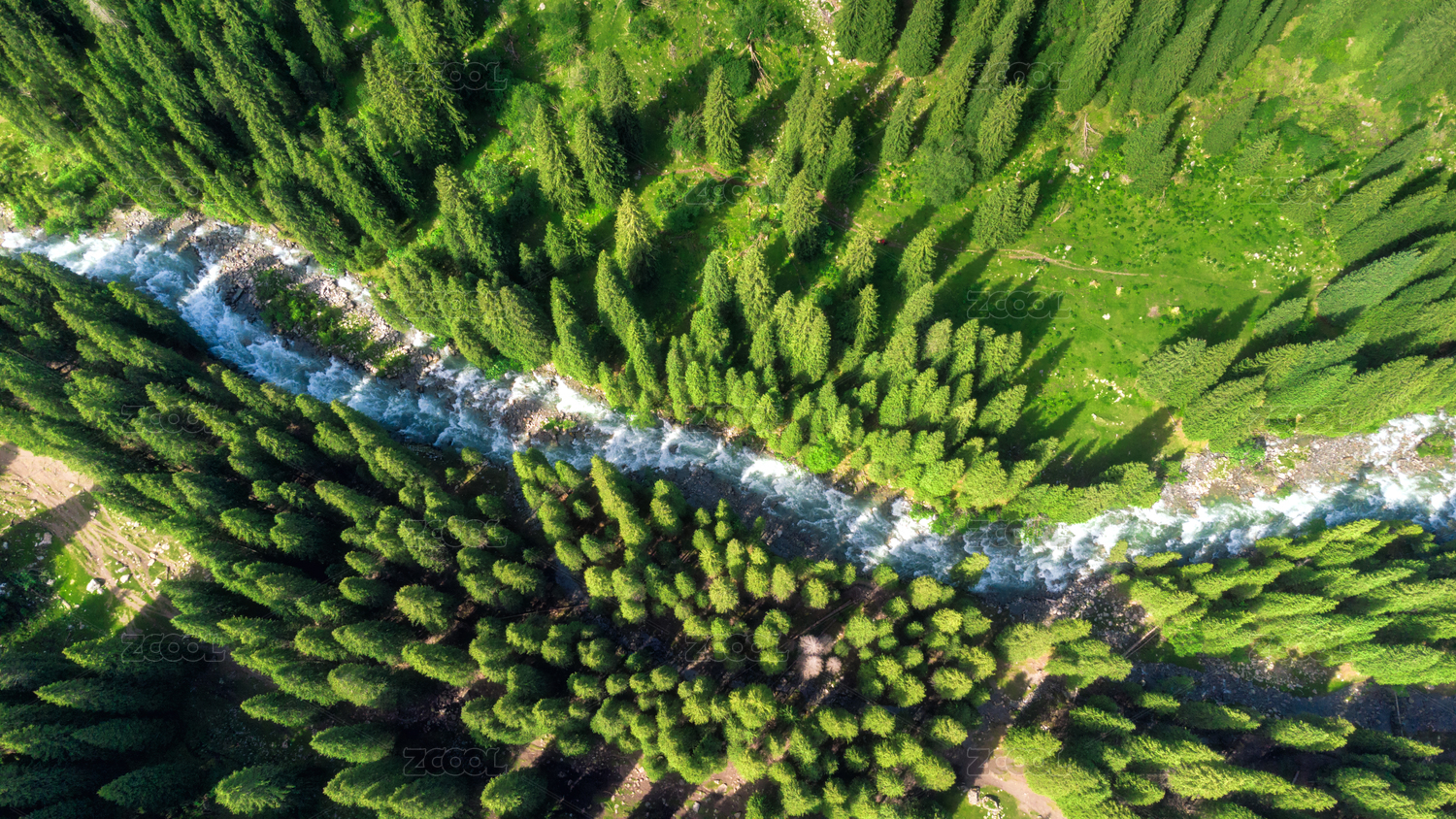 航拍森林里的溪流