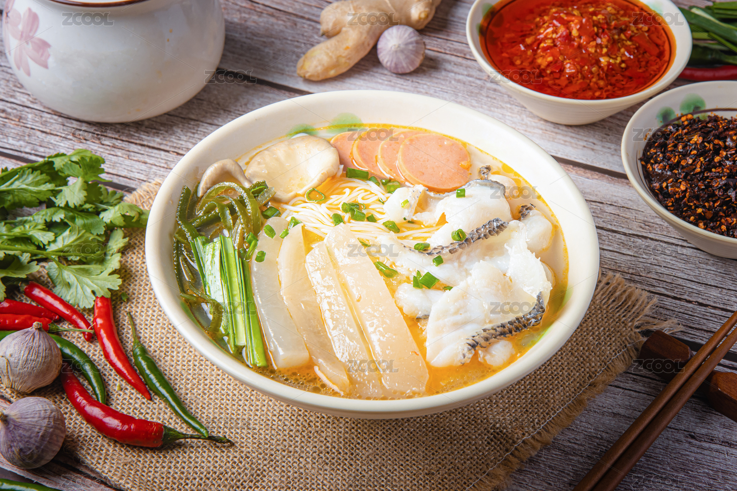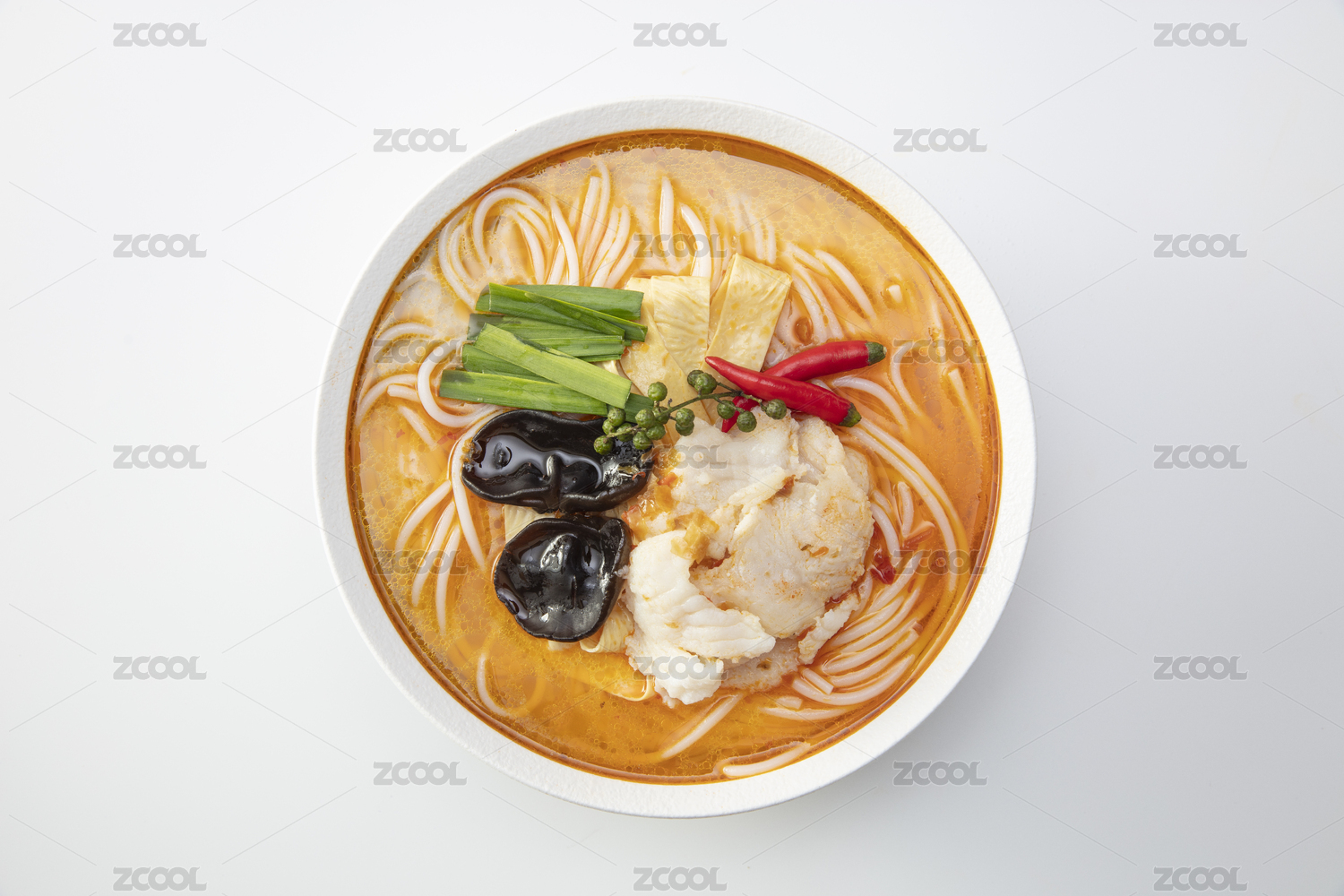 白色大碗里的藤椒泡椒酸菜魚片米線