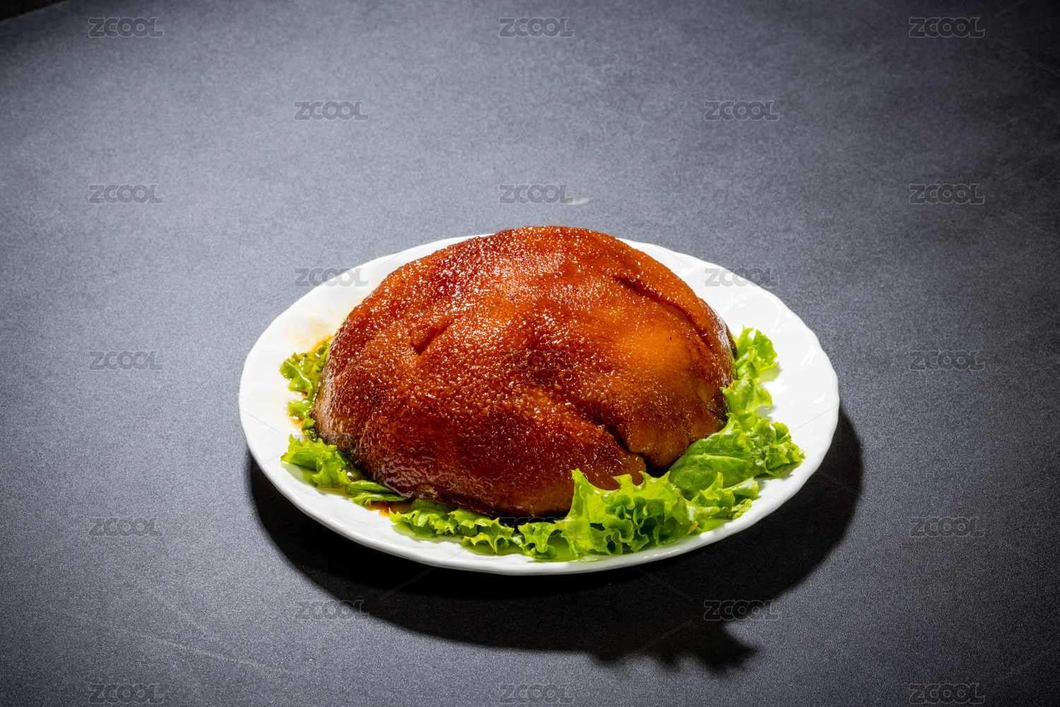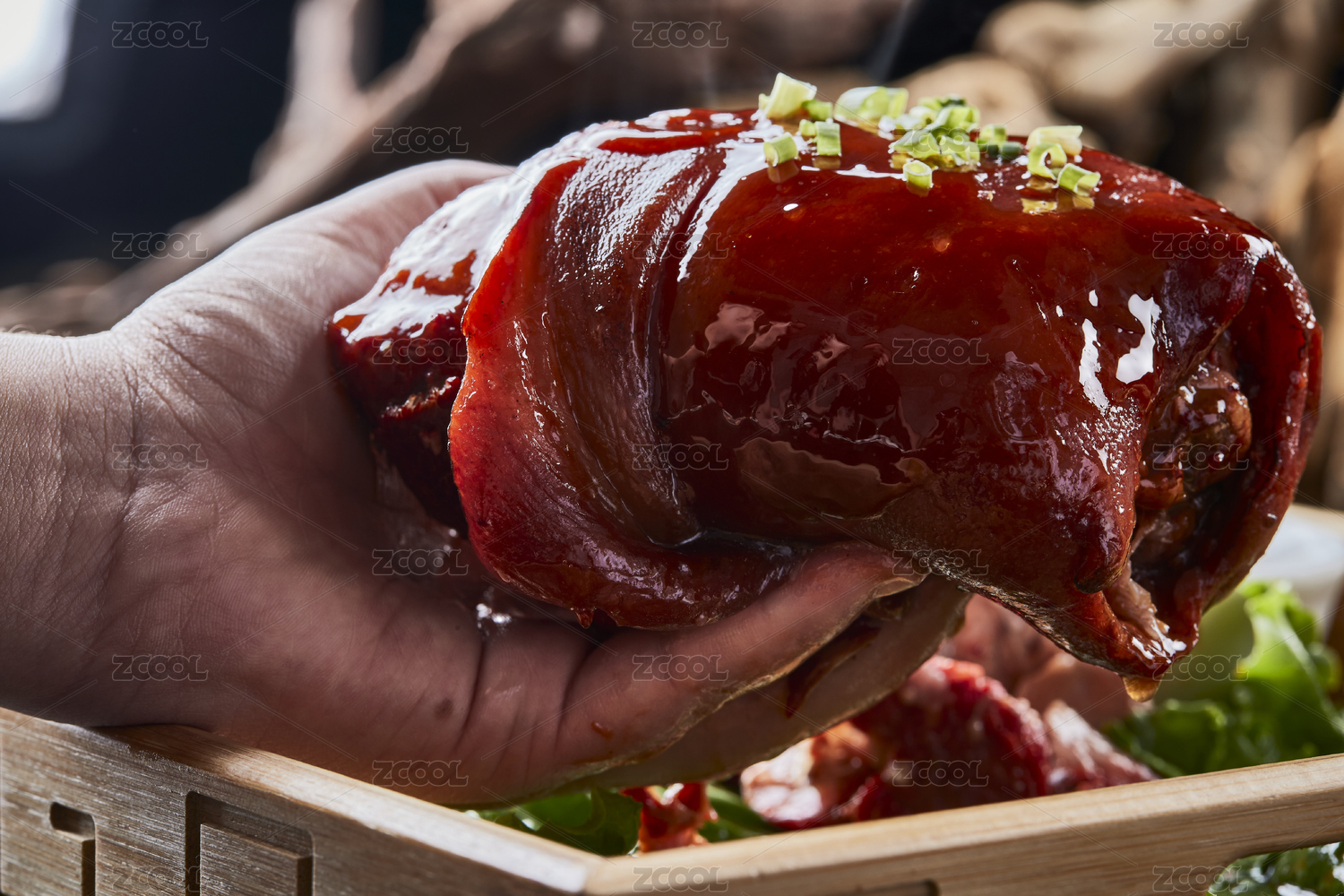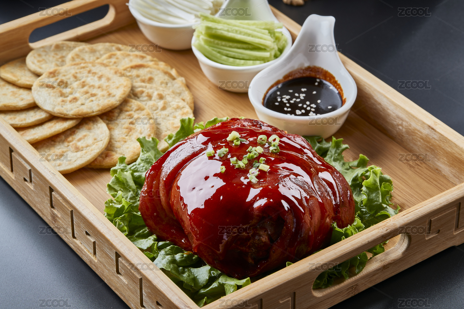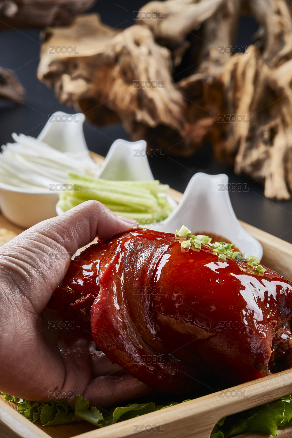 木質(zhì)餐具裝的雜糧餅時蔬配紅燒肘子