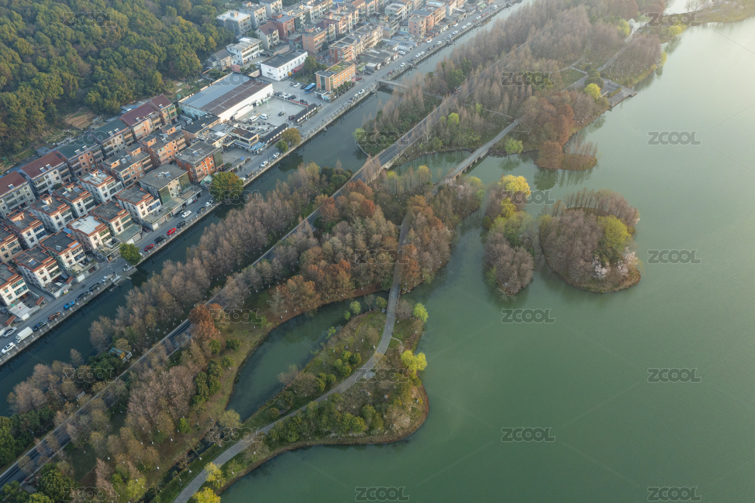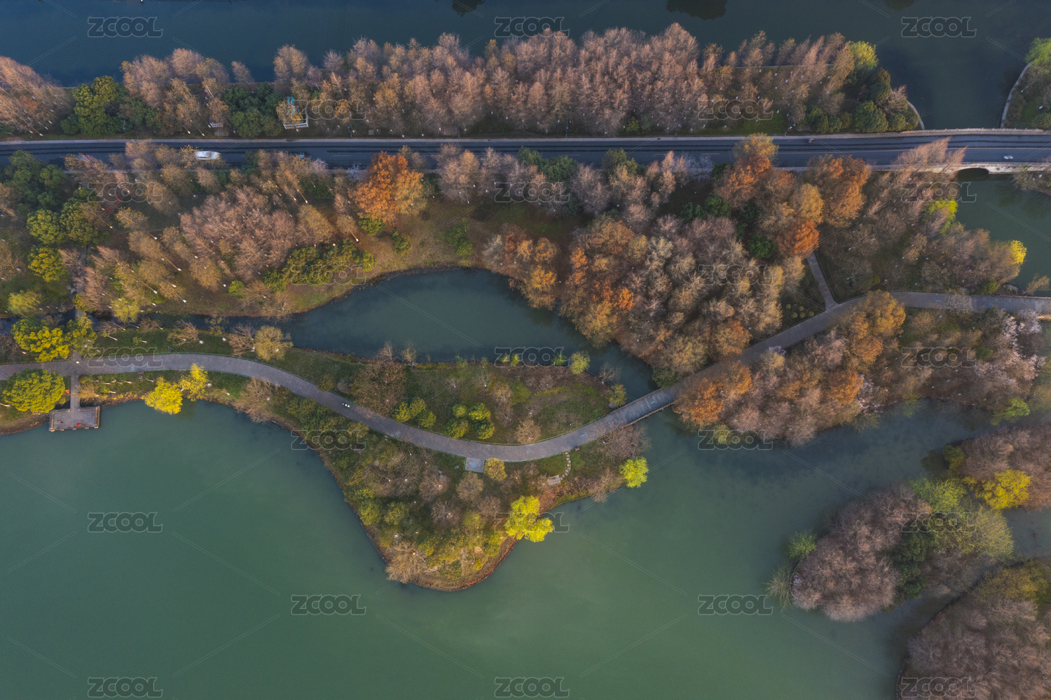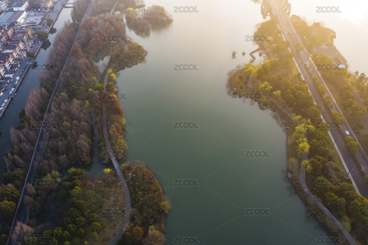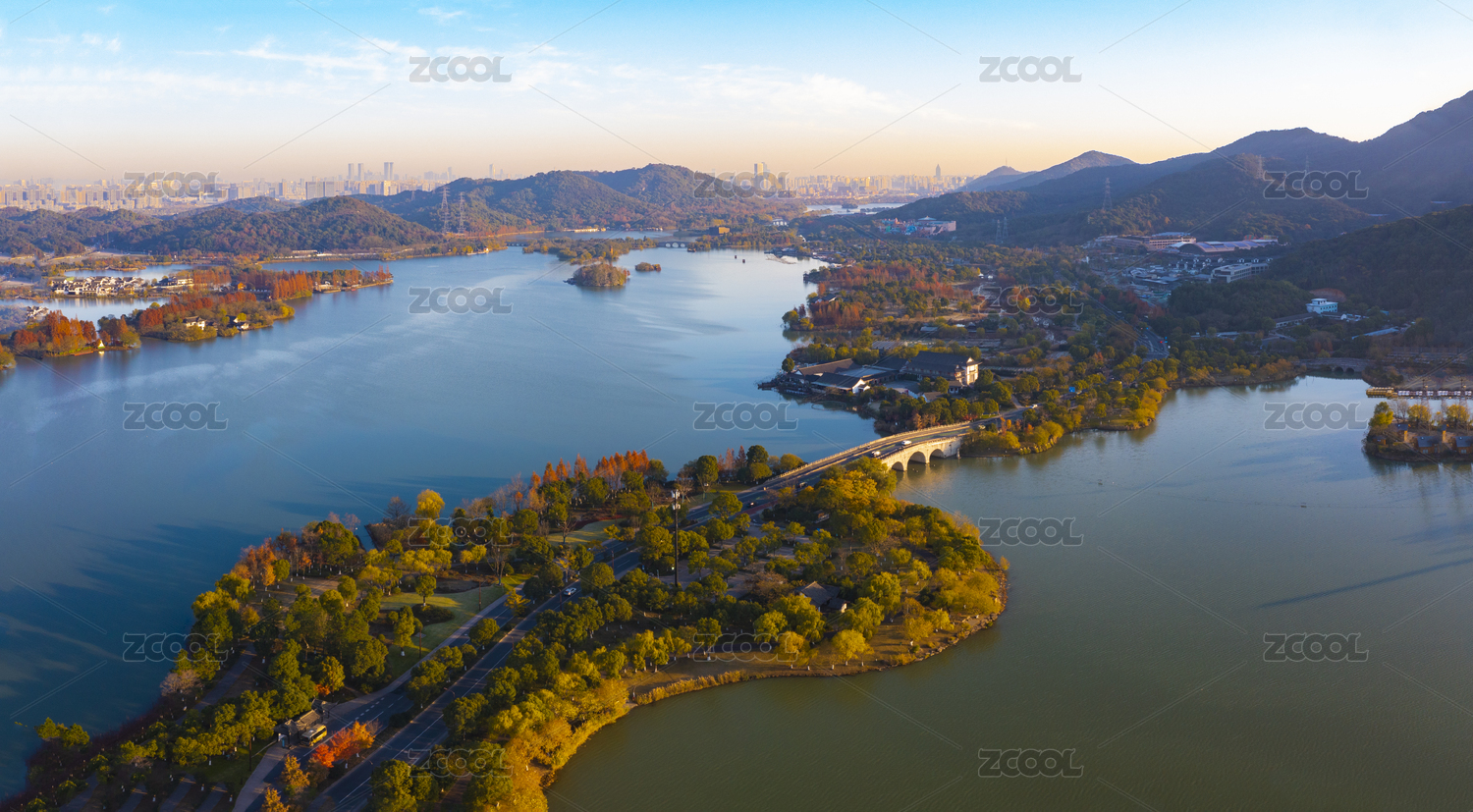 浙江省杭州市湘湖景區(qū)秋色晨曦航拍