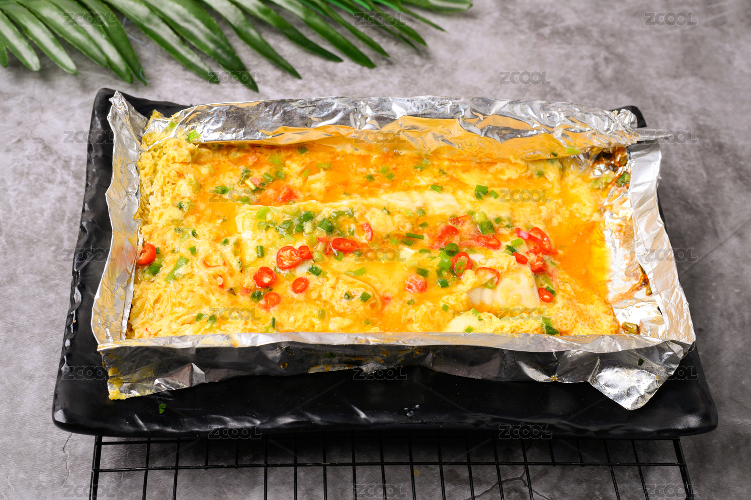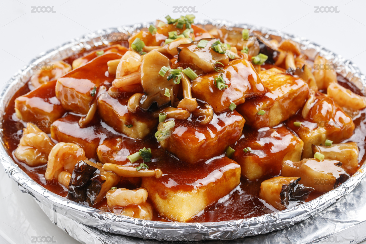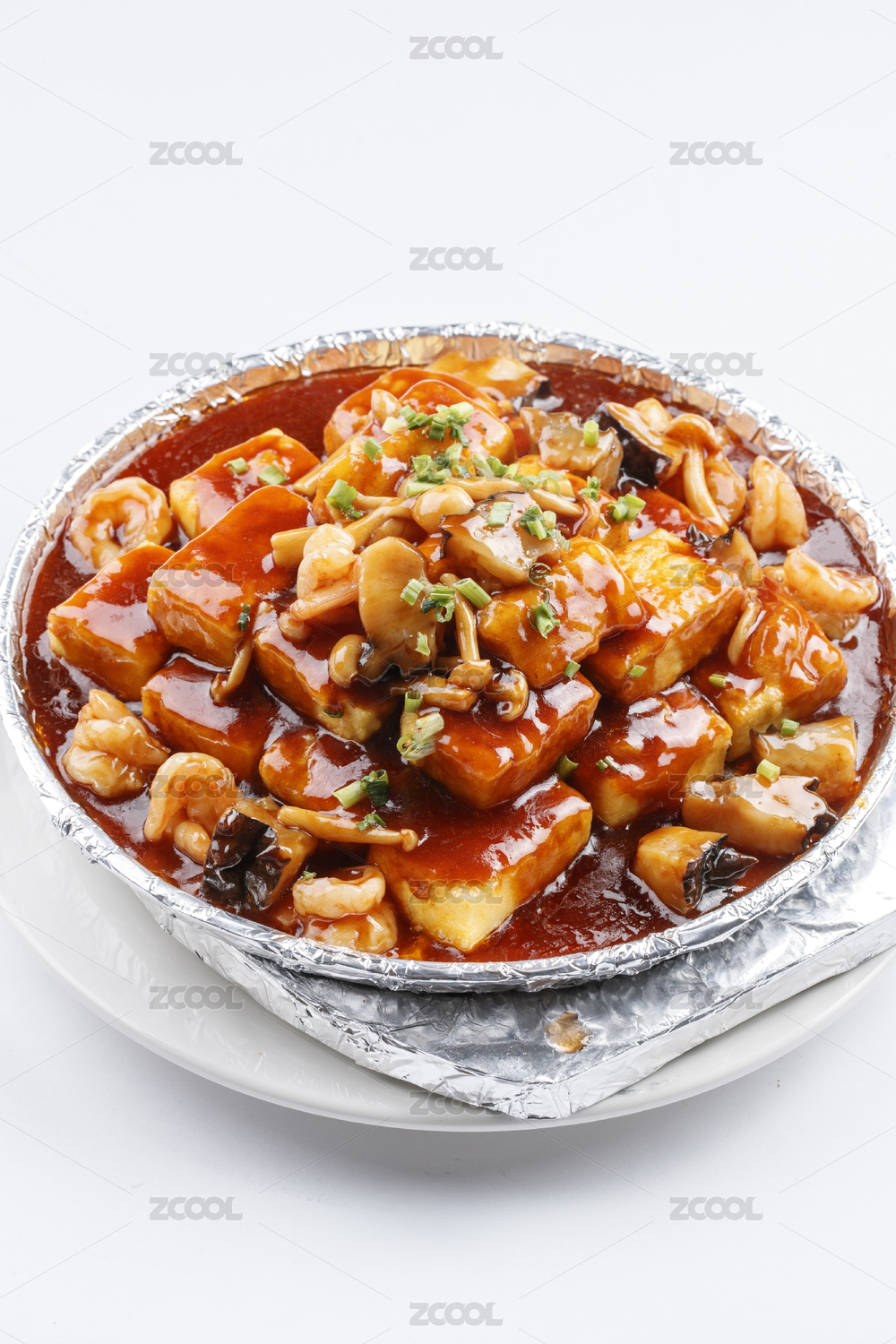 錫紙鐵盤裝的鐵板蝦仁釀豆腐