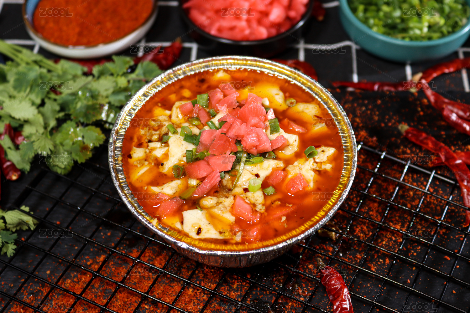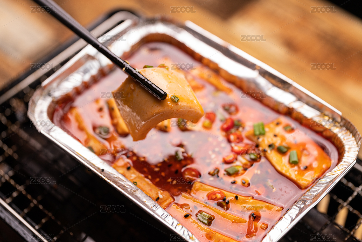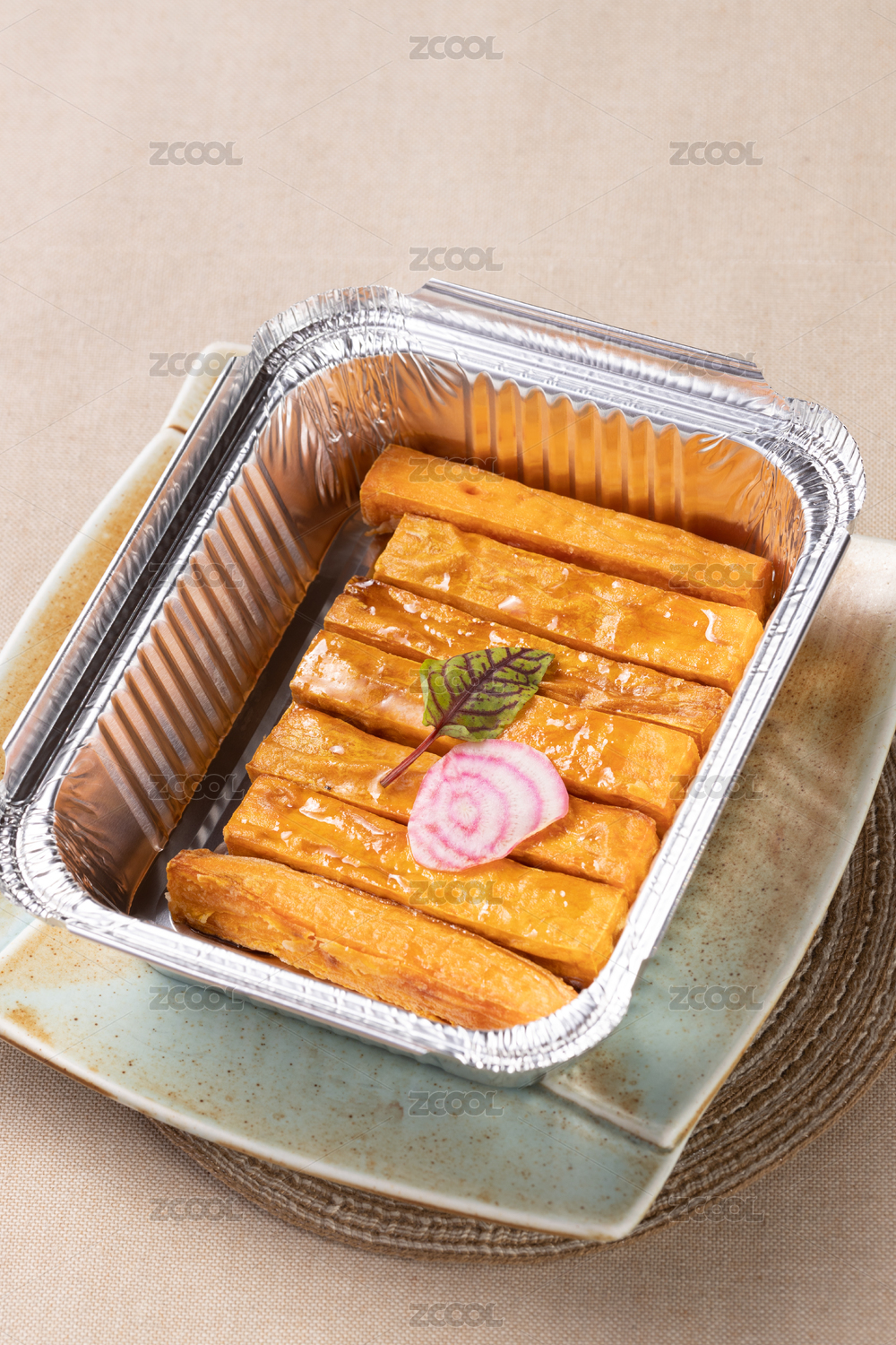 自助餐廳里美味的烤豆腐盛放在圓形錫紙碗內(nèi)