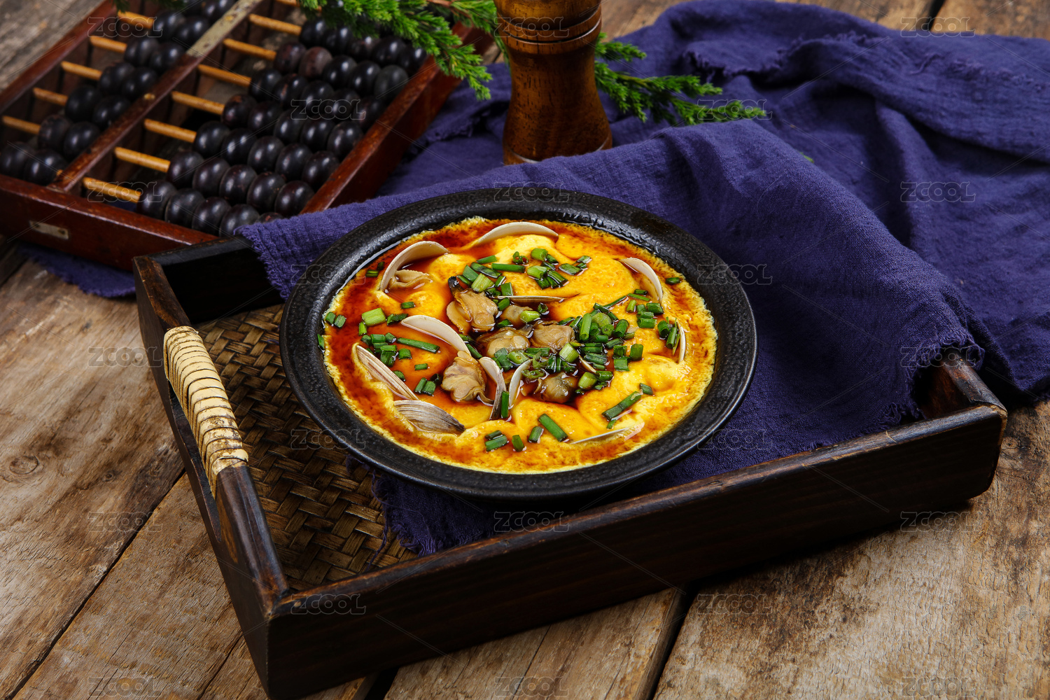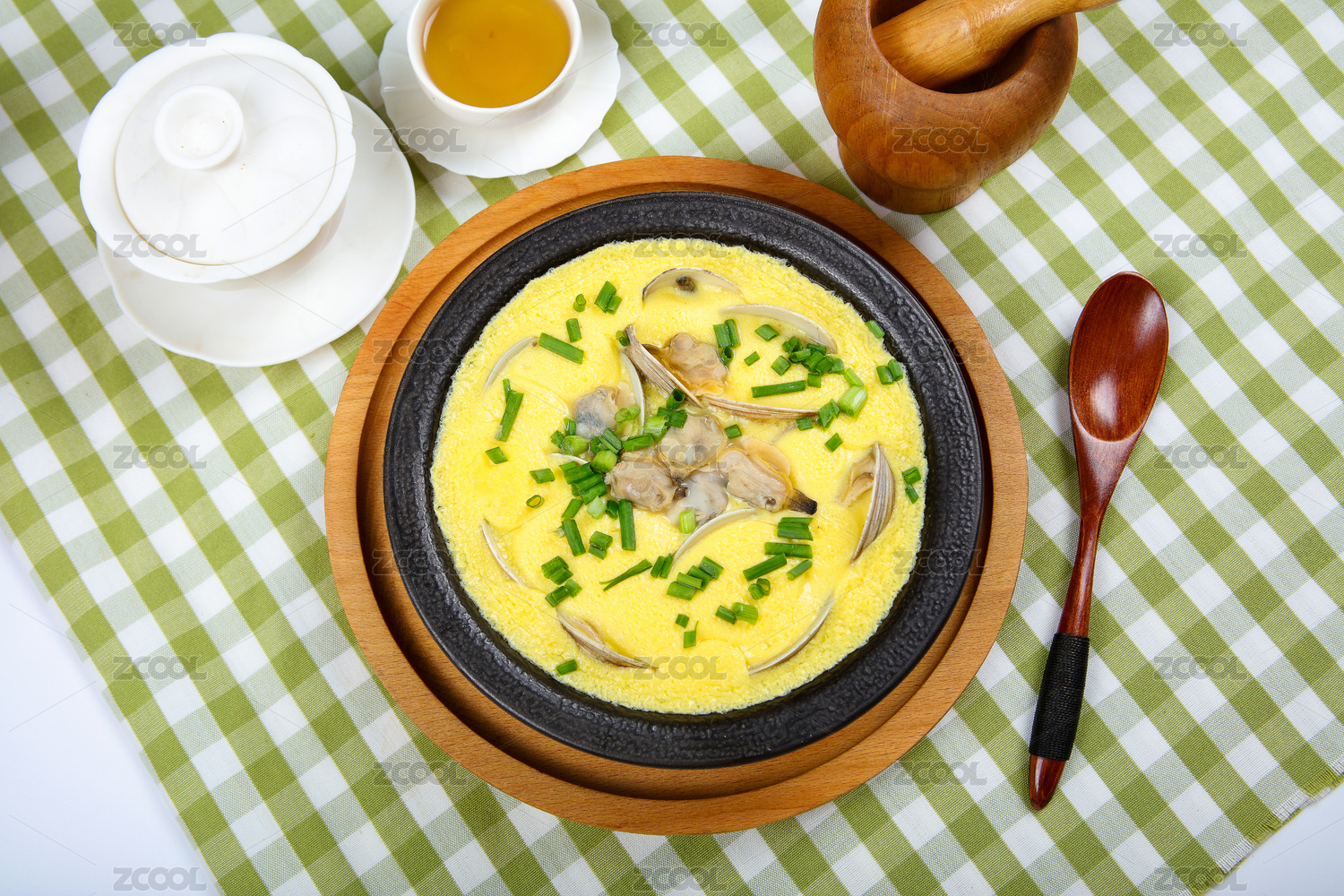 白色圓盤裝的花蛤蒸蛋擺放在樟木砧板上