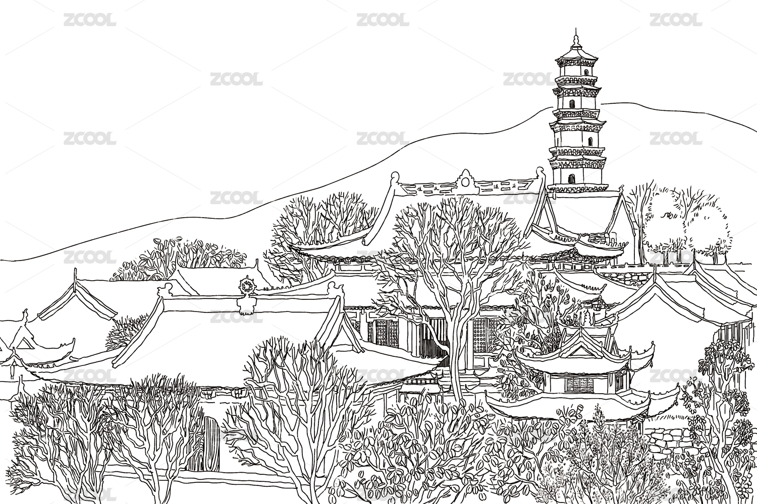 九華山名山圣地古建筑素描線(xiàn)稿