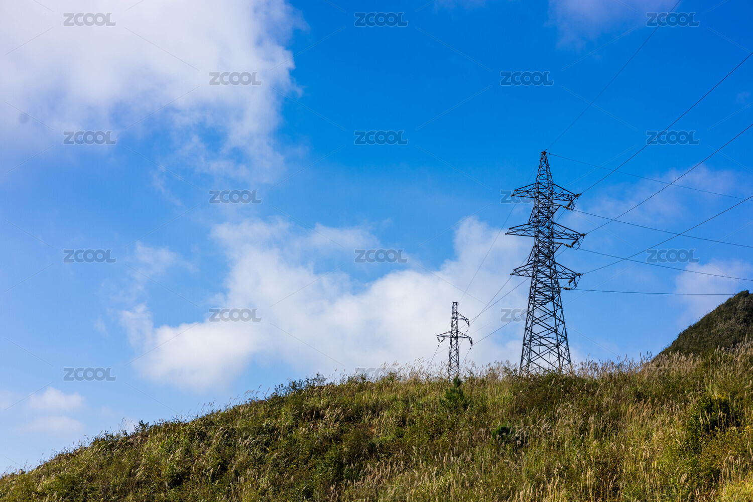 藍(lán)天白云下山坡上的輸電線