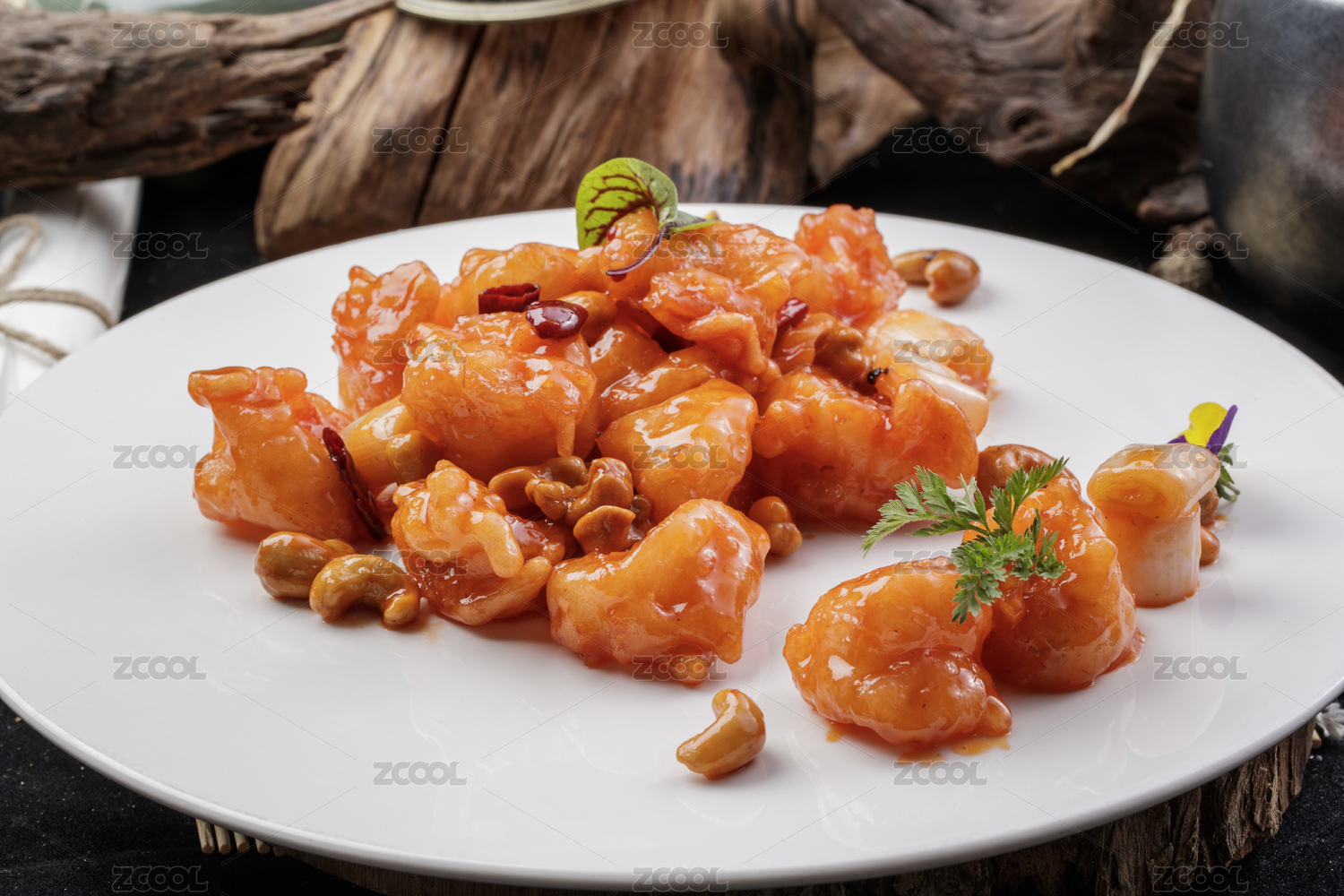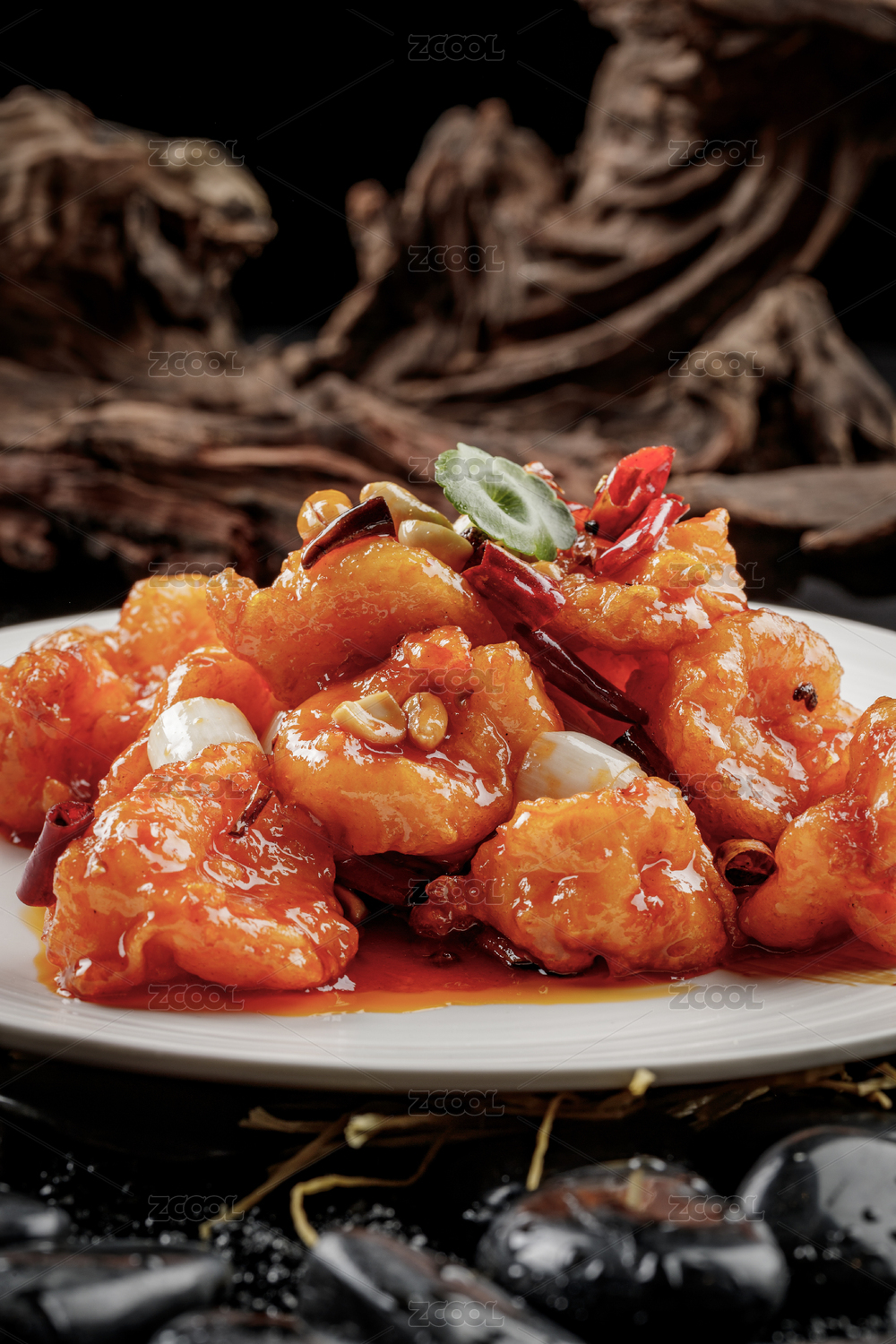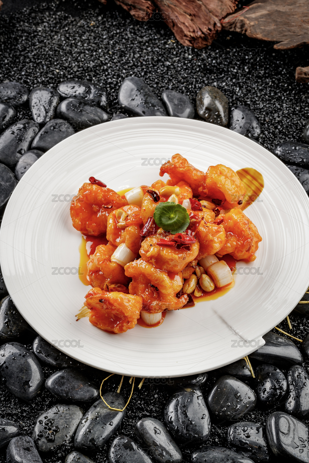 白色圓盤裝的宮保大蝦球擺在鵝卵石上