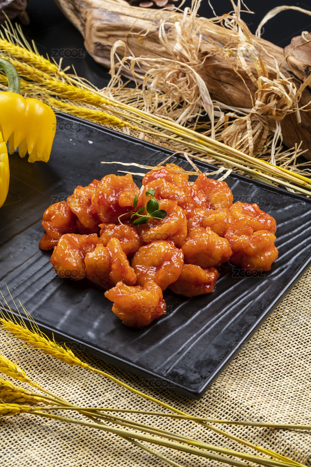 黑色石盤裝的宮爆大蝦球擺放在麻布?jí)|子上