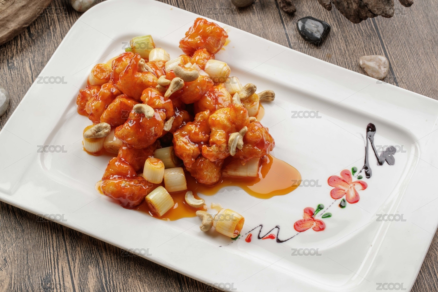 白色圓盤裝的宮保大蝦球擺放在壽司簾上