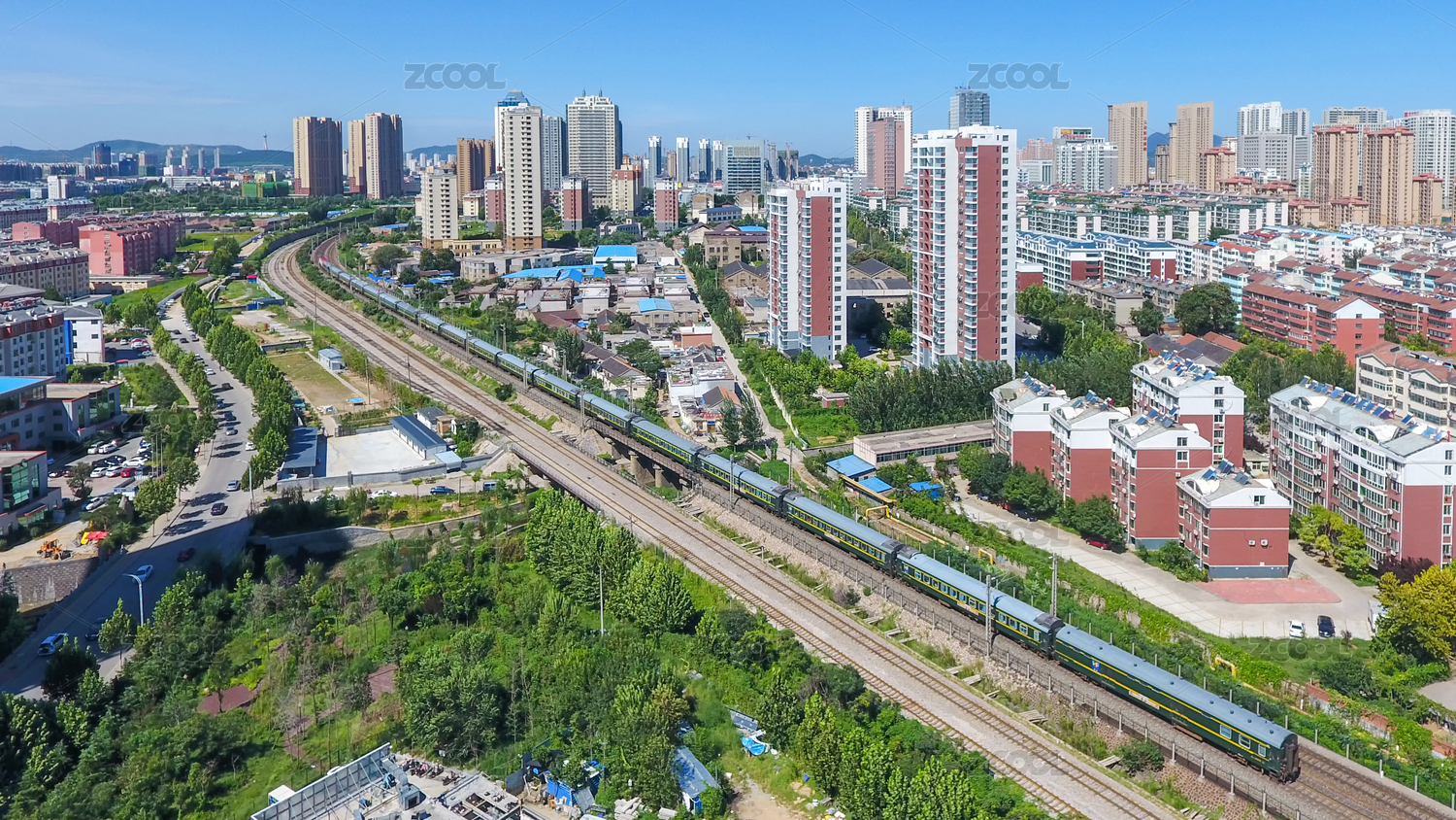 航拍行駛在鐵軌上的綠皮火車