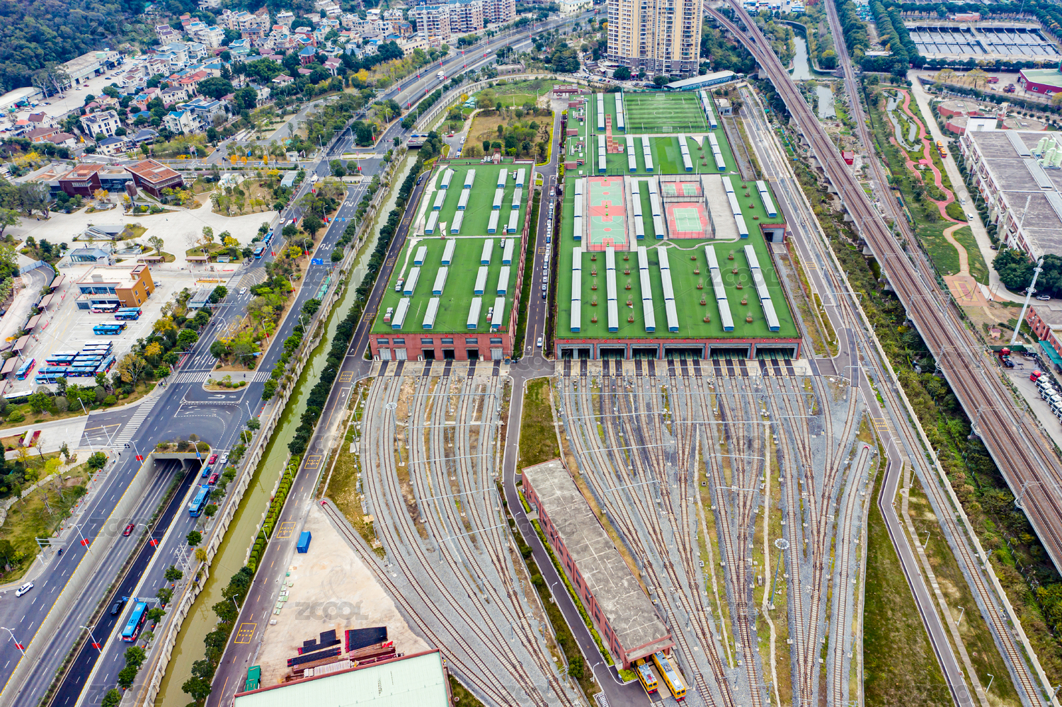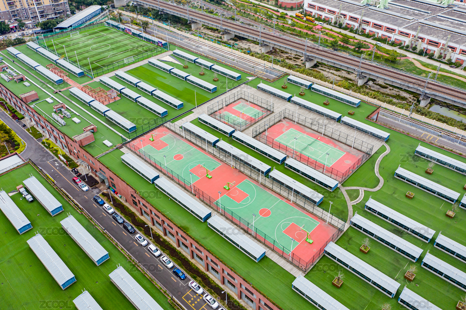 航拍福建福州地鐵鼓山車輛段屋頂球場(chǎng)綠化