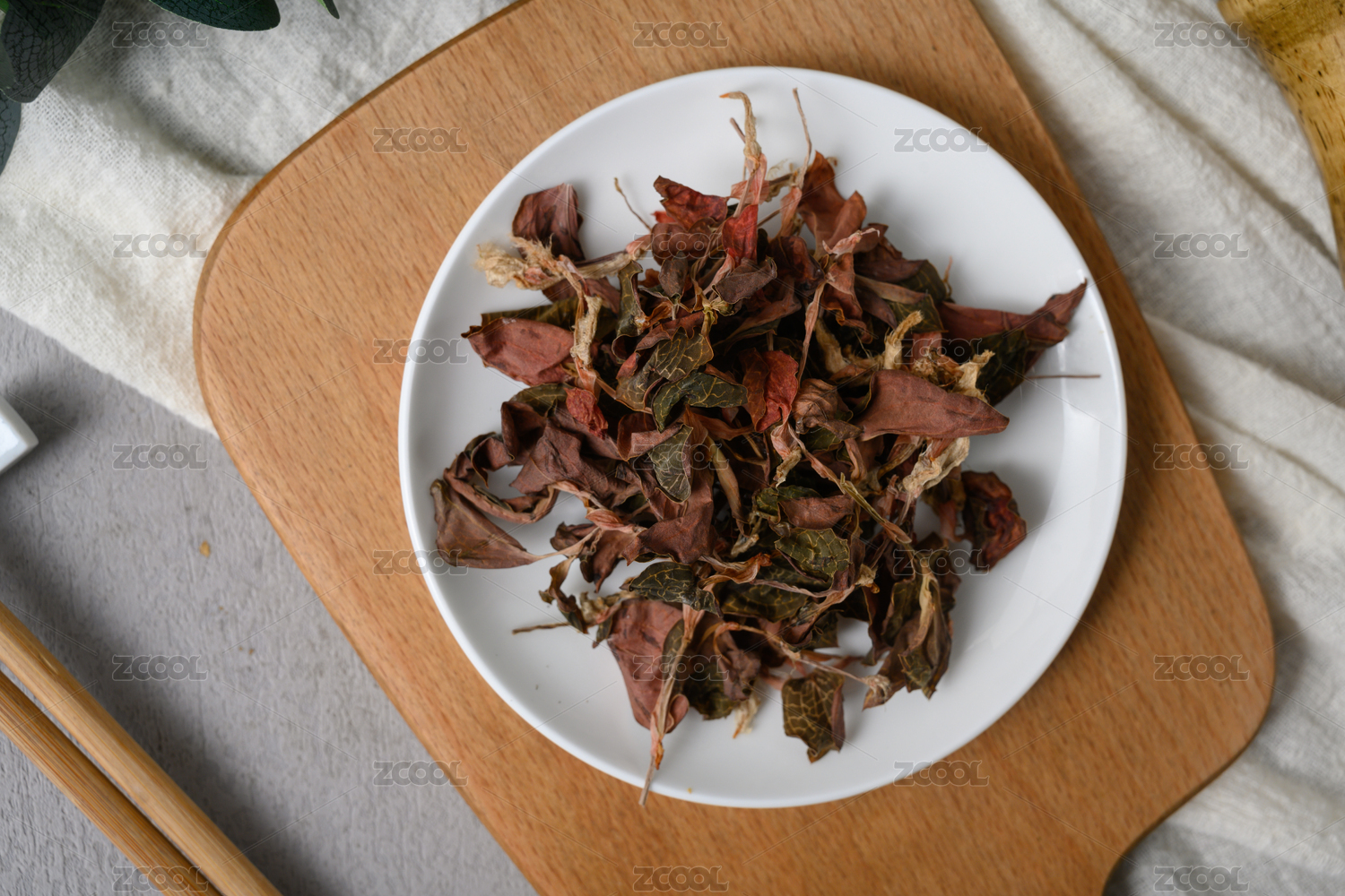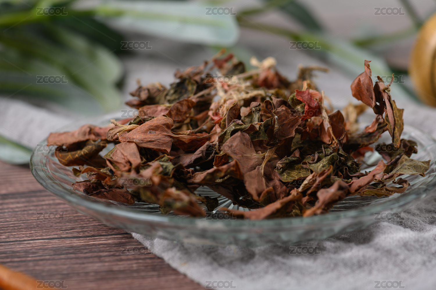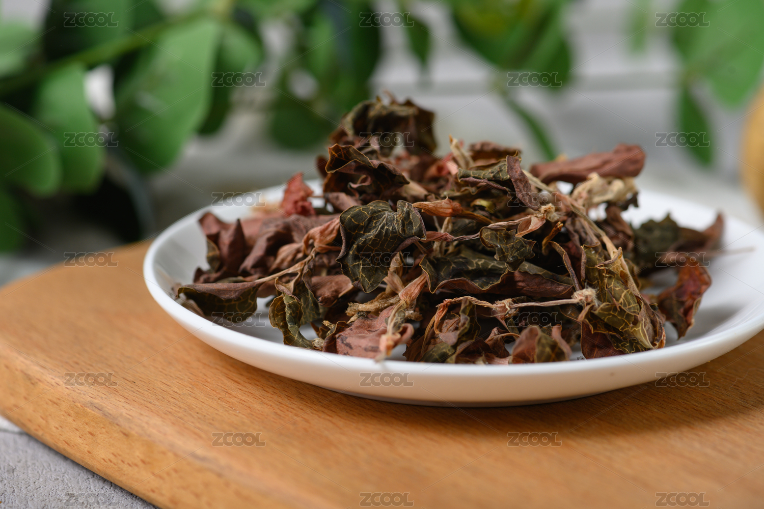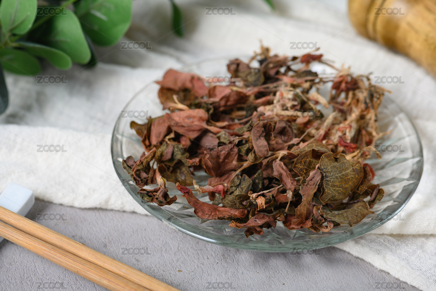 桌面上的盤子里的干爽的金線蓮