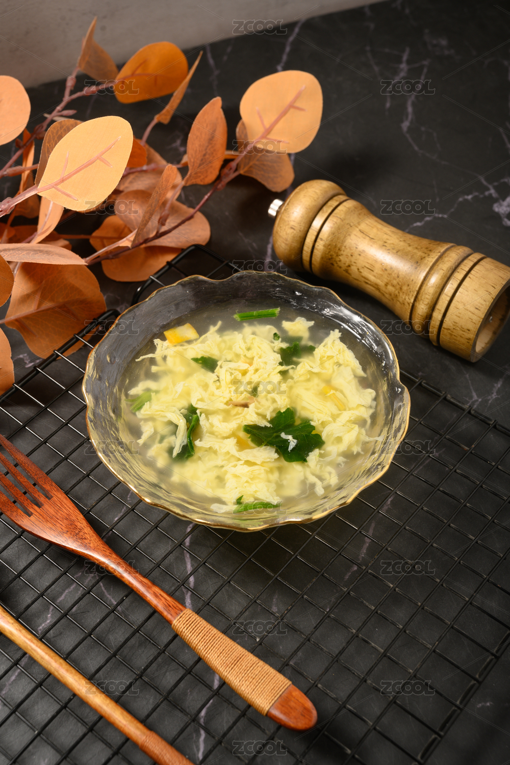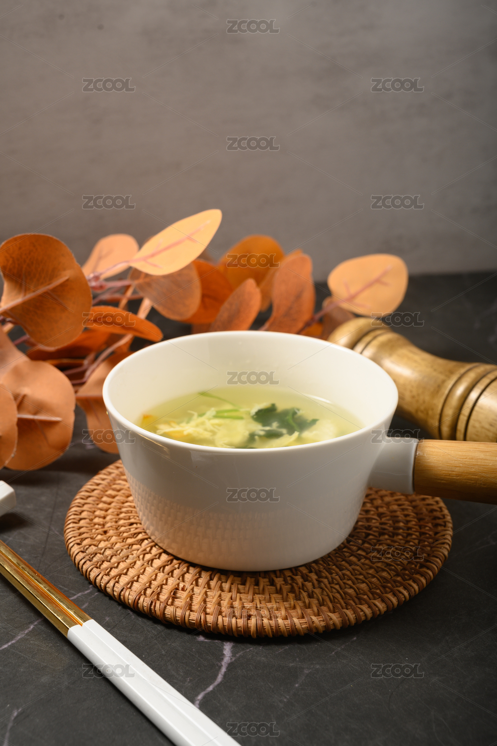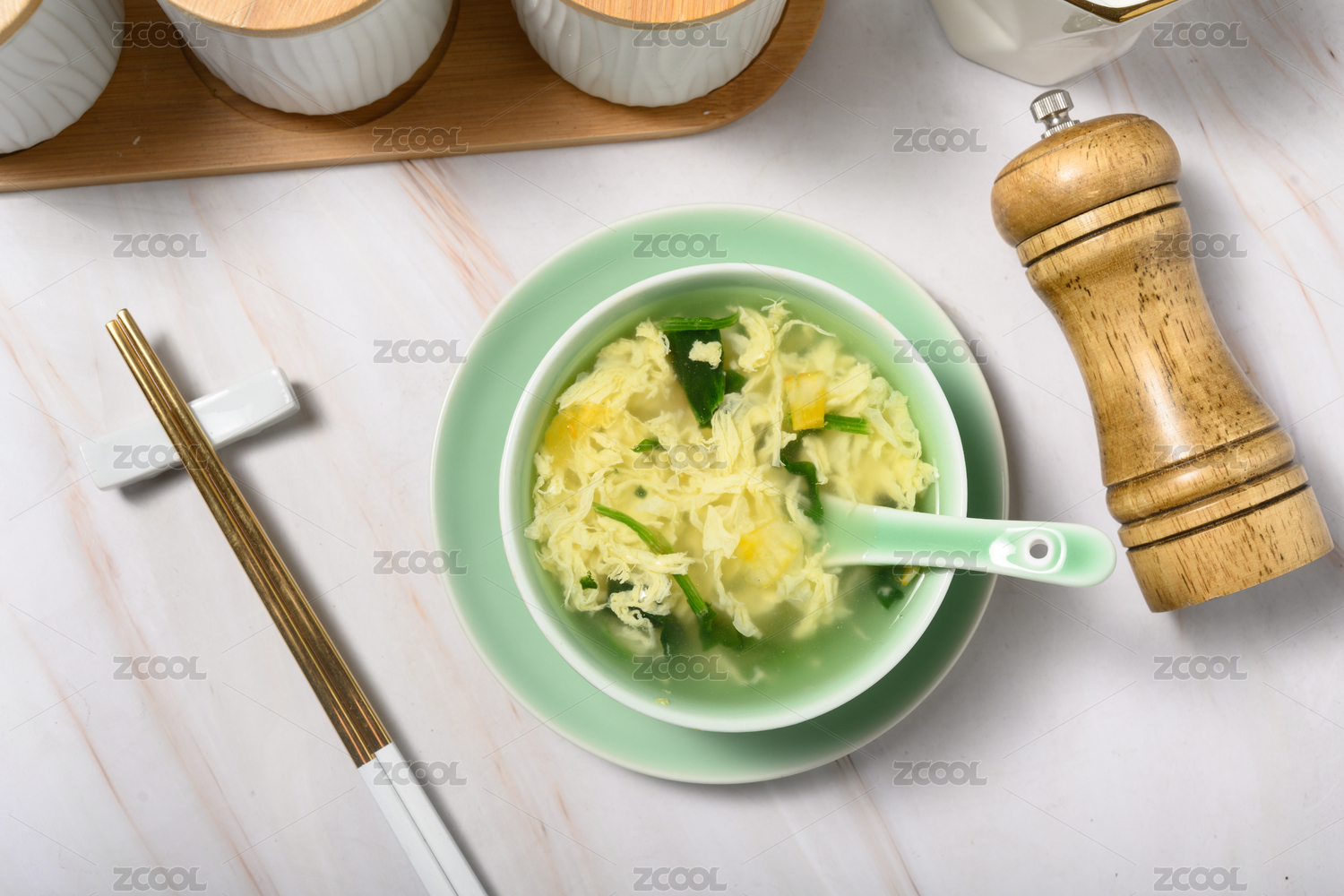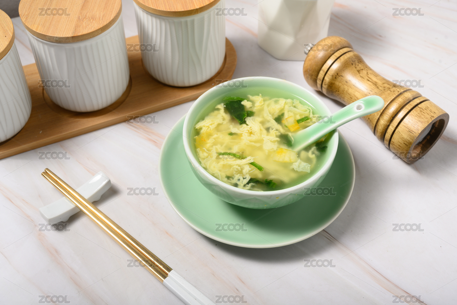 盛放著菠菜蛋花湯的青花碗擺放在桌面上