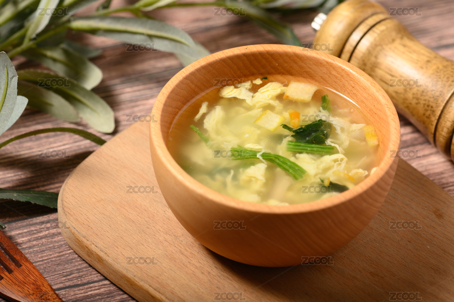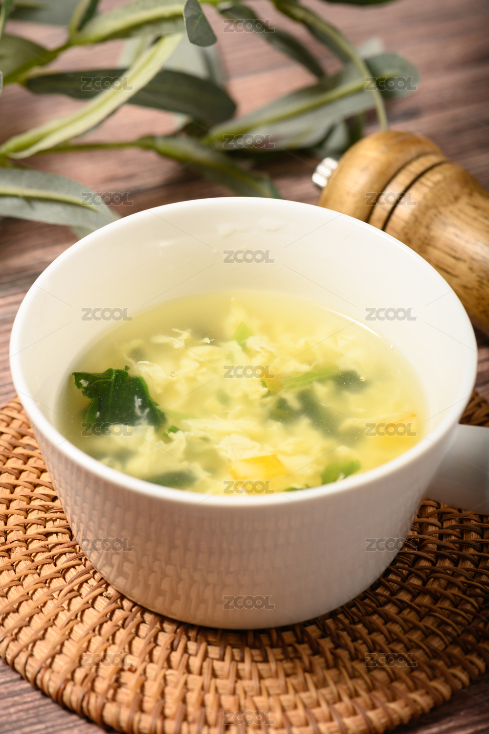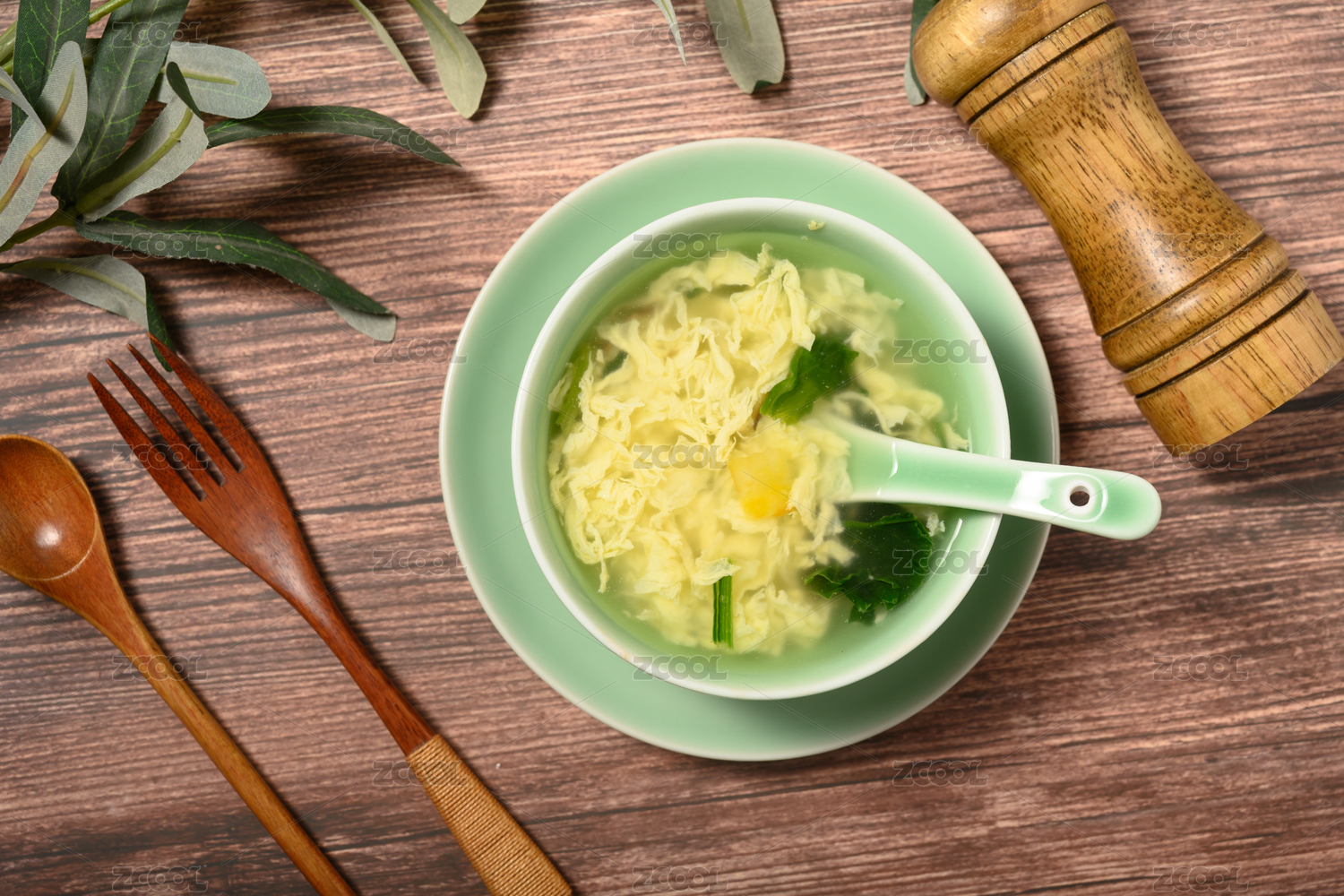 桌面上的盤子里的美味可口的菠菜蛋花湯