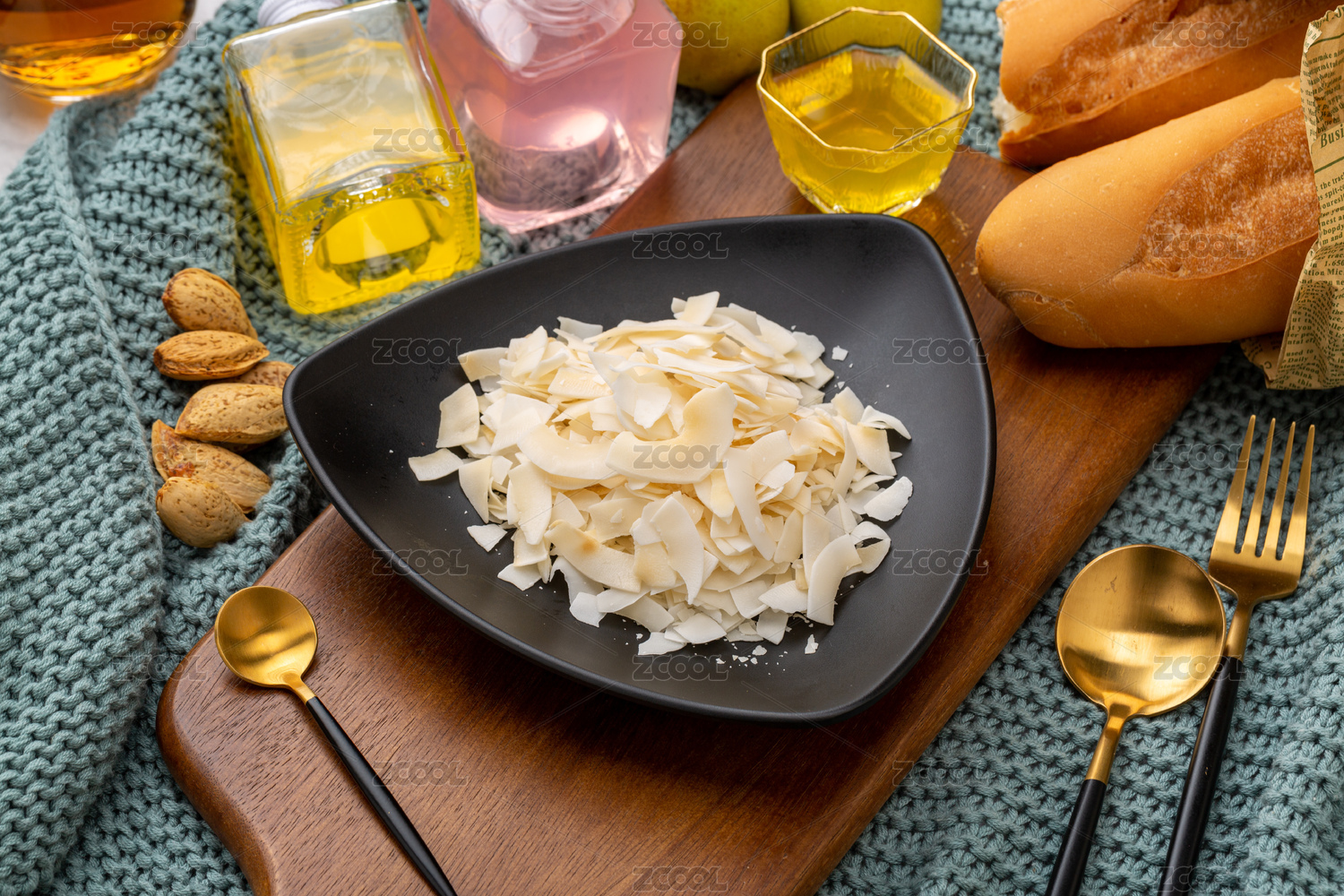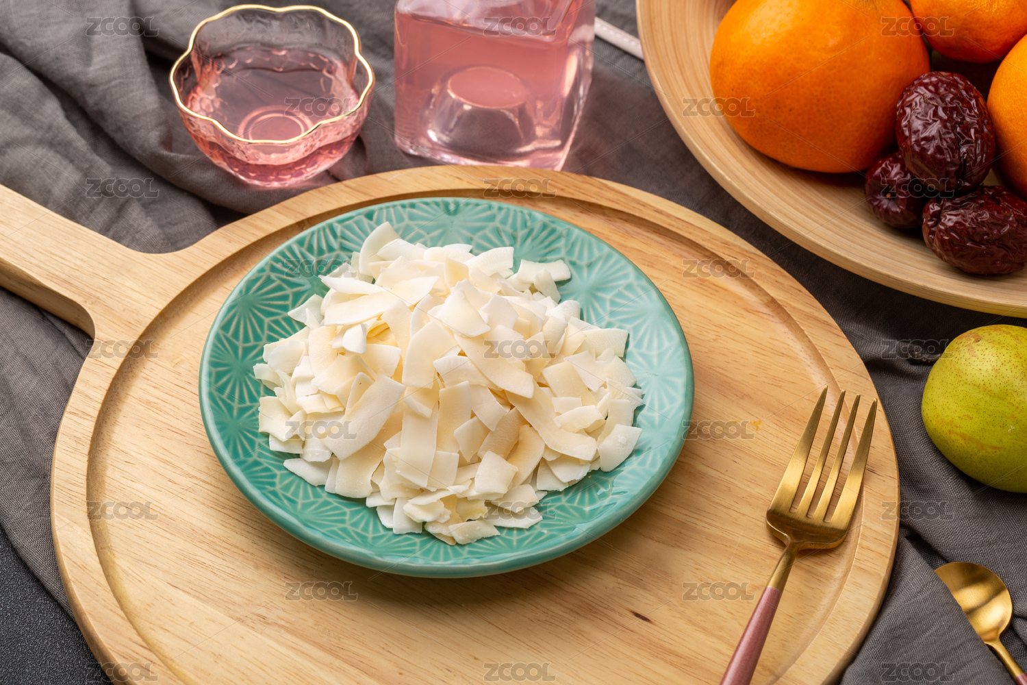 綠色盤子里的椰子脆片