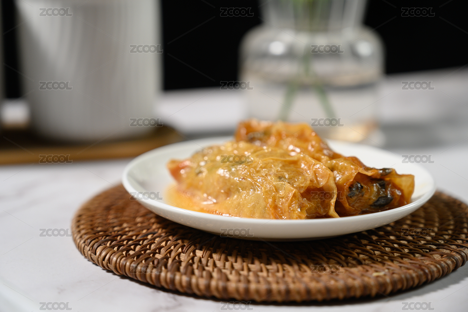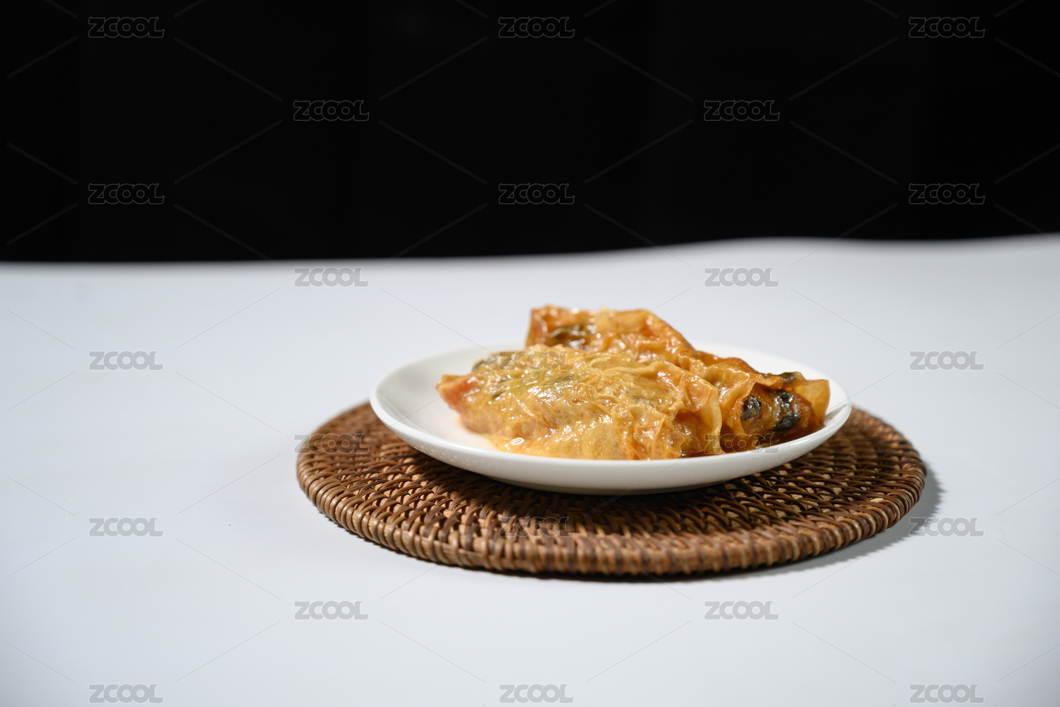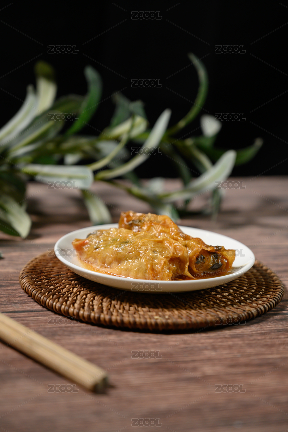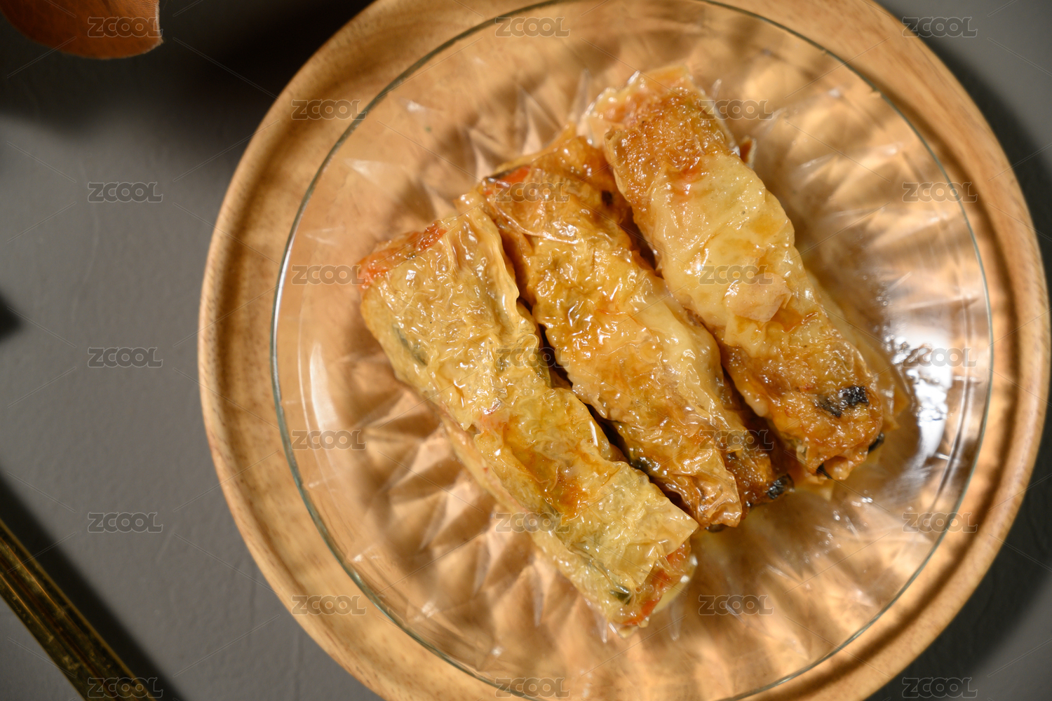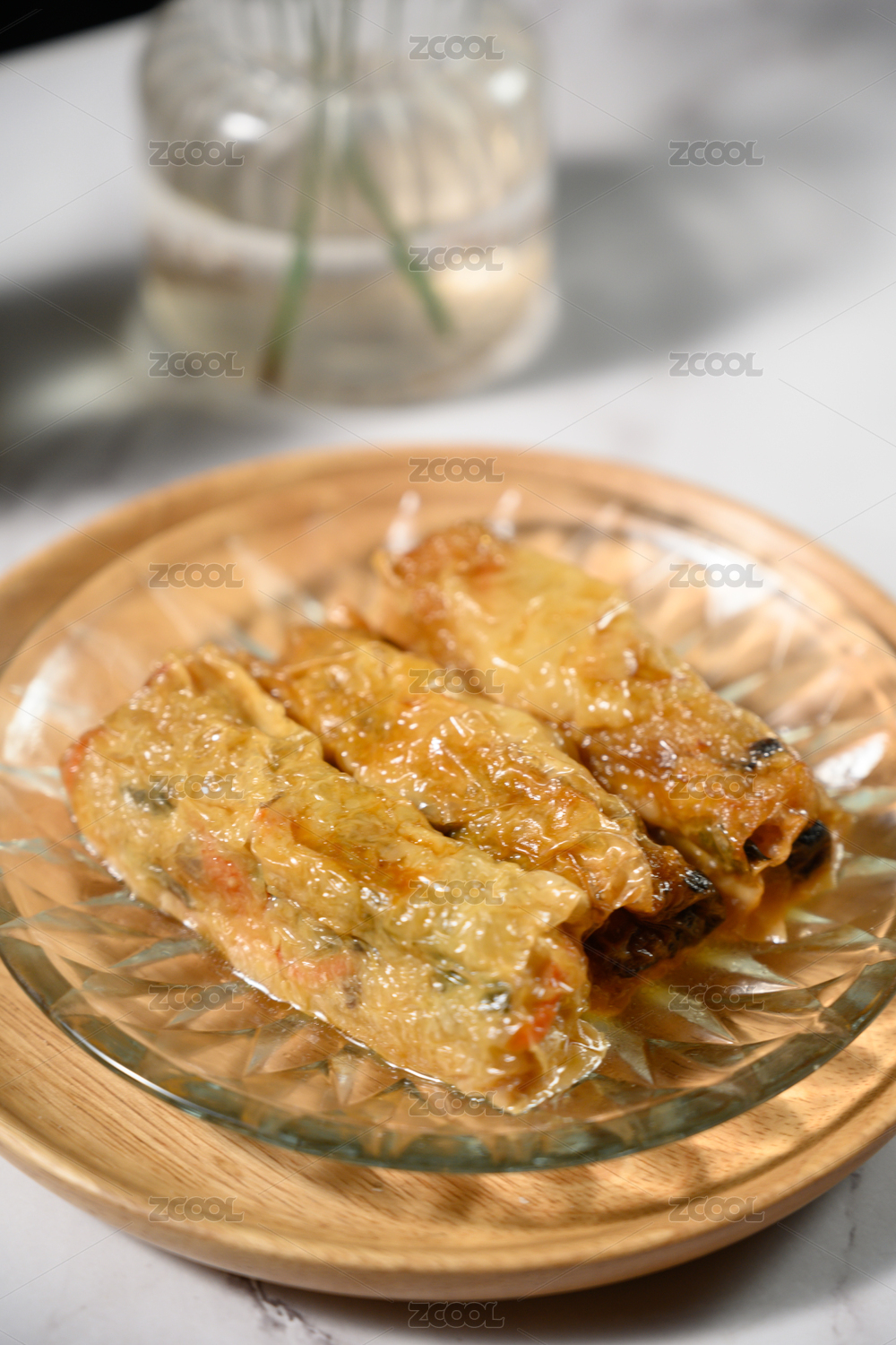 一盤火鍋食材響鈴卷腐皮卷擺放在桌面上特寫