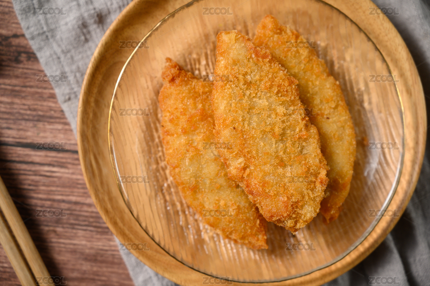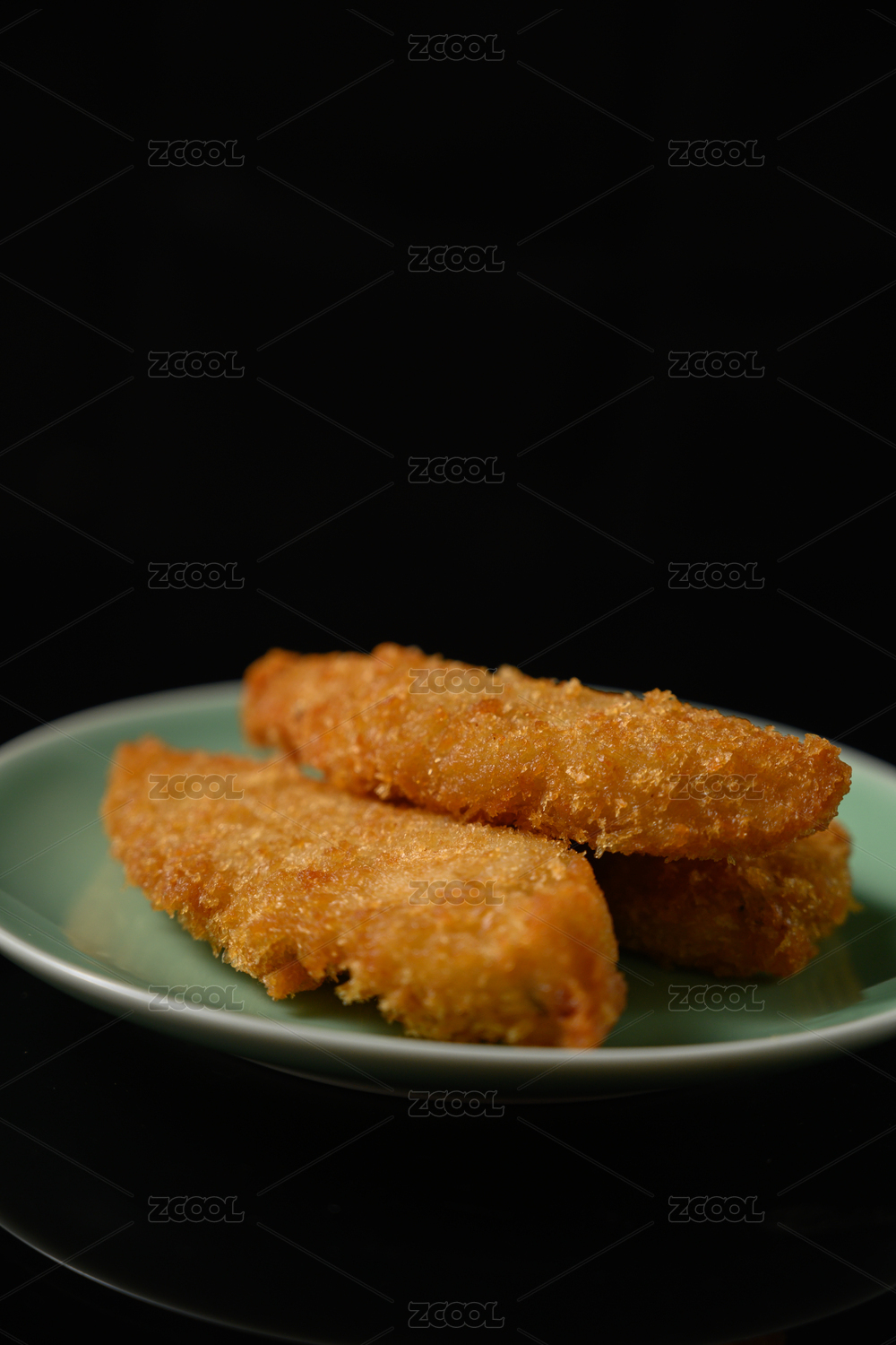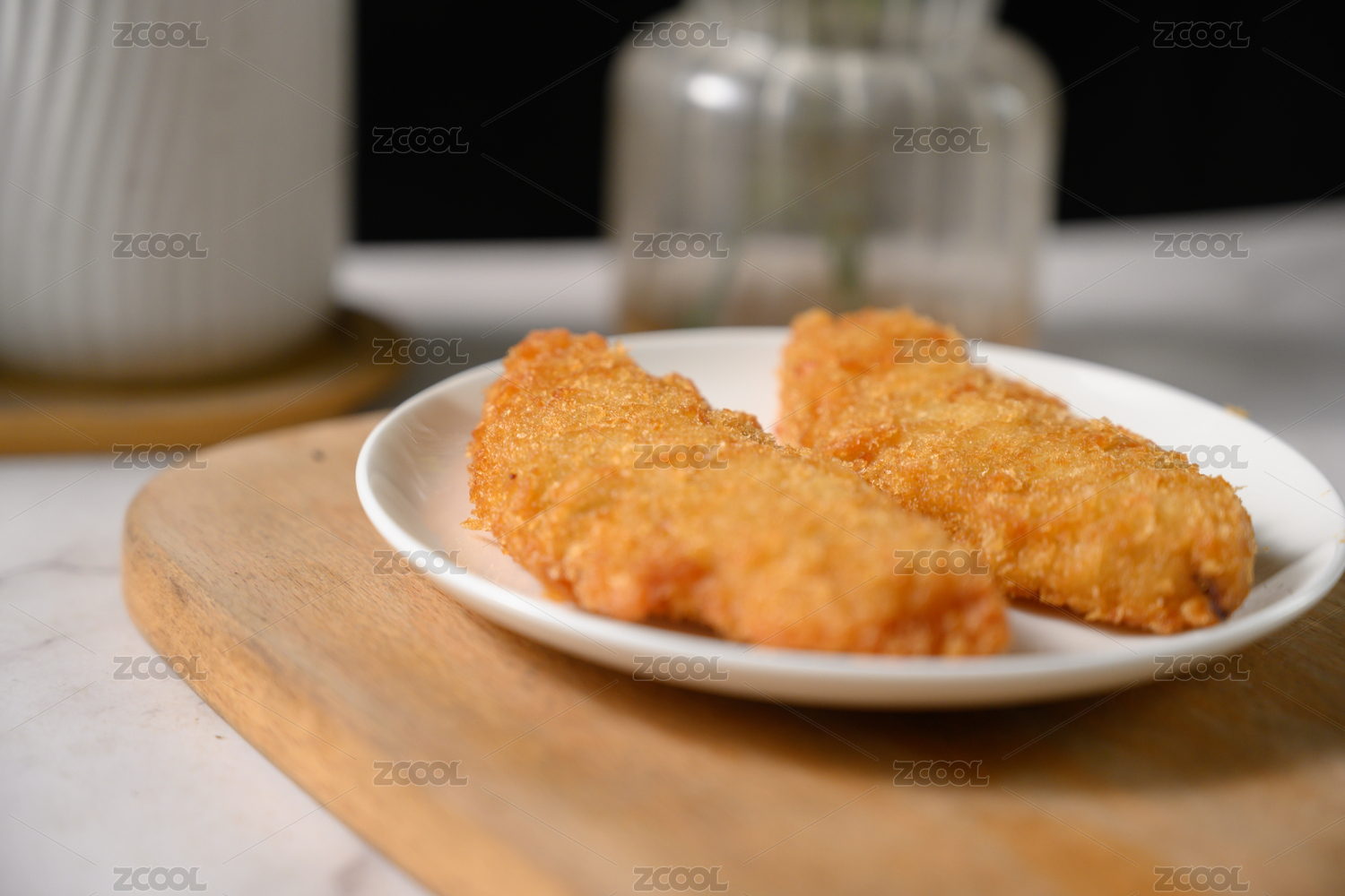 純色背景盤子里炸鱈魚的特寫鏡頭