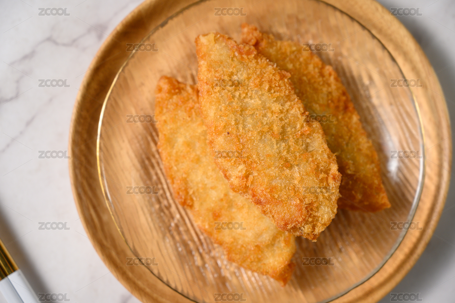 餐桌上盤子里的炸鱈魚的高角度視圖
