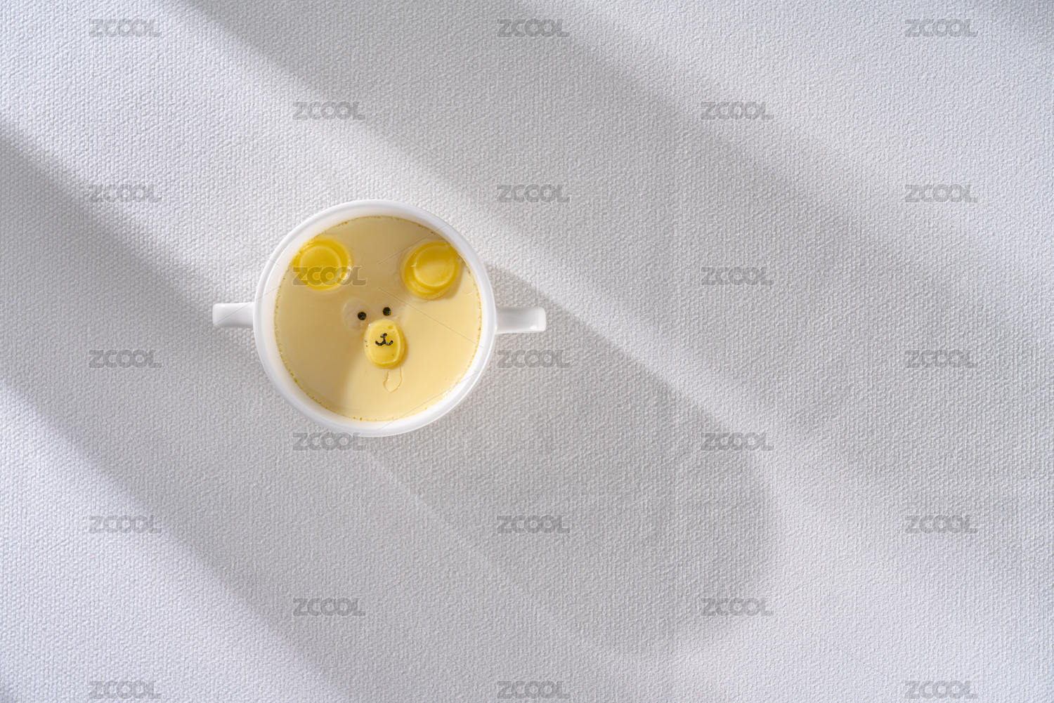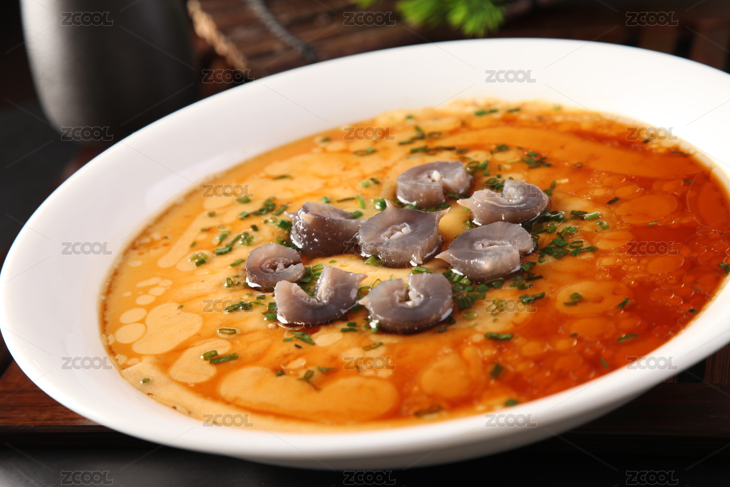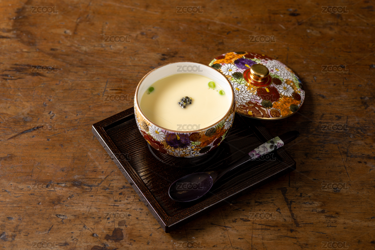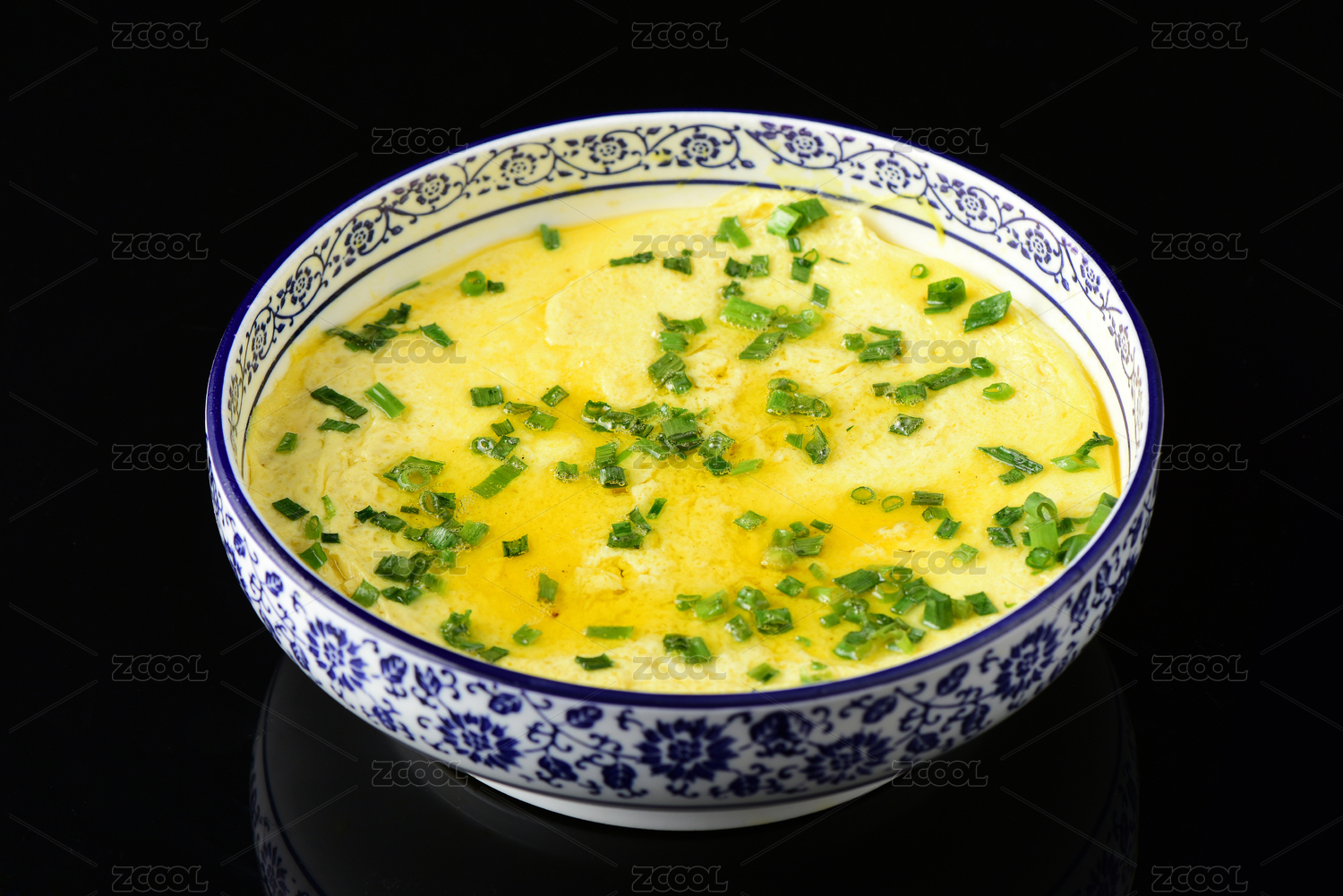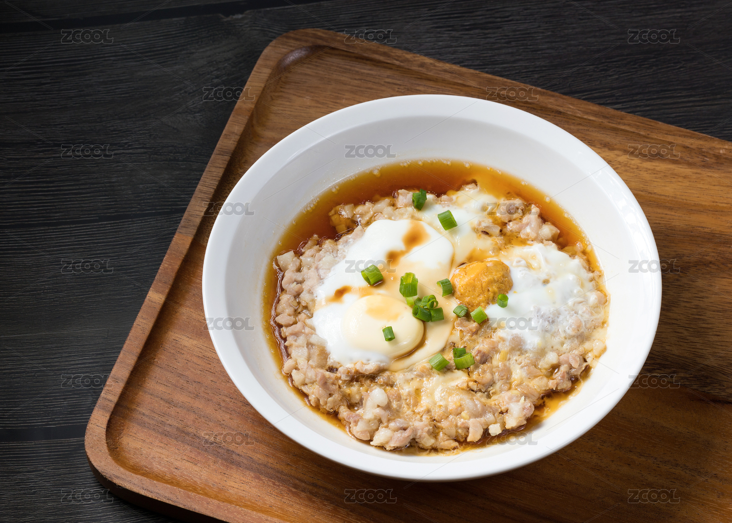 暗色調(diào)背景木盤(pán)上肉絲燉蛋