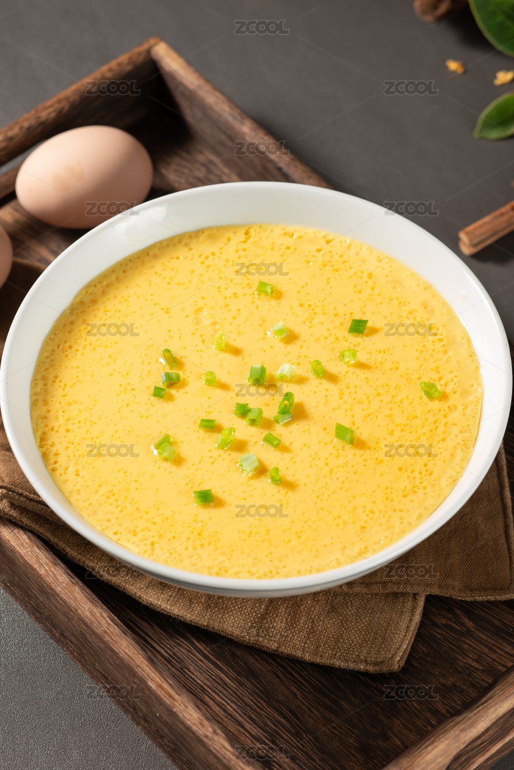 暗色調(diào)背景木盤(pán)上肉末燉蛋