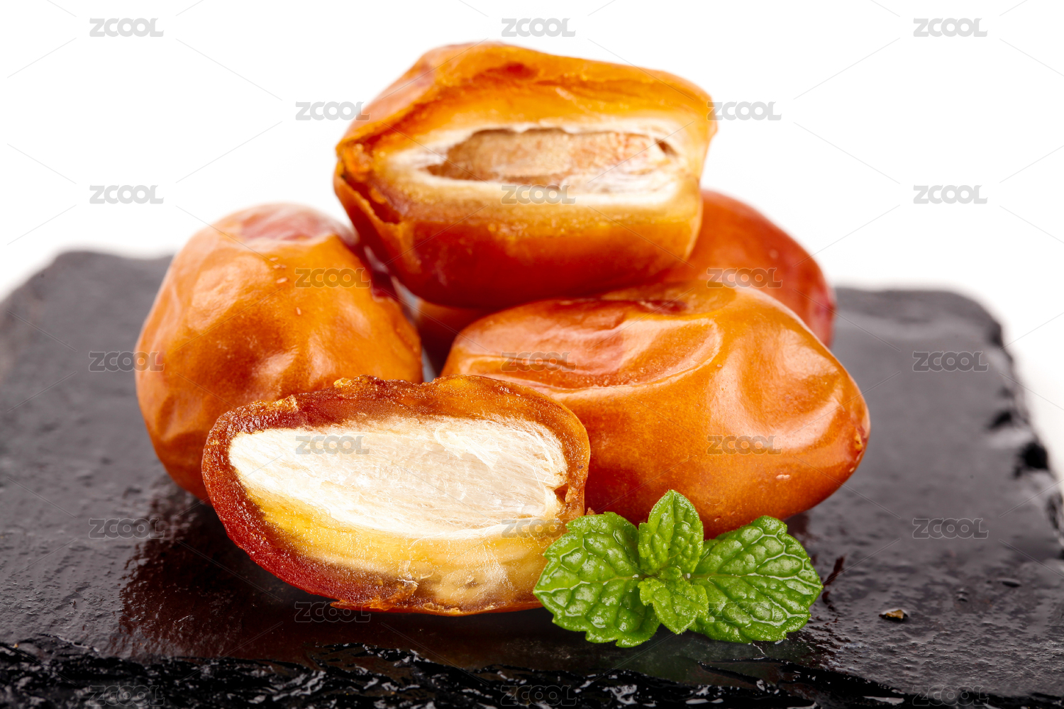 白底上黑石板上放著一堆黃椰棗和切開的椰棗