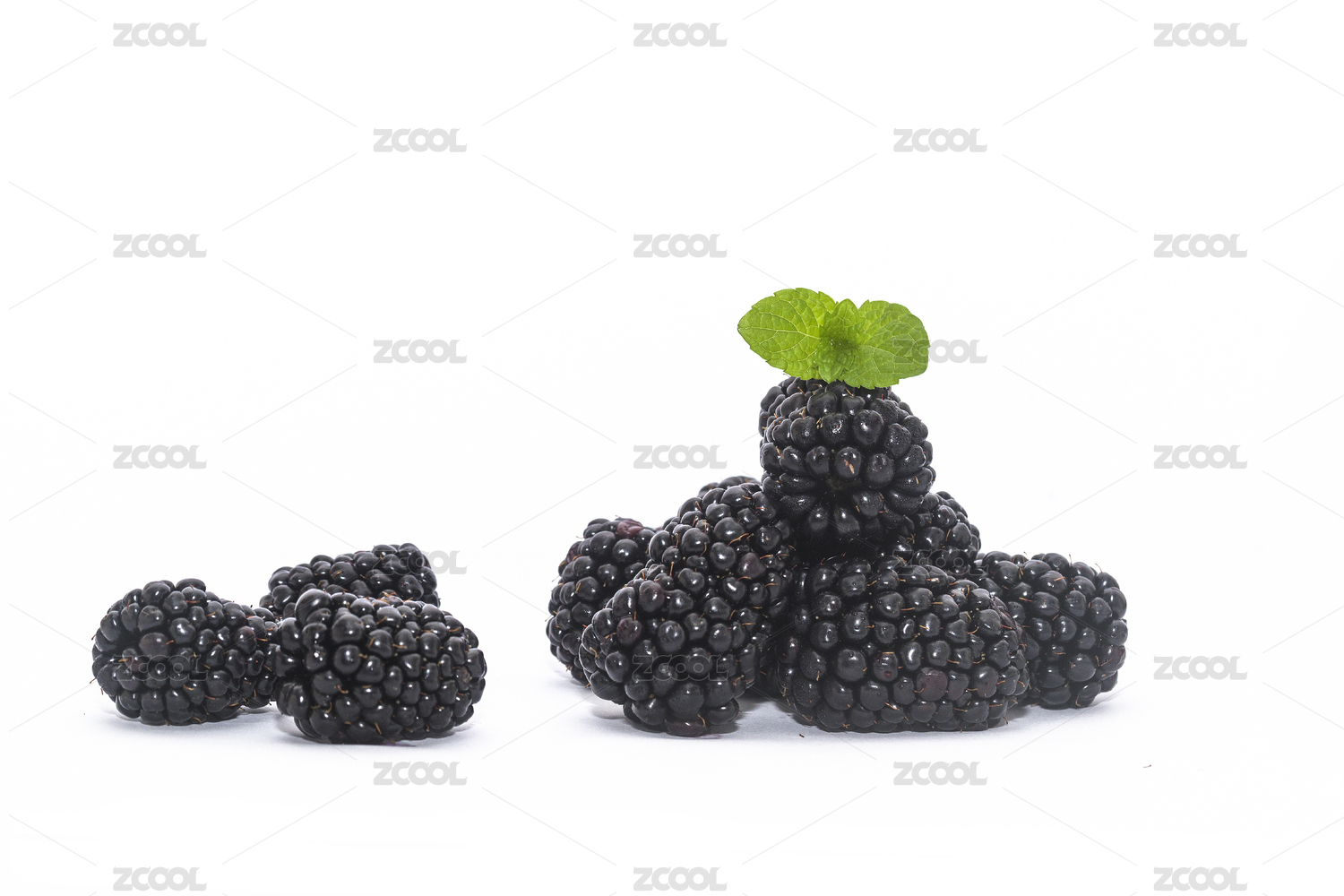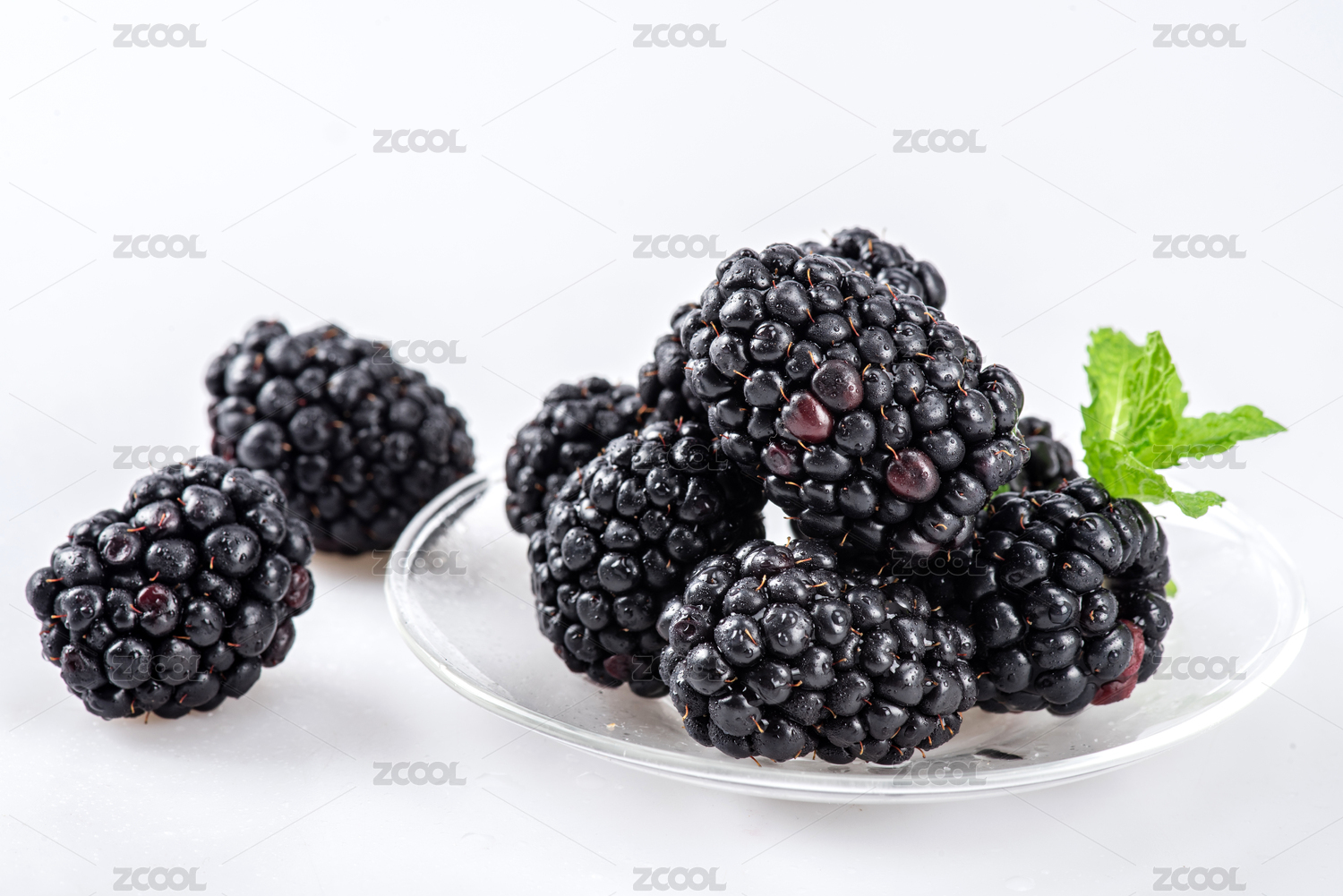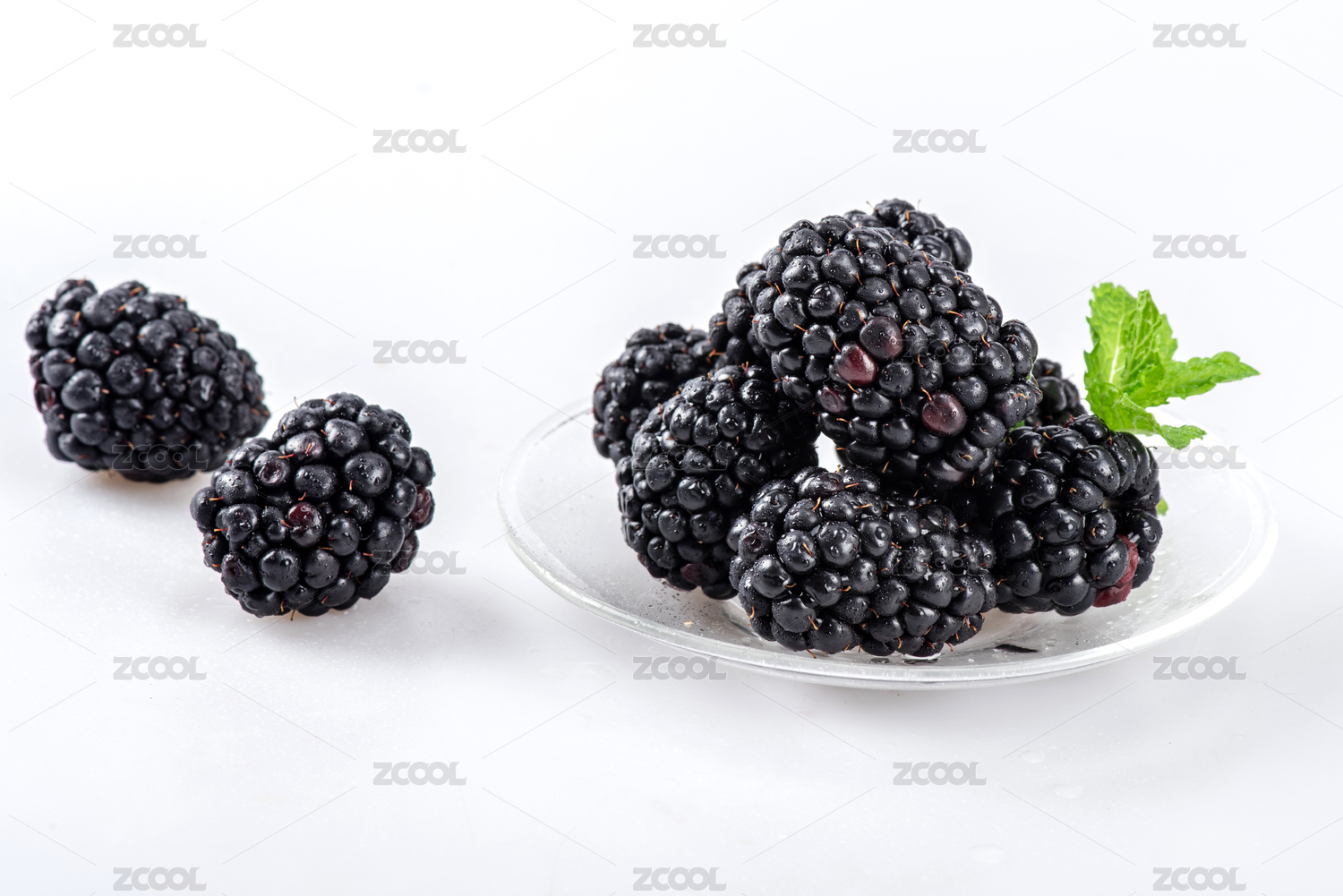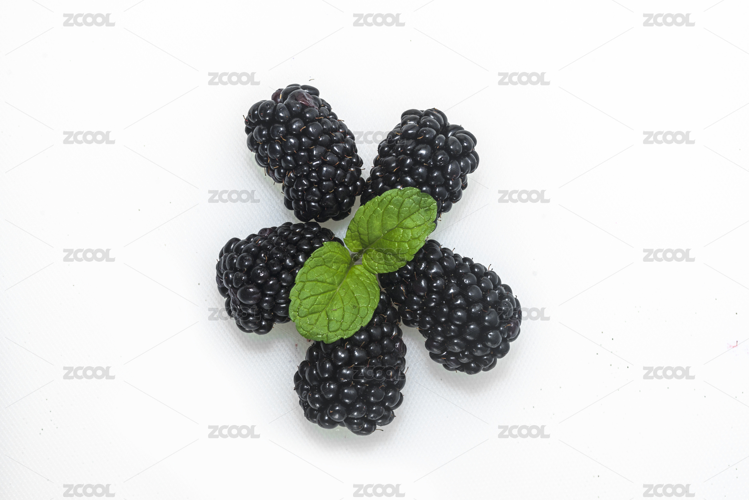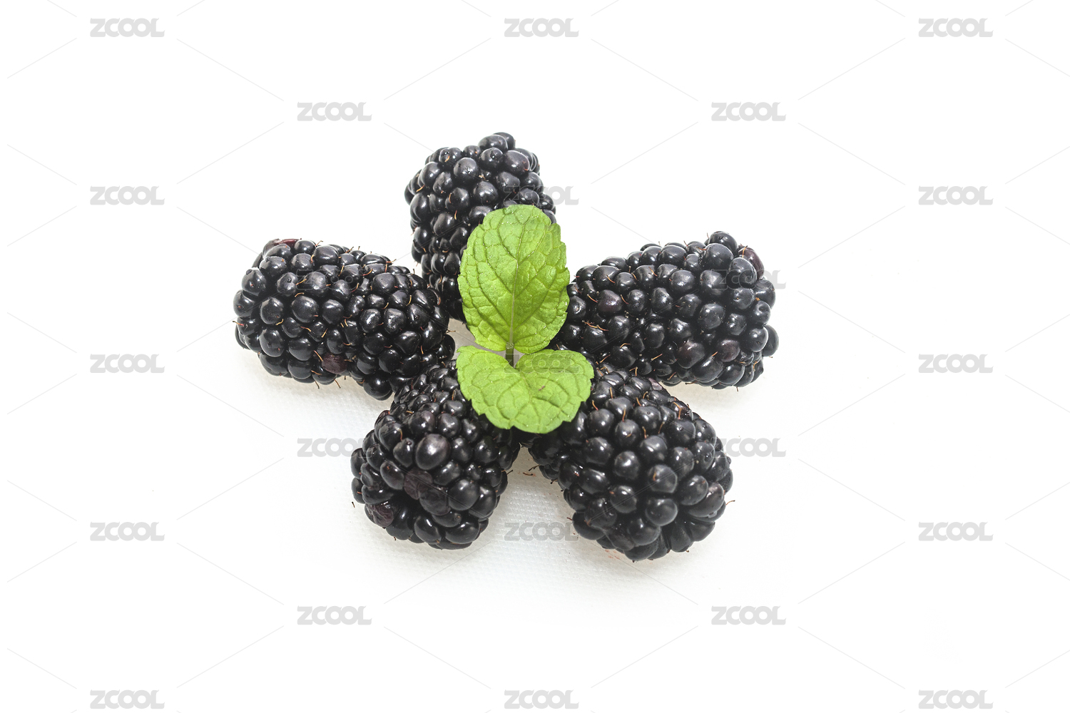 白色背景下多個(gè)黑莓放在綠色葉子上的特寫