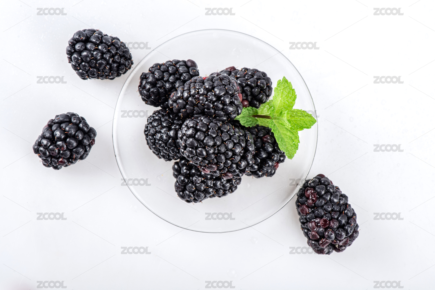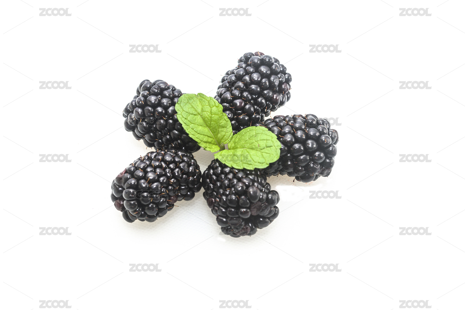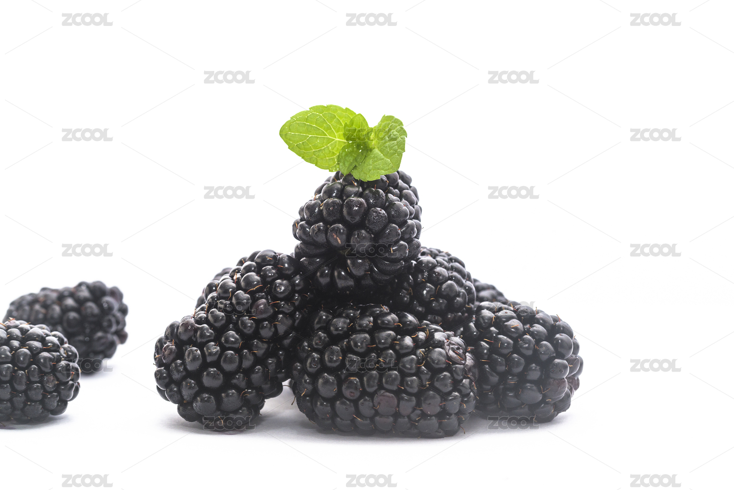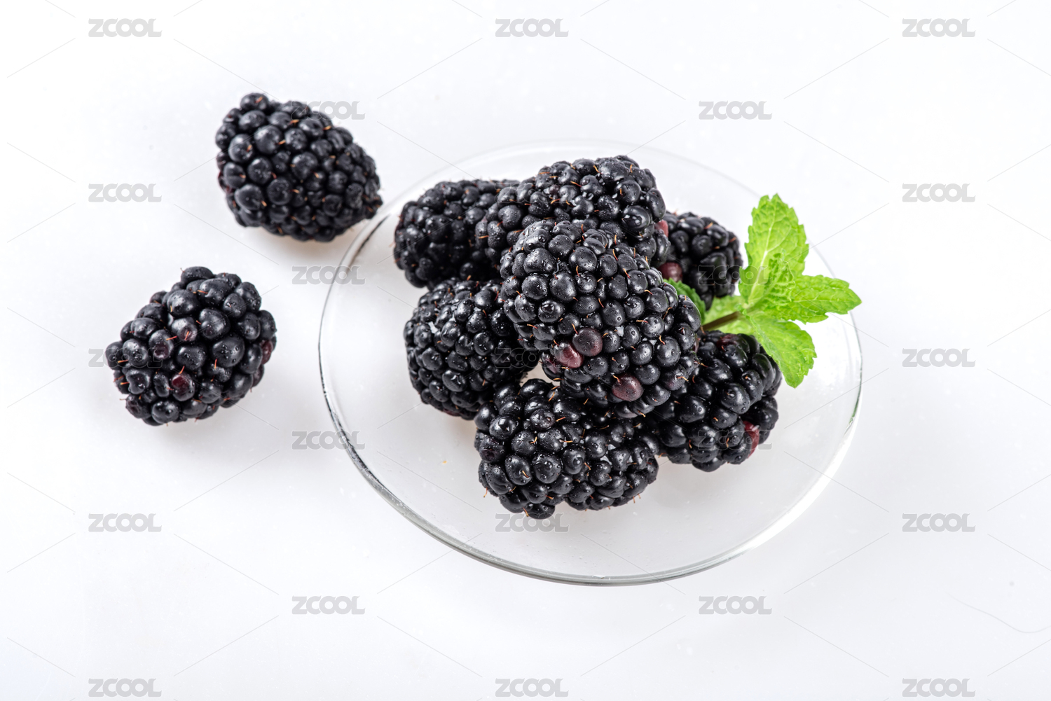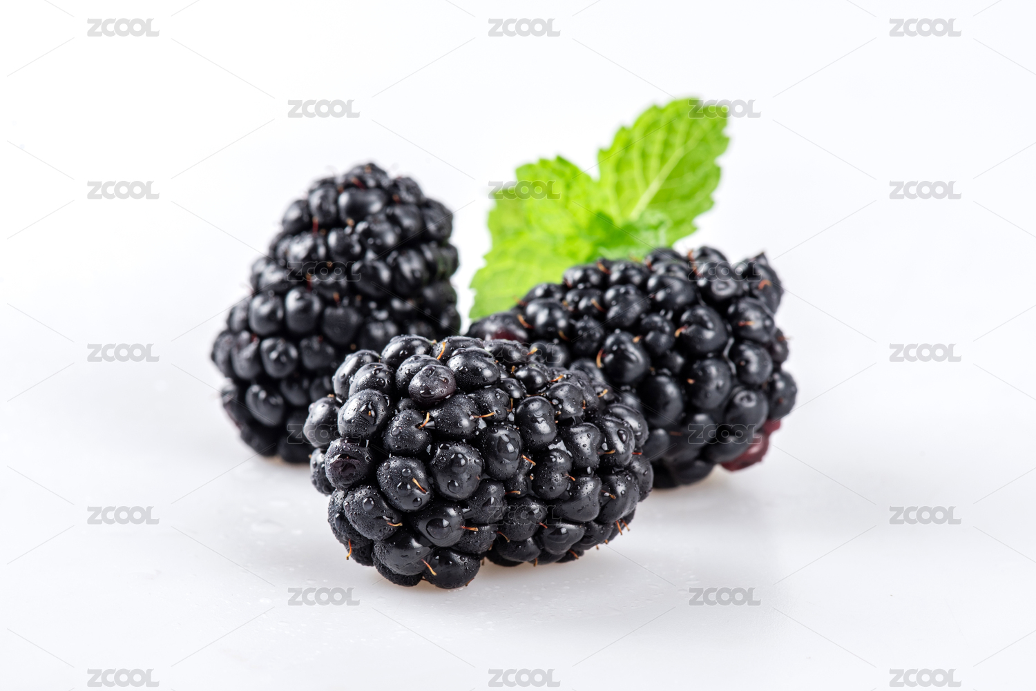 白色背景下多個(gè)黑莓放在綠色葉子上的特寫