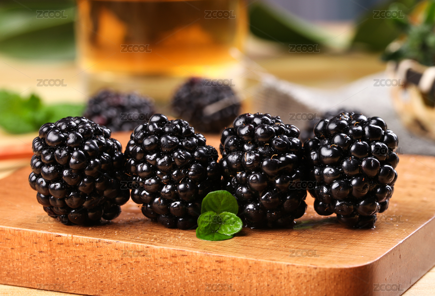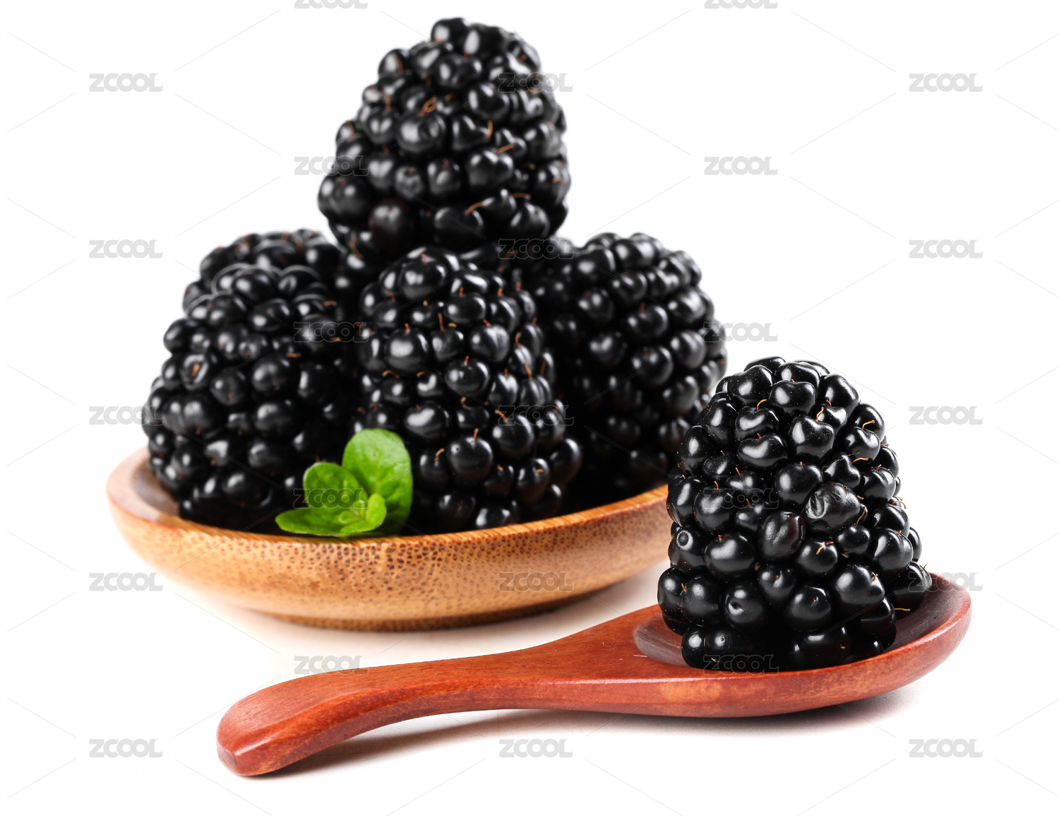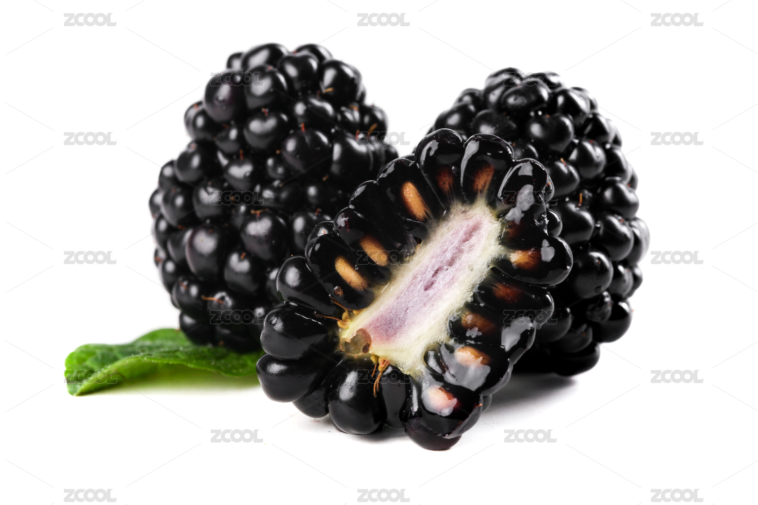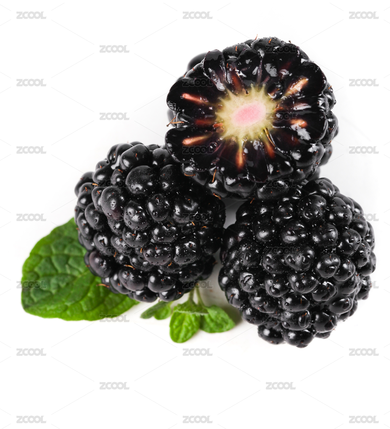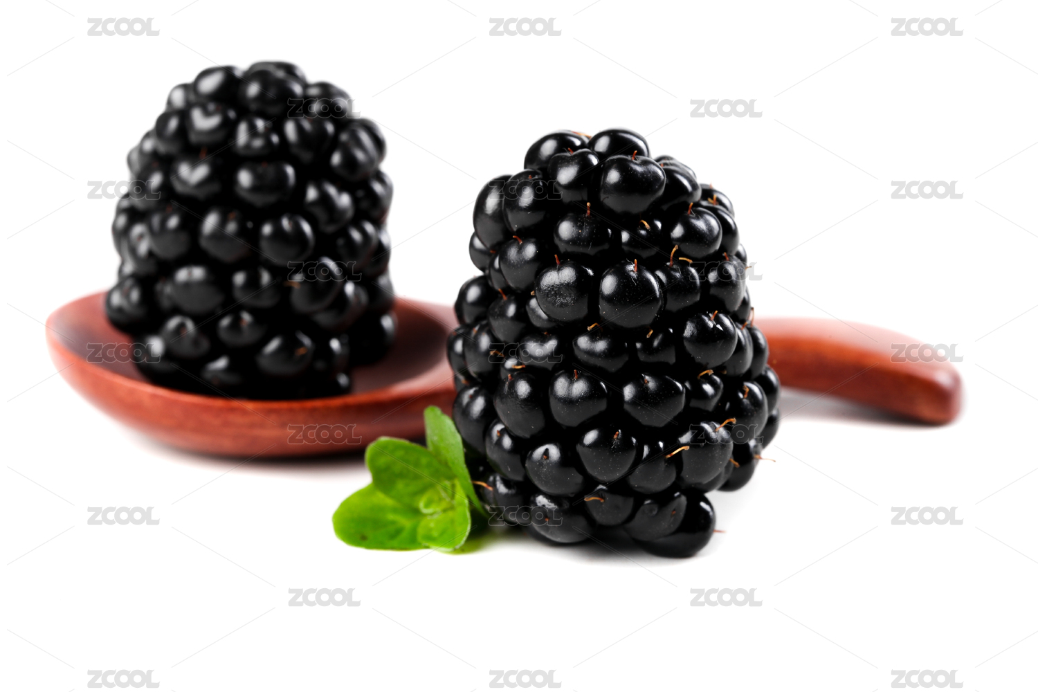 白色背景下多個(gè)黑莓放在綠色葉子上的特寫