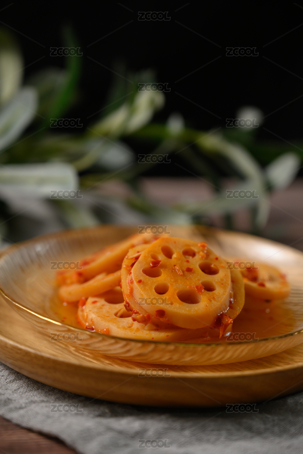 桌面上的盤子里的美味可口的香辣藕片