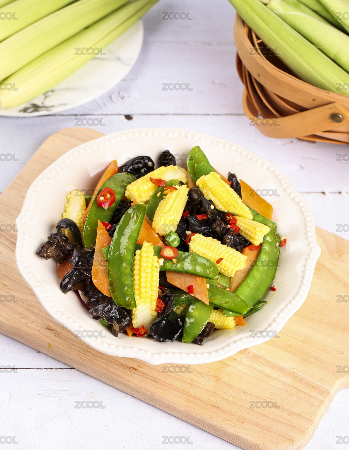 木板上放著一盤素炒玉米筍