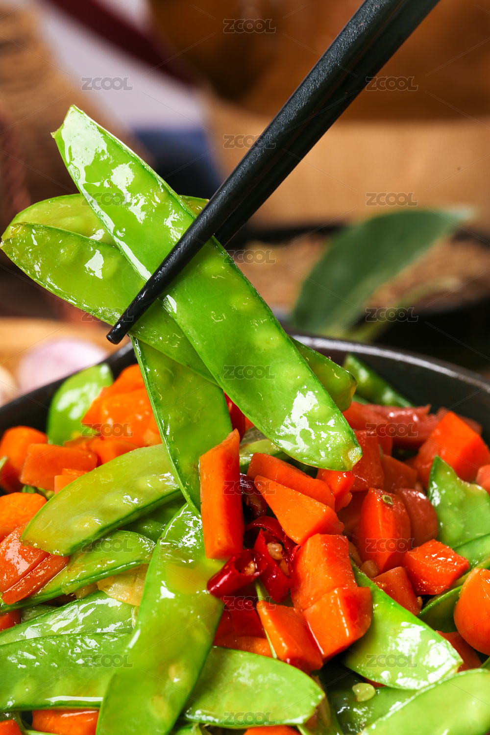 一盤素炒荷蘭豆和筷子上夾著荷蘭豆