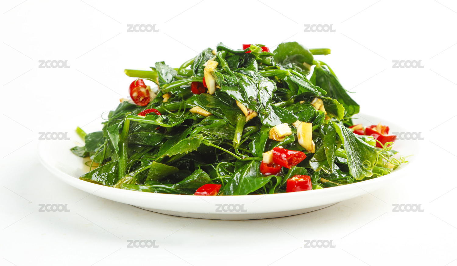 白底上放著一盤素炒豌豆尖
