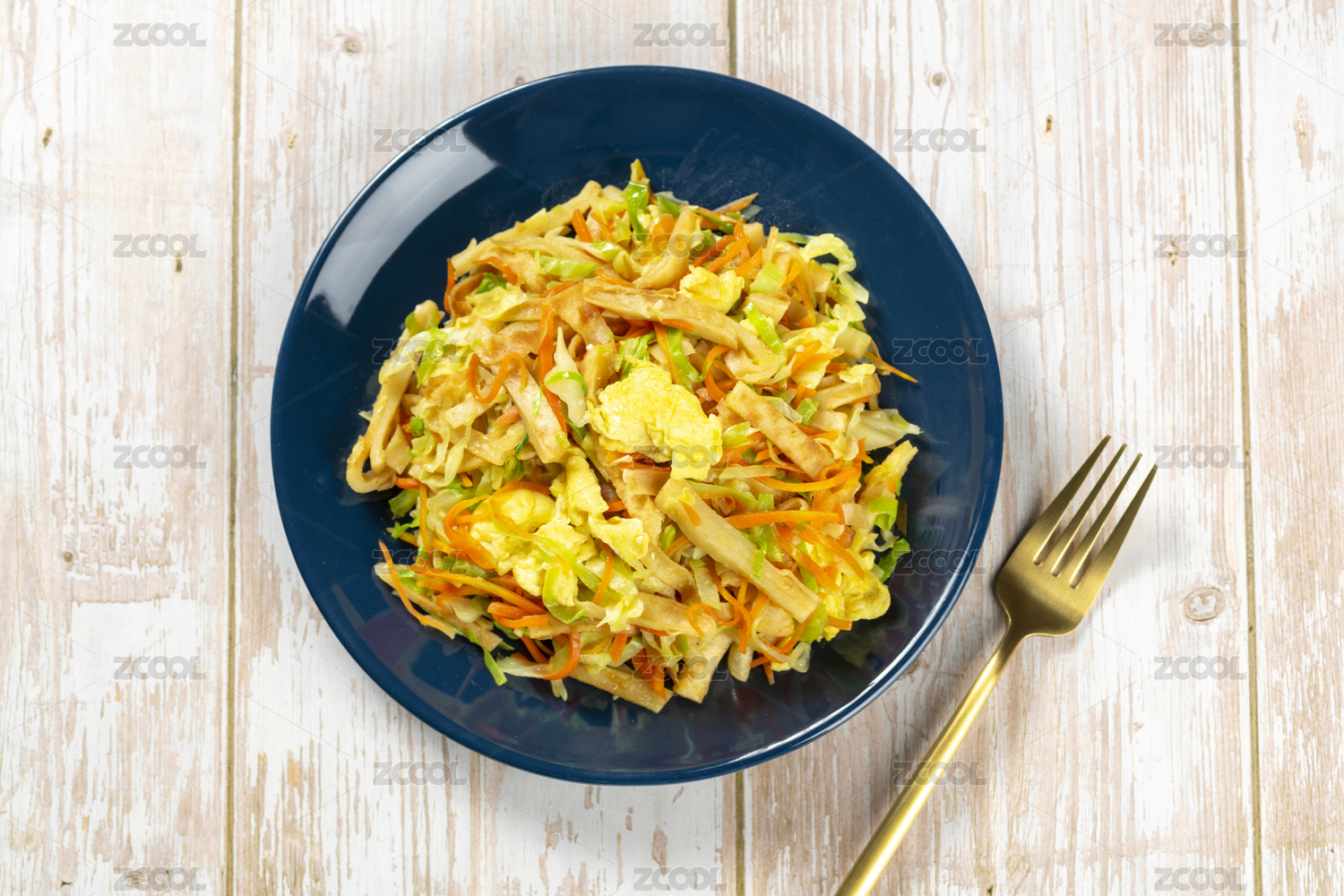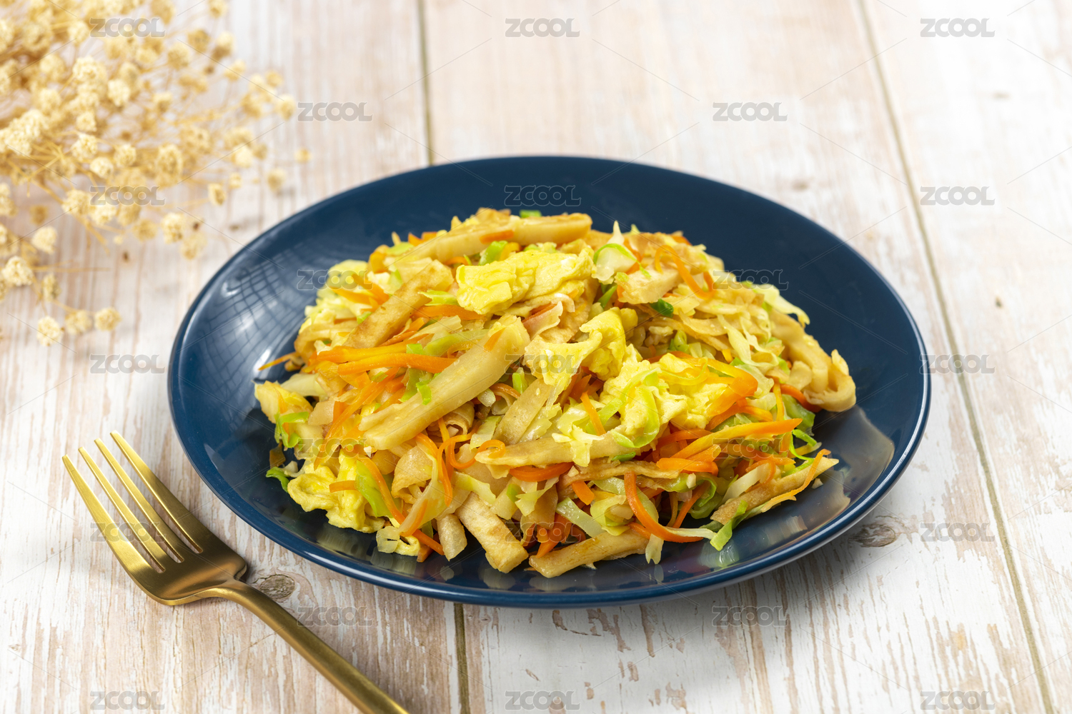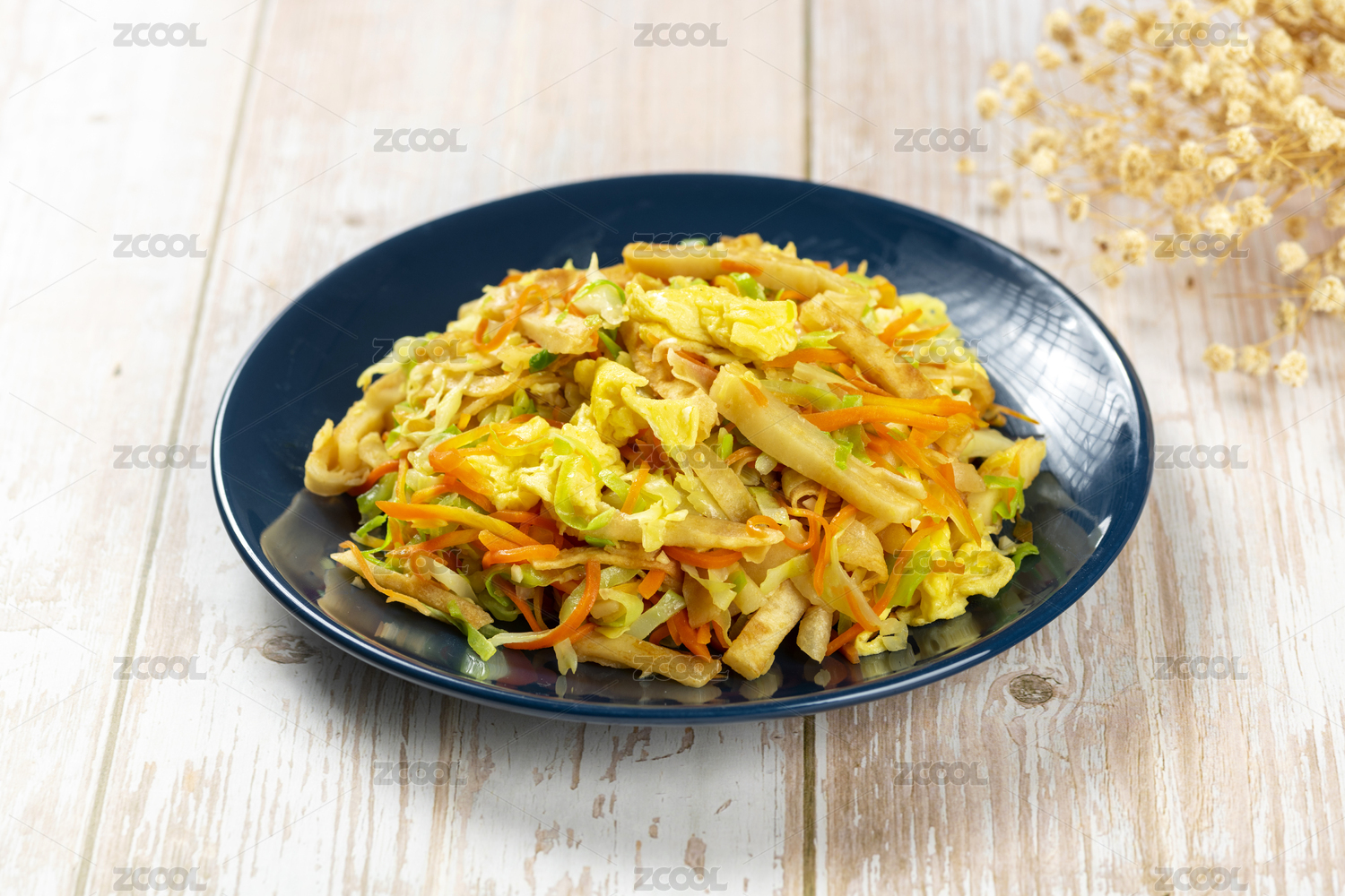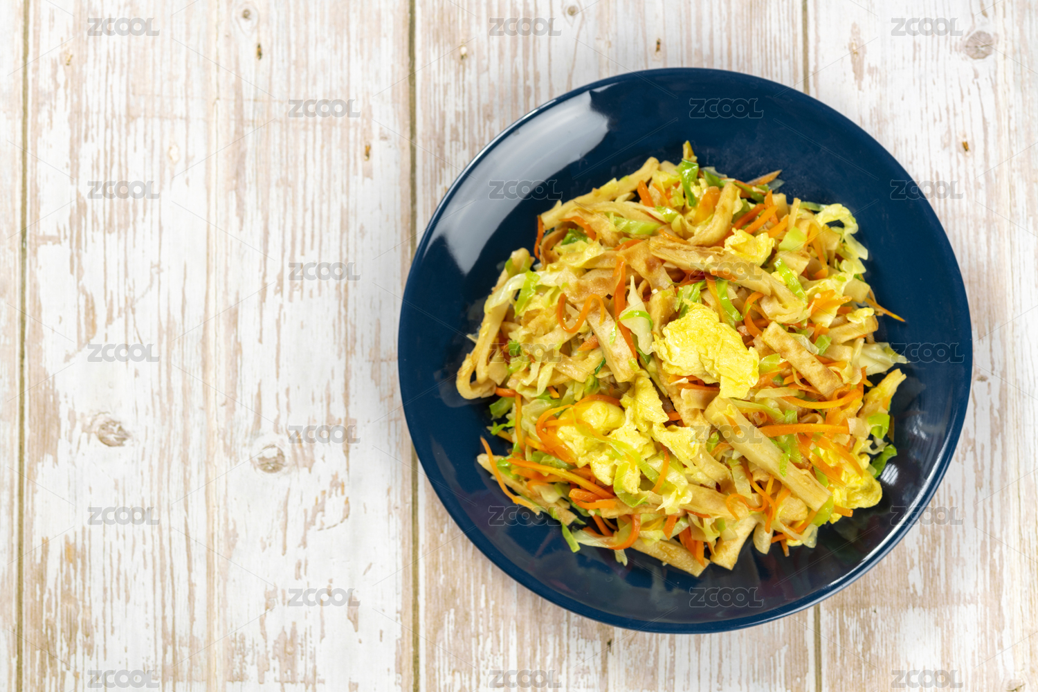 一盤雞蛋炒餅素炒餅擺放在木桌面上