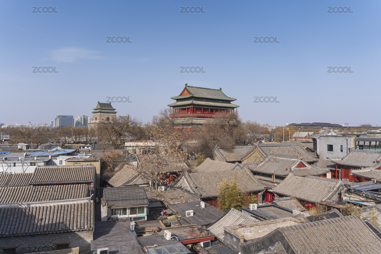 晴朗藍天下北京鐘鼓樓與胡同的景觀