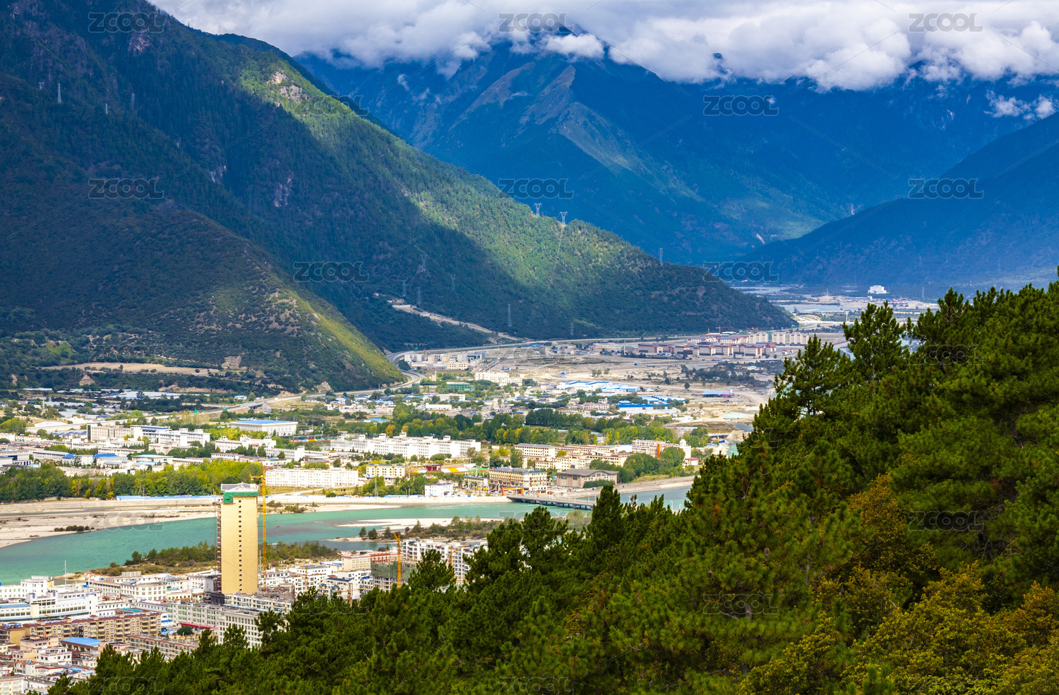 中國西藏比日神山觀尼洋河谷的林芝市全景