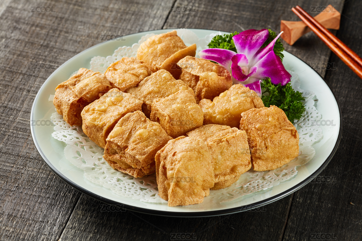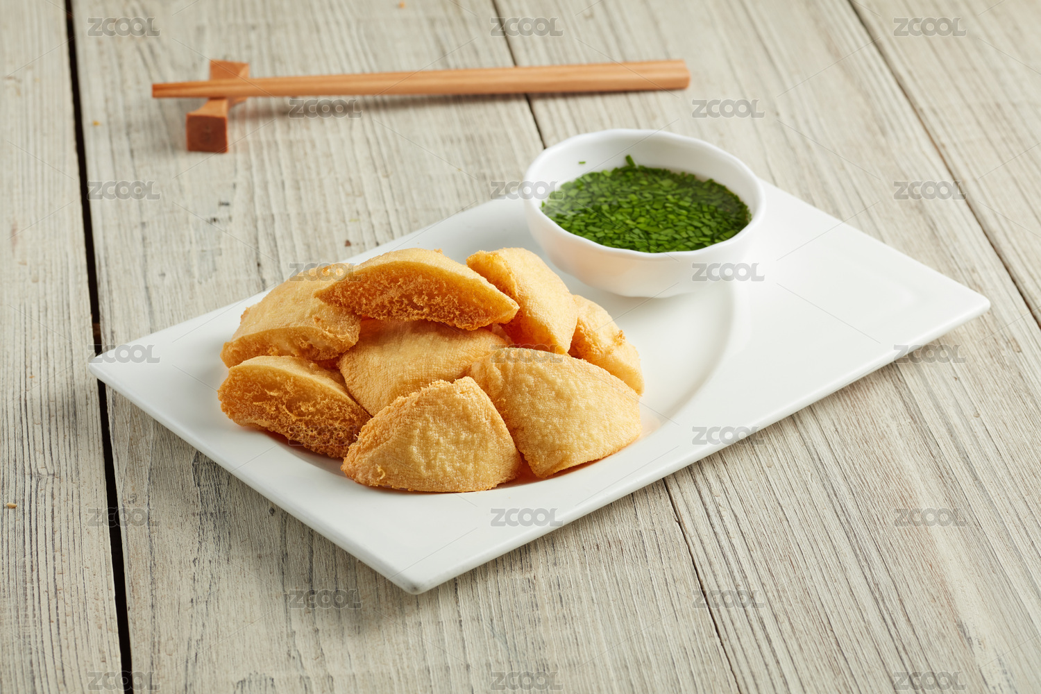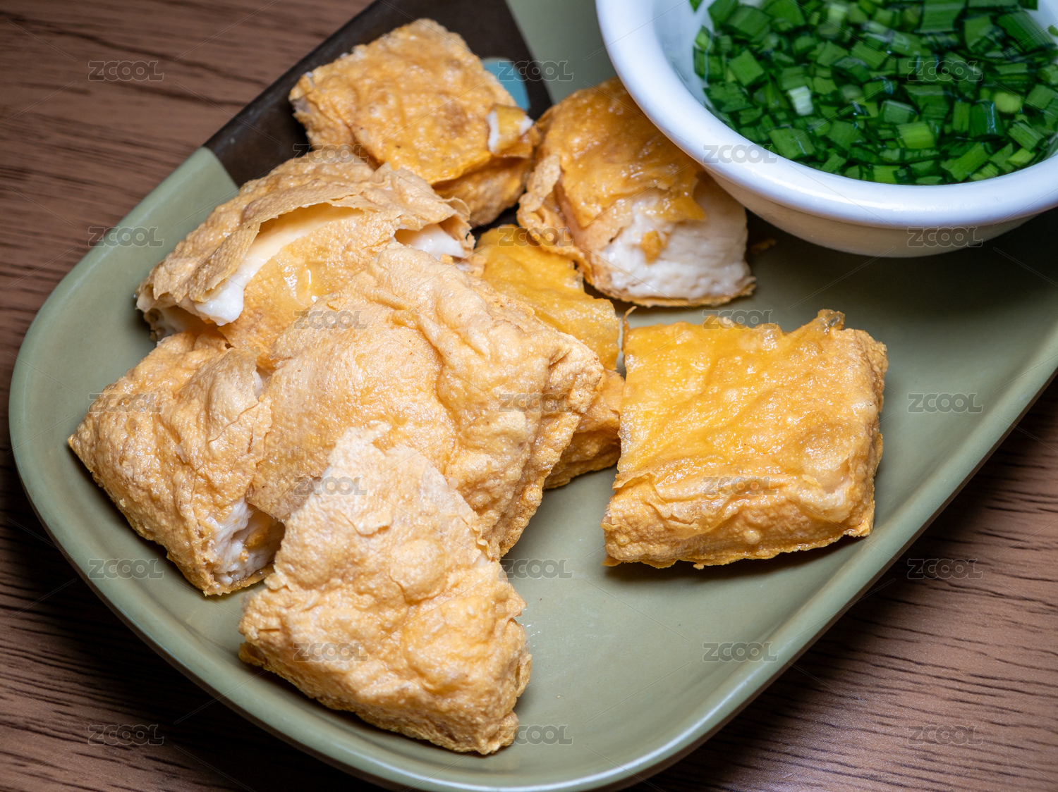 餐盤里的普寧炸豆腐和韭菜鹽水