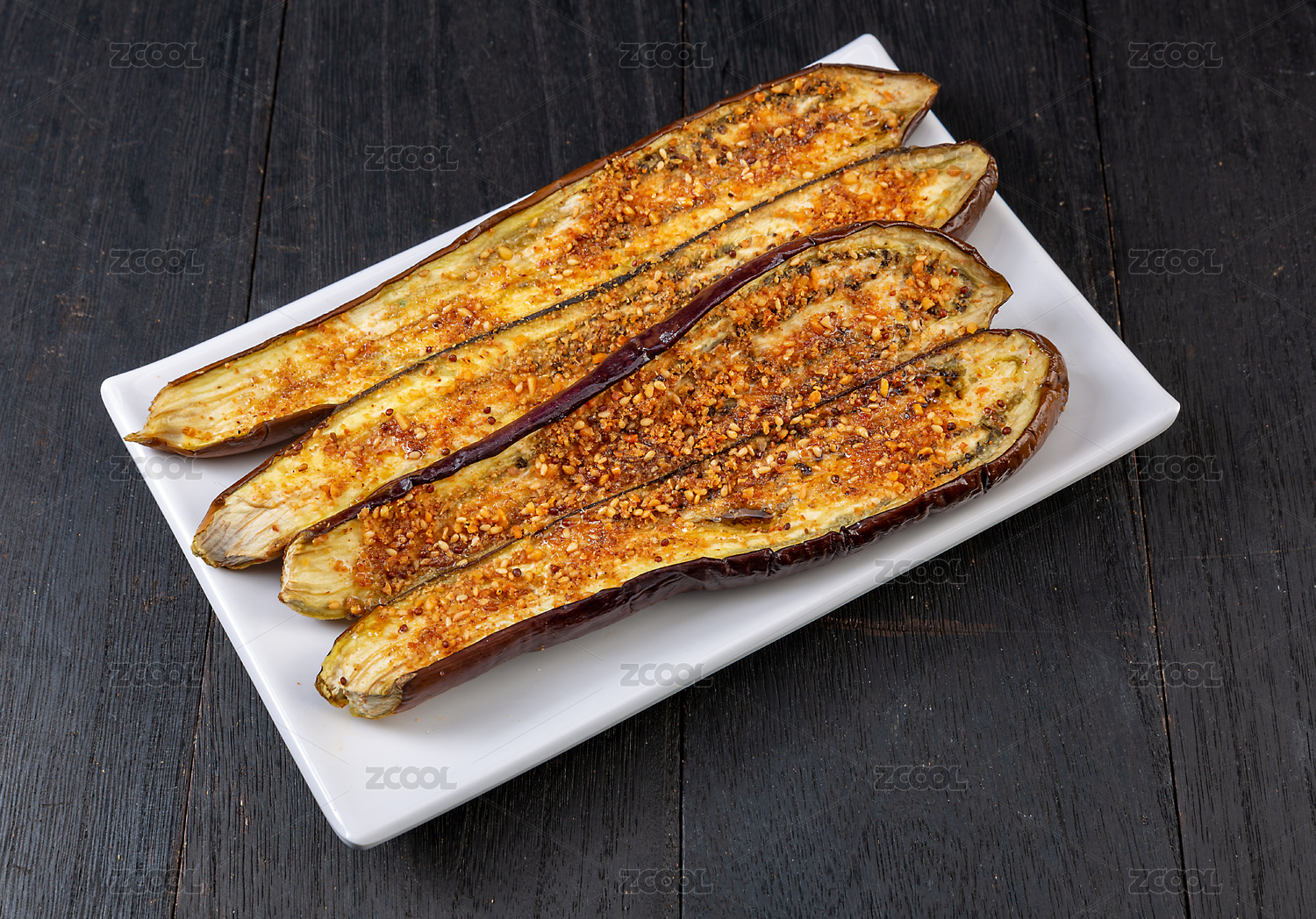 黑底上白盤子里的烤茄子