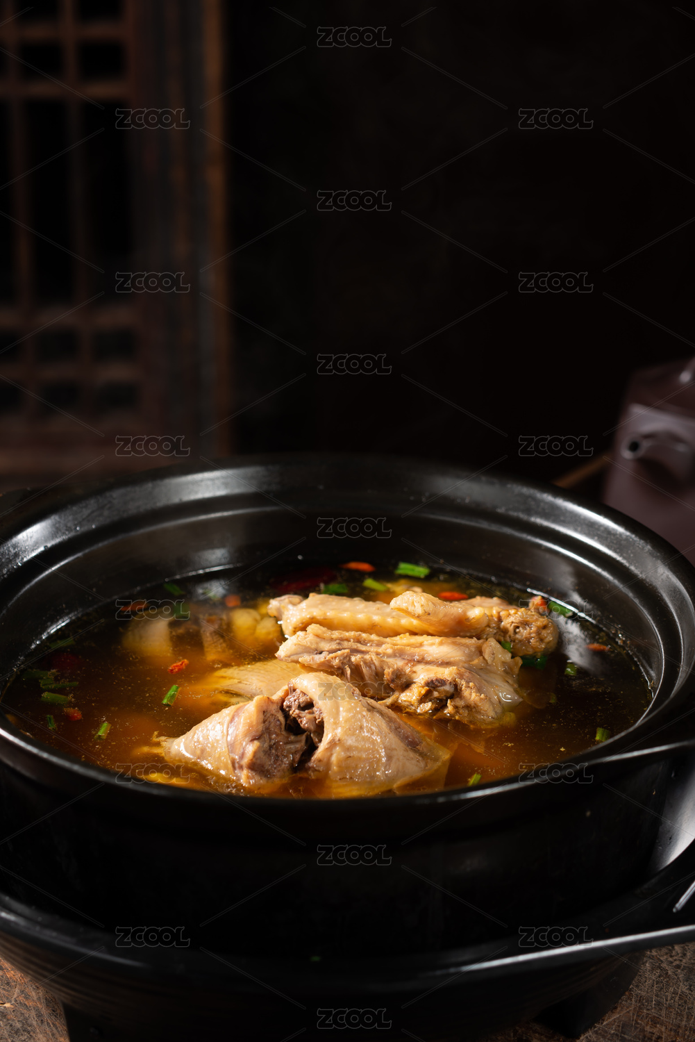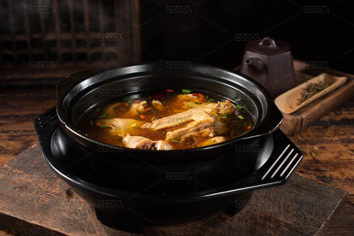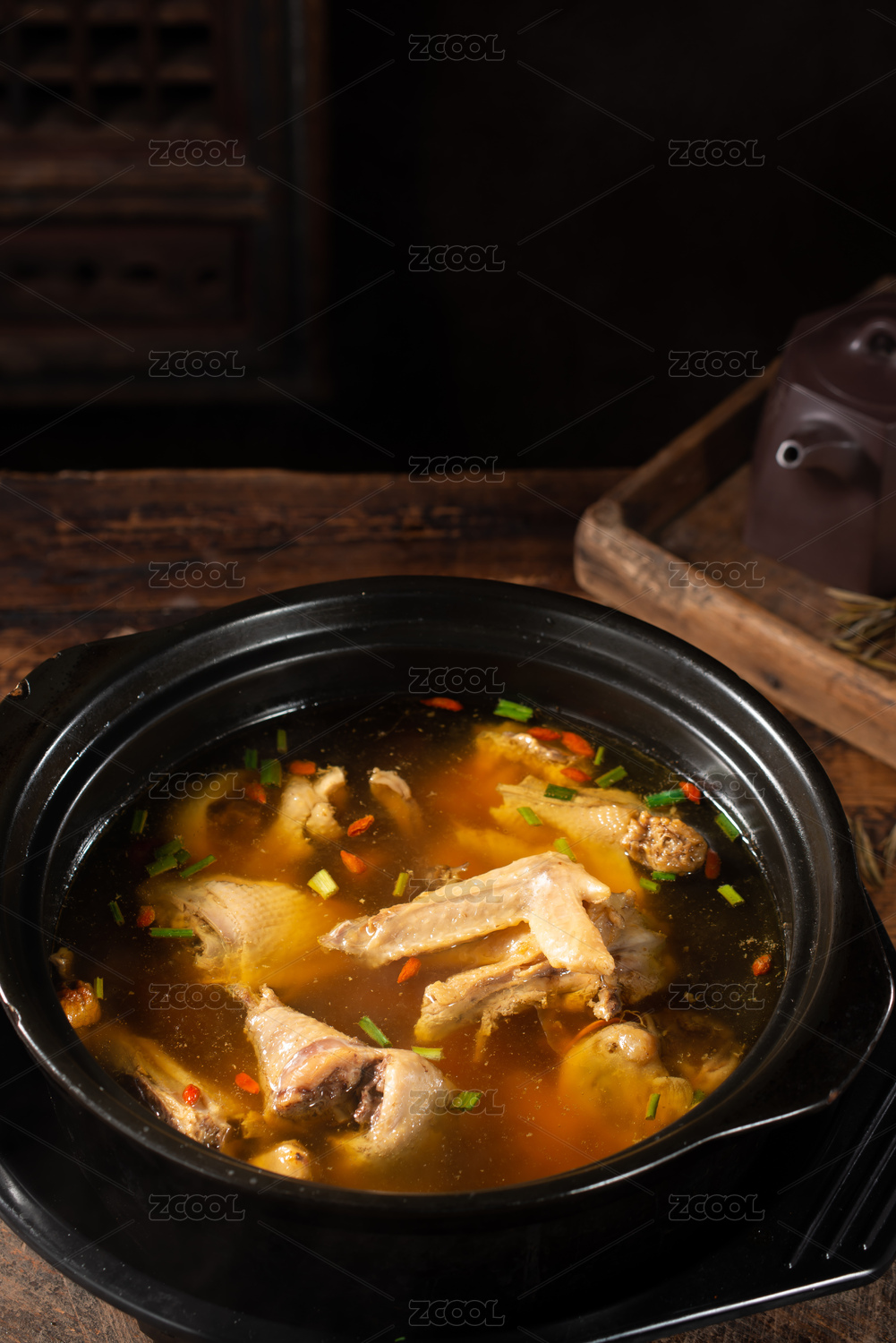砂鍋燉人參枸杞當(dāng)歸土雞湯放在桌面上