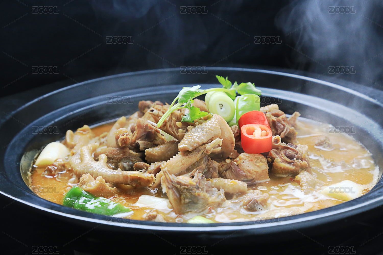 黑色背景上黑色砂鍋里的土雞火鍋