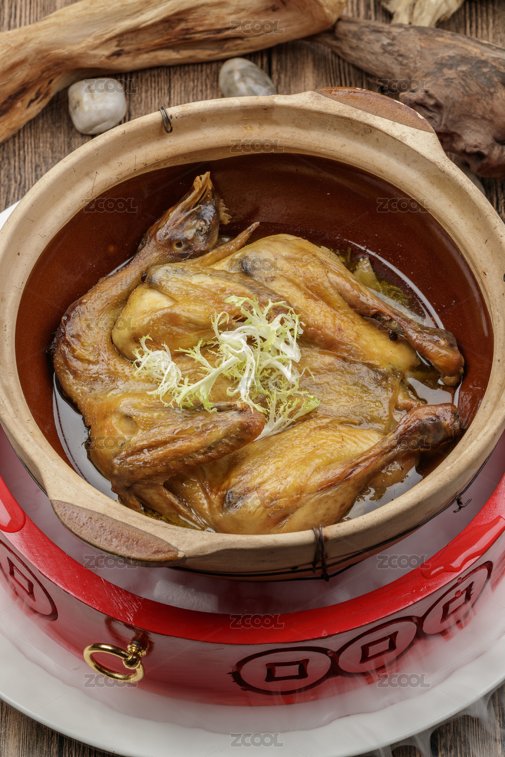 放在木質(zhì)桌子上的藥膳燉雞湯