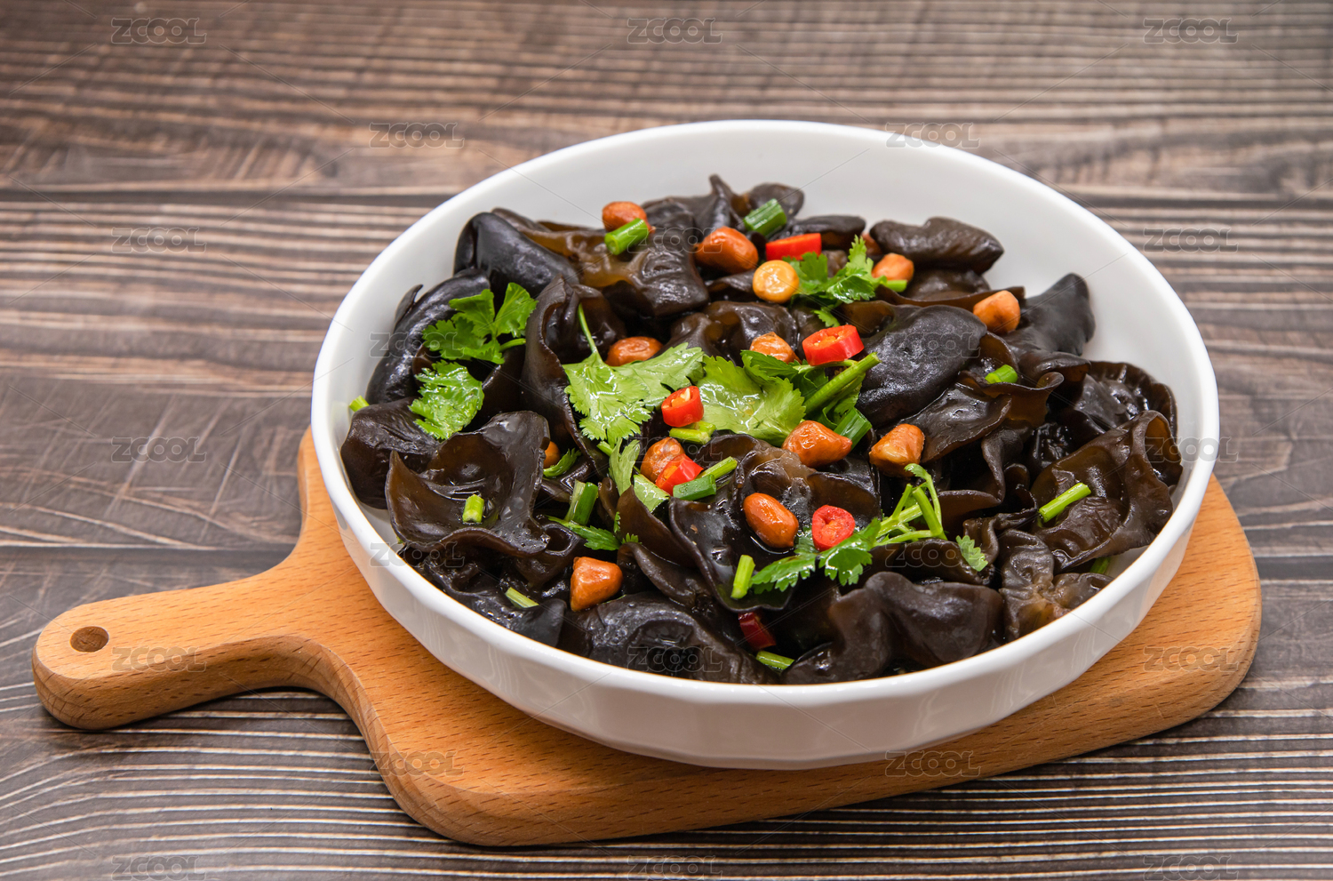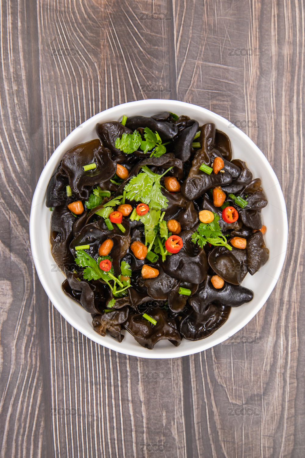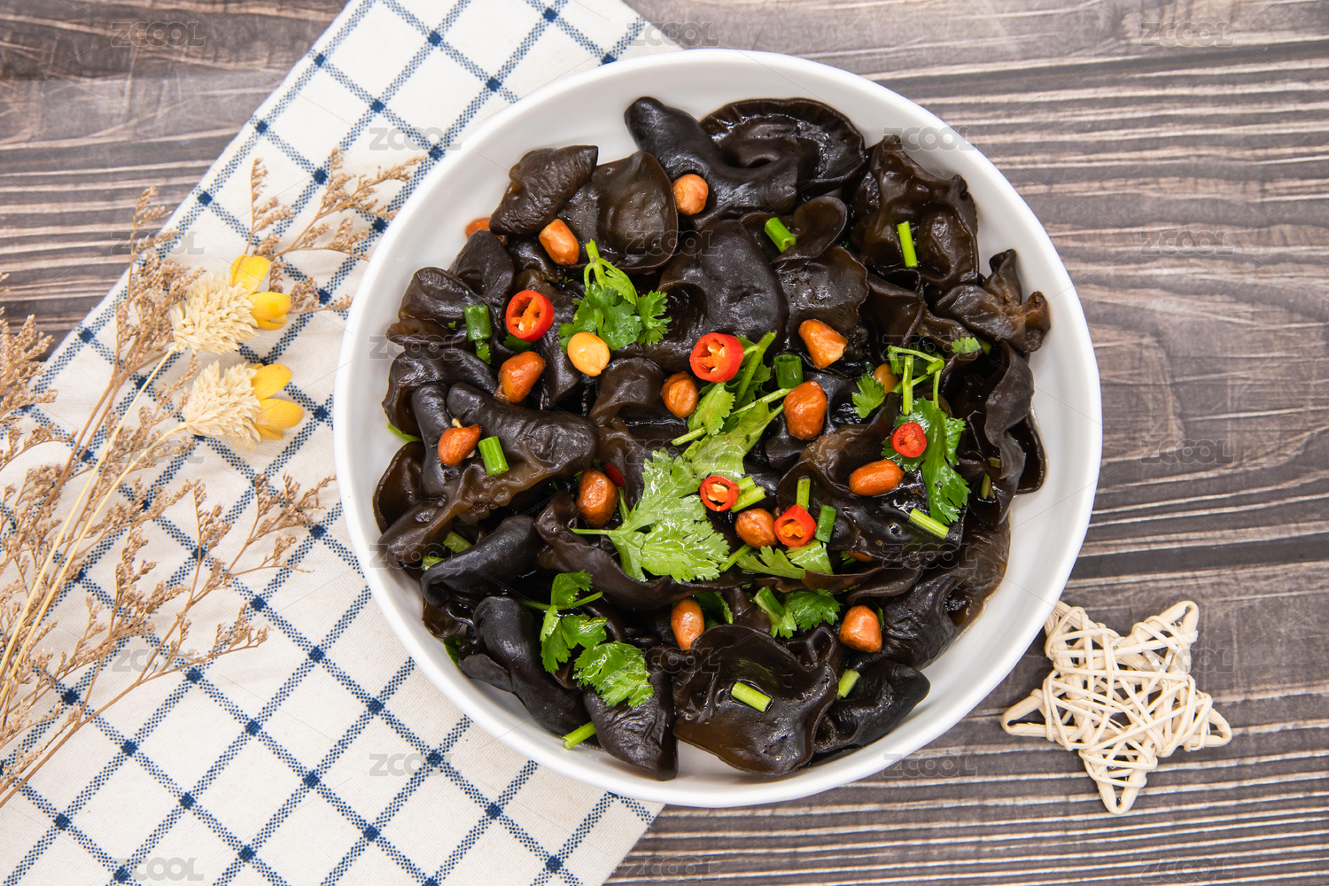木桌背景一盤涼拌黑木耳
