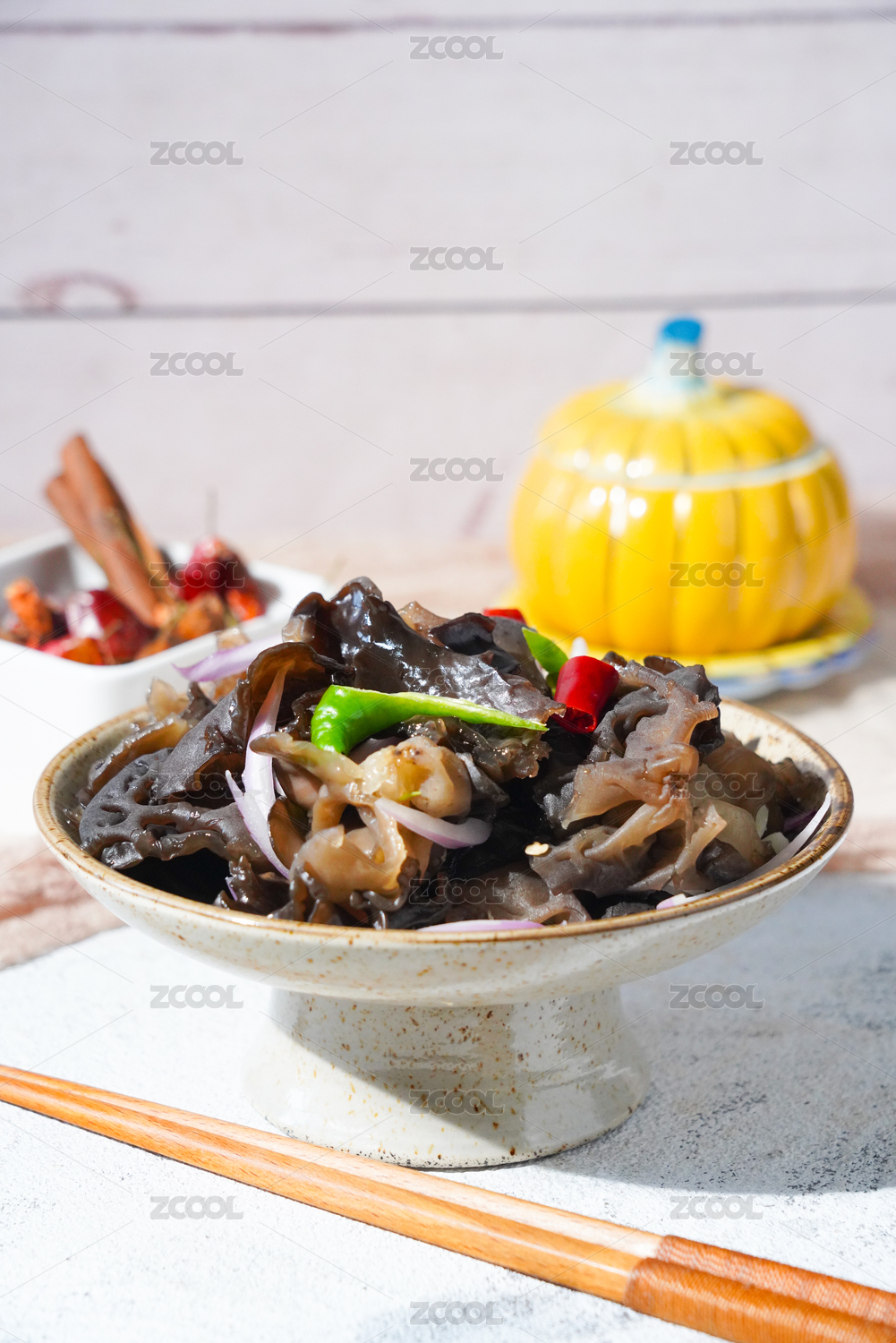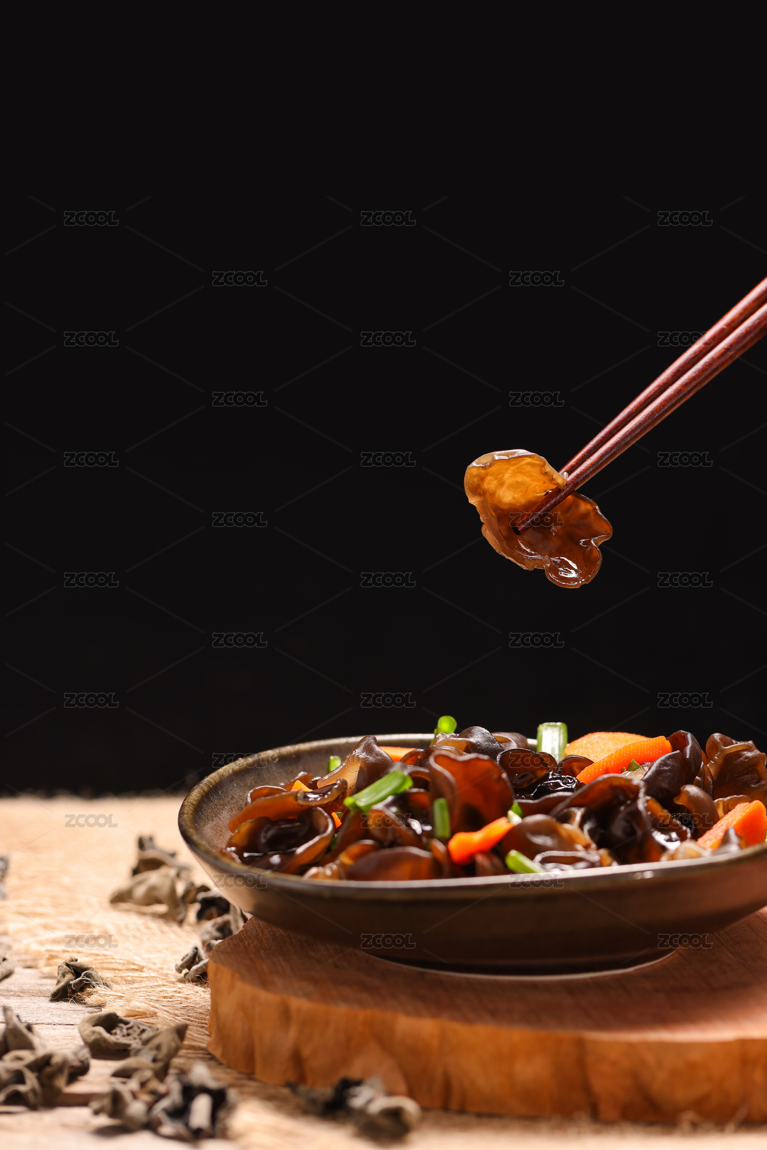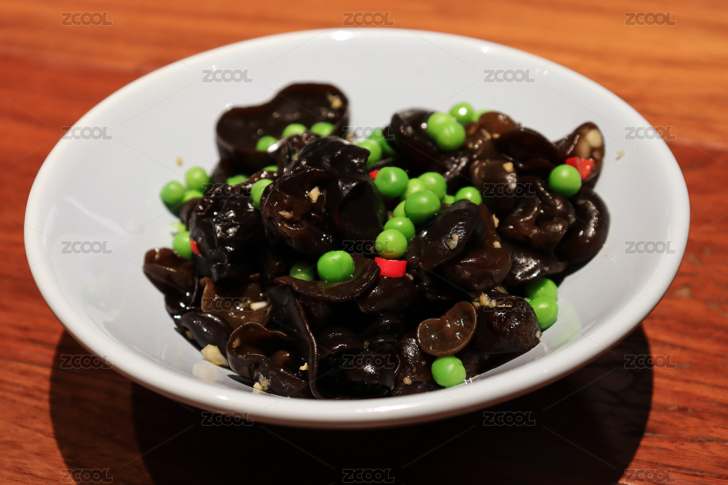 木桌背景一盤涼拌黑木耳